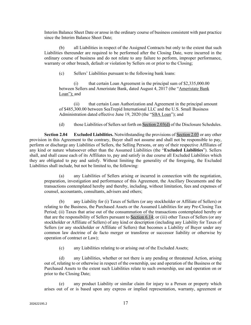 202622195.2 17 Interim Balance Sheet Date or arose in the ordinary course of business consistent with past practice since the Interim Balance Sheet Date; (b) all Liabilities in respect of the Assigned Contracts but only to the extent that such Liabilities thereunder are required to be performed after the Closing Date, were incurred in the ordinary course of business and do not relate to any failure to perform, improper performance, warranty or other breach, default or violation by Sellers on or prior to the Closing; (c) Sellers’ Liabilities pursuant to the following bank loans: (i) that certain Loan Agreement in the principal sum of $2,335,000.00 between Sellers and Ameristate Bank, dated August 4, 2017 (the “Ameristate Bank Loan”); and (ii) that certain Loan Authorization and Agreement in the principal amount of $485,300.00 between SeaTrepid International LLC and the U.S. Small Business Administration dated effective June 19, 2020 (the “SBA Loan”); and (d) those Liabilities of Sellers set forth on Section 2.03(d) of the Disclosure Schedules. Section 2.04 Excluded Liabilities. Notwithstanding the provisions of Section 2.03 or any other provision in this Agreement to the contrary, Buyer shall not assume and shall not be responsible to pay, perform or discharge any Liabilities of Sellers, the Selling Persons, or any of their respective Affiliates of any kind or nature whatsoever other than the Assumed Liabilities (the “Excluded Liabilities”). Sellers shall, and shall cause each of its Affiliates to, pay and satisfy in due course all Excluded Liabilities which they are obligated to pay and satisfy. Without limiting the generality of the foregoing, the Excluded Liabilities shall include, but not be limited to, the following: (a) any Liabilities of Sellers arising or incurred in connection with the negotiation, preparation, investigation and performance of this Agreement, the Ancillary Documents and the transactions contemplated hereby and thereby, including, without limitation, fees and expenses of counsel, accountants, consultants, advisers and others; (b) any Liability for (i) Taxes of Sellers (or any stockholder or Affiliate of Sellers) or relating to the Business, the Purchased Assets or the Assumed Liabilities for any Pre-Closing Tax Period; (ii) Taxes that arise out of the consummation of the transactions contemplated hereby or that are the responsibility of Sellers pursuant to Section 6.14; or (iii) other Taxes of Sellers (or any stockholder or Affiliate of Sellers) of any kind or description (including any Liability for Taxes of Sellers (or any stockholder or Affiliate of Sellers) that becomes a Liability of Buyer under any common law doctrine of de facto merger or transferee or successor liability or otherwise by operation of contract or Law); (c) any Liabilities relating to or arising out of the Excluded Assets; (d) any Liabilities, whether or not there is any pending or threatened Action, arising out of, relating to or otherwise in respect of the ownership, use and operation of the Business or the Purchased Assets to the extent such Liabilities relate to such ownership, use and operation on or prior to the Closing Date; (e) any product Liability or similar claim for injury to a Person or property which arises out of or is based upon any express or implied representation, warranty, agreement or