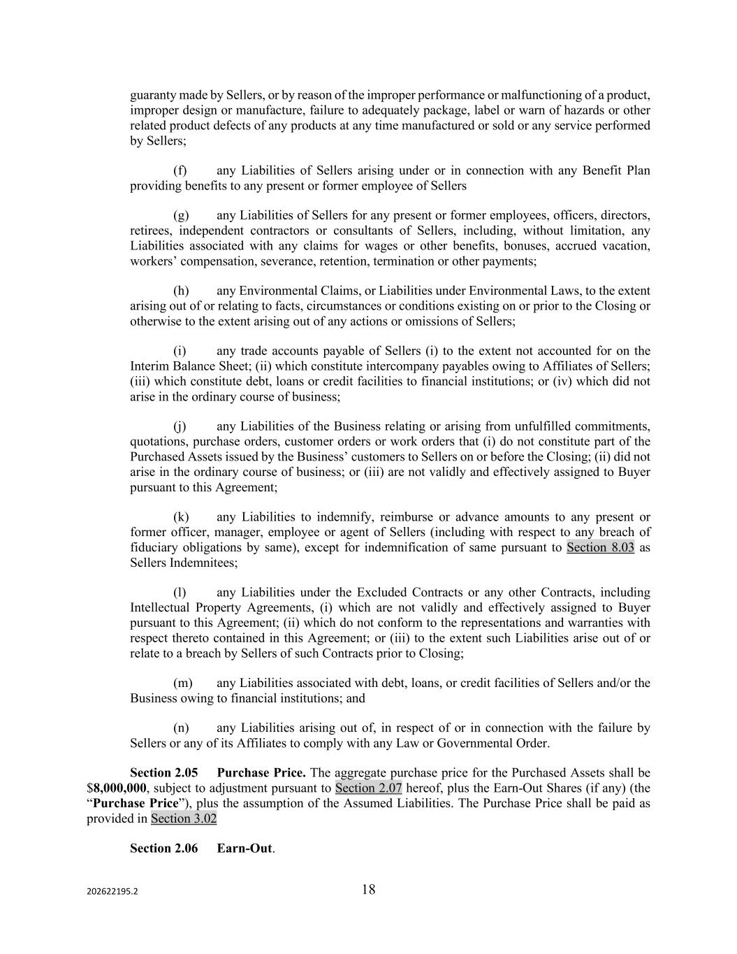 202622195.2 18 guaranty made by Sellers, or by reason of the improper performance or malfunctioning of a product, improper design or manufacture, failure to adequately package, label or warn of hazards or other related product defects of any products at any time manufactured or sold or any service performed by Sellers; (f) any Liabilities of Sellers arising under or in connection with any Benefit Plan providing benefits to any present or former employee of Sellers (g) any Liabilities of Sellers for any present or former employees, officers, directors, retirees, independent contractors or consultants of Sellers, including, without limitation, any Liabilities associated with any claims for wages or other benefits, bonuses, accrued vacation, workers’ compensation, severance, retention, termination or other payments; (h) any Environmental Claims, or Liabilities under Environmental Laws, to the extent arising out of or relating to facts, circumstances or conditions existing on or prior to the Closing or otherwise to the extent arising out of any actions or omissions of Sellers; (i) any trade accounts payable of Sellers (i) to the extent not accounted for on the Interim Balance Sheet; (ii) which constitute intercompany payables owing to Affiliates of Sellers; (iii) which constitute debt, loans or credit facilities to financial institutions; or (iv) which did not arise in the ordinary course of business; (j) any Liabilities of the Business relating or arising from unfulfilled commitments, quotations, purchase orders, customer orders or work orders that (i) do not constitute part of the Purchased Assets issued by the Business’ customers to Sellers on or before the Closing; (ii) did not arise in the ordinary course of business; or (iii) are not validly and effectively assigned to Buyer pursuant to this Agreement; (k) any Liabilities to indemnify, reimburse or advance amounts to any present or former officer, manager, employee or agent of Sellers (including with respect to any breach of fiduciary obligations by same), except for indemnification of same pursuant to Section 8.03 as Sellers Indemnitees; (l) any Liabilities under the Excluded Contracts or any other Contracts, including Intellectual Property Agreements, (i) which are not validly and effectively assigned to Buyer pursuant to this Agreement; (ii) which do not conform to the representations and warranties with respect thereto contained in this Agreement; or (iii) to the extent such Liabilities arise out of or relate to a breach by Sellers of such Contracts prior to Closing; (m) any Liabilities associated with debt, loans, or credit facilities of Sellers and/or the Business owing to financial institutions; and (n) any Liabilities arising out of, in respect of or in connection with the failure by Sellers or any of its Affiliates to comply with any Law or Governmental Order. Section 2.05 Purchase Price. The aggregate purchase price for the Purchased Assets shall be $8,000,000, subject to adjustment pursuant to Section 2.07 hereof, plus the Earn-Out Shares (if any) (the “Purchase Price”), plus the assumption of the Assumed Liabilities. The Purchase Price shall be paid as provided in Section 3.02 Section 2.06 Earn-Out.