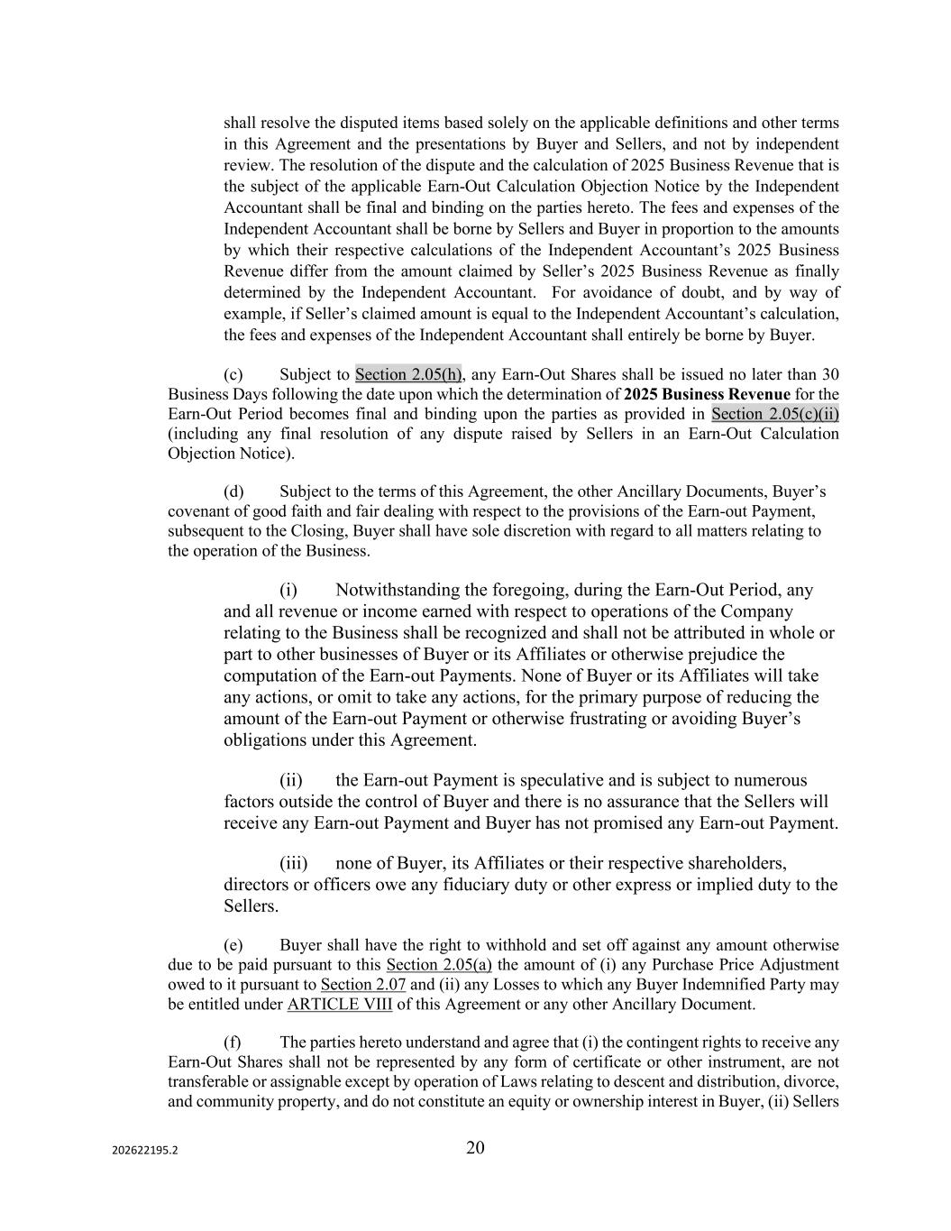 202622195.2 20 shall resolve the disputed items based solely on the applicable definitions and other terms in this Agreement and the presentations by Buyer and Sellers, and not by independent review. The resolution of the dispute and the calculation of 2025 Business Revenue that is the subject of the applicable Earn-Out Calculation Objection Notice by the Independent Accountant shall be final and binding on the parties hereto. The fees and expenses of the Independent Accountant shall be borne by Sellers and Buyer in proportion to the amounts by which their respective calculations of the Independent Accountant’s 2025 Business Revenue differ from the amount claimed by Seller’s 2025 Business Revenue as finally determined by the Independent Accountant. For avoidance of doubt, and by way of example, if Seller’s claimed amount is equal to the Independent Accountant’s calculation, the fees and expenses of the Independent Accountant shall entirely be borne by Buyer. (c) Subject to Section 2.05(h), any Earn-Out Shares shall be issued no later than 30 Business Days following the date upon which the determination of 2025 Business Revenue for the Earn-Out Period becomes final and binding upon the parties as provided in Section 2.05(c)(ii) (including any final resolution of any dispute raised by Sellers in an Earn-Out Calculation Objection Notice). (d) Subject to the terms of this Agreement, the other Ancillary Documents, Buyer’s covenant of good faith and fair dealing with respect to the provisions of the Earn-out Payment, subsequent to the Closing, Buyer shall have sole discretion with regard to all matters relating to the operation of the Business. (i) Notwithstanding the foregoing, during the Earn-Out Period, any and all revenue or income earned with respect to operations of the Company relating to the Business shall be recognized and shall not be attributed in whole or part to other businesses of Buyer or its Affiliates or otherwise prejudice the computation of the Earn-out Payments. None of Buyer or its Affiliates will take any actions, or omit to take any actions, for the primary purpose of reducing the amount of the Earn-out Payment or otherwise frustrating or avoiding Buyer’s obligations under this Agreement. (ii) the Earn-out Payment is speculative and is subject to numerous factors outside the control of Buyer and there is no assurance that the Sellers will receive any Earn-out Payment and Buyer has not promised any Earn-out Payment. (iii) none of Buyer, its Affiliates or their respective shareholders, directors or officers owe any fiduciary duty or other express or implied duty to the Sellers. (e) Buyer shall have the right to withhold and set off against any amount otherwise due to be paid pursuant to this Section 2.05(a) the amount of (i) any Purchase Price Adjustment owed to it pursuant to Section 2.07 and (ii) any Losses to which any Buyer Indemnified Party may be entitled under ARTICLE VIII of this Agreement or any other Ancillary Document. (f) The parties hereto understand and agree that (i) the contingent rights to receive any Earn-Out Shares shall not be represented by any form of certificate or other instrument, are not transferable or assignable except by operation of Laws relating to descent and distribution, divorce, and community property, and do not constitute an equity or ownership interest in Buyer, (ii) Sellers