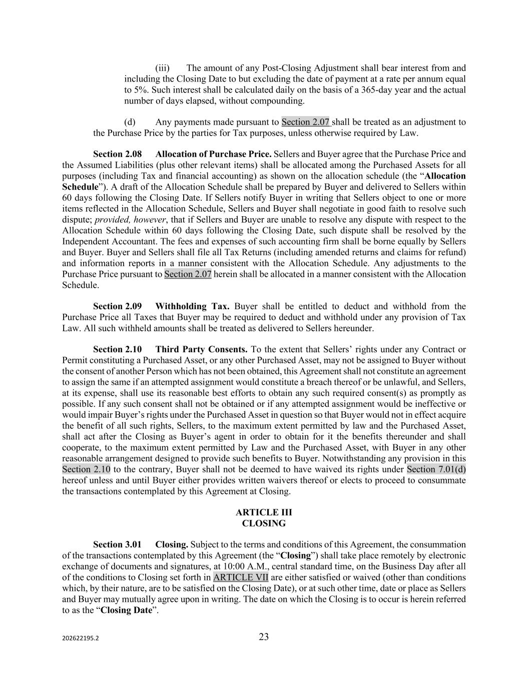 202622195.2 23 (iii) The amount of any Post-Closing Adjustment shall bear interest from and including the Closing Date to but excluding the date of payment at a rate per annum equal to 5%. Such interest shall be calculated daily on the basis of a 365-day year and the actual number of days elapsed, without compounding. (d) Any payments made pursuant to Section 2.07 shall be treated as an adjustment to the Purchase Price by the parties for Tax purposes, unless otherwise required by Law. Section 2.08 Allocation of Purchase Price. Sellers and Buyer agree that the Purchase Price and the Assumed Liabilities (plus other relevant items) shall be allocated among the Purchased Assets for all purposes (including Tax and financial accounting) as shown on the allocation schedule (the “Allocation Schedule”). A draft of the Allocation Schedule shall be prepared by Buyer and delivered to Sellers within 60 days following the Closing Date. If Sellers notify Buyer in writing that Sellers object to one or more items reflected in the Allocation Schedule, Sellers and Buyer shall negotiate in good faith to resolve such dispute; provided, however, that if Sellers and Buyer are unable to resolve any dispute with respect to the Allocation Schedule within 60 days following the Closing Date, such dispute shall be resolved by the Independent Accountant. The fees and expenses of such accounting firm shall be borne equally by Sellers and Buyer. Buyer and Sellers shall file all Tax Returns (including amended returns and claims for refund) and information reports in a manner consistent with the Allocation Schedule. Any adjustments to the Purchase Price pursuant to Section 2.07 herein shall be allocated in a manner consistent with the Allocation Schedule. Section 2.09 Withholding Tax. Buyer shall be entitled to deduct and withhold from the Purchase Price all Taxes that Buyer may be required to deduct and withhold under any provision of Tax Law. All such withheld amounts shall be treated as delivered to Sellers hereunder. Section 2.10 Third Party Consents. To the extent that Sellers’ rights under any Contract or Permit constituting a Purchased Asset, or any other Purchased Asset, may not be assigned to Buyer without the consent of another Person which has not been obtained, this Agreement shall not constitute an agreement to assign the same if an attempted assignment would constitute a breach thereof or be unlawful, and Sellers, at its expense, shall use its reasonable best efforts to obtain any such required consent(s) as promptly as possible. If any such consent shall not be obtained or if any attempted assignment would be ineffective or would impair Buyer’s rights under the Purchased Asset in question so that Buyer would not in effect acquire the benefit of all such rights, Sellers, to the maximum extent permitted by law and the Purchased Asset, shall act after the Closing as Buyer’s agent in order to obtain for it the benefits thereunder and shall cooperate, to the maximum extent permitted by Law and the Purchased Asset, with Buyer in any other reasonable arrangement designed to provide such benefits to Buyer. Notwithstanding any provision in this Section 2.10 to the contrary, Buyer shall not be deemed to have waived its rights under Section 7.01(d) hereof unless and until Buyer either provides written waivers thereof or elects to proceed to consummate the transactions contemplated by this Agreement at Closing. ARTICLE III CLOSING Section 3.01 Closing. Subject to the terms and conditions of this Agreement, the consummation of the transactions contemplated by this Agreement (the “Closing”) shall take place remotely by electronic exchange of documents and signatures, at 10:00 A.M., central standard time, on the Business Day after all of the conditions to Closing set forth in ARTICLE VII are either satisfied or waived (other than conditions which, by their nature, are to be satisfied on the Closing Date), or at such other time, date or place as Sellers and Buyer may mutually agree upon in writing. The date on which the Closing is to occur is herein referred to as the “Closing Date”.