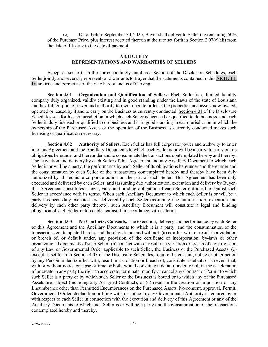 202622195.2 25 (c) On or before September 30, 2025, Buyer shall deliver to Seller the remaining 50% of the Purchase Price, plus interest accrued thereon at the rate set forth in Section 2.07(c)(iii) from the date of Closing to the date of payment. ARTICLE IV REPRESENTATIONS AND WARRANTIES OF SELLERS Except as set forth in the correspondingly numbered Section of the Disclosure Schedules, each Seller jointly and severally represents and warrants to Buyer that the statements contained in this ARTICLE IV are true and correct as of the date hereof and as of Closing. Section 4.01 Organization and Qualification of Sellers. Each Seller is a limited liability company duly organized, validly existing and in good standing under the Laws of the state of Louisiana and has full corporate power and authority to own, operate or lease the properties and assets now owned, operated or leased by it and to carry on the Business as currently conducted. Section 4.01 of the Disclosure Schedules sets forth each jurisdiction in which each Seller is licensed or qualified to do business, and each Seller is duly licensed or qualified to do business and is in good standing in each jurisdiction in which the ownership of the Purchased Assets or the operation of the Business as currently conducted makes such licensing or qualification necessary. Section 4.02 Authority of Sellers. Each Seller has full corporate power and authority to enter into this Agreement and the Ancillary Documents to which each Seller is or will be a party, to carry out its obligations hereunder and thereunder and to consummate the transactions contemplated hereby and thereby. The execution and delivery by each Seller of this Agreement and any Ancillary Document to which each Seller is or will be a party, the performance by each Seller of its obligations hereunder and thereunder and the consummation by each Seller of the transactions contemplated hereby and thereby have been duly authorized by all requisite corporate action on the part of such Seller. This Agreement has been duly executed and delivered by each Seller, and (assuming due authorization, execution and delivery by Buyer) this Agreement constitutes a legal, valid and binding obligation of each Seller enforceable against such Seller in accordance with its terms. When each Ancillary Document to which each Seller is or will be a party has been duly executed and delivered by such Seller (assuming due authorization, execution and delivery by each other party thereto), such Ancillary Document will constitute a legal and binding obligation of such Seller enforceable against it in accordance with its terms. Section 4.03 No Conflicts; Consents. The execution, delivery and performance by each Seller of this Agreement and the Ancillary Documents to which it is a party, and the consummation of the transactions contemplated hereby and thereby, do not and will not: (a) conflict with or result in a violation or breach of, or default under, any provision of the certificate of incorporation, by-laws or other organizational documents of such Seller; (b) conflict with or result in a violation or breach of any provision of any Law or Governmental Order applicable to such Seller, the Business or the Purchased Assets; (c) except as set forth in Section 4.03 of the Disclosure Schedules, require the consent, notice or other action by any Person under, conflict with, result in a violation or breach of, constitute a default or an event that, with or without notice or lapse of time or both, would constitute a default under, result in the acceleration of or create in any party the right to accelerate, terminate, modify or cancel any Contract or Permit to which such Seller is a party or by which such Seller or the Business is bound or to which any of the Purchased Assets are subject (including any Assigned Contract); or (d) result in the creation or imposition of any Encumbrance other than Permitted Encumbrances on the Purchased Assets. No consent, approval, Permit, Governmental Order, declaration or filing with, or notice to, any Governmental Authority is required by or with respect to each Seller in connection with the execution and delivery of this Agreement or any of the Ancillary Documents to which such Seller is or will be a party and the consummation of the transactions contemplated hereby and thereby.