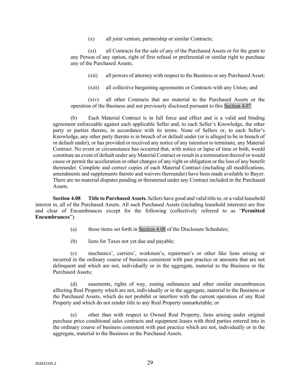 202622195.2 29 (x) all joint venture, partnership or similar Contracts; (xi) all Contracts for the sale of any of the Purchased Assets or for the grant to any Person of any option, right of first refusal or preferential or similar right to purchase any of the Purchased Assets; (xii) all powers of attorney with respect to the Business or any Purchased Asset; (xiii) all collective bargaining agreements or Contracts with any Union; and (xiv) all other Contracts that are material to the Purchased Assets or the operation of the Business and not previously disclosed pursuant to this Section 4.07. (b) Each Material Contract is in full force and effect and is a valid and binding agreement enforceable against each applicable Seller and, to each Seller’s Knowledge, the other party or parties thereto, in accordance with its terms. None of Sellers or, to each Seller’s Knowledge, any other party thereto is in breach of or default under (or is alleged to be in breach of or default under), or has provided or received any notice of any intention to terminate, any Material Contract. No event or circumstance has occurred that, with notice or lapse of time or both, would constitute an event of default under any Material Contract or result in a termination thereof or would cause or permit the acceleration or other changes of any right or obligation or the loss of any benefit thereunder. Complete and correct copies of each Material Contract (including all modifications, amendments and supplements thereto and waivers thereunder) have been made available to Buyer. There are no material disputes pending or threatened under any Contract included in the Purchased Assets. Section 4.08 Title to Purchased Assets. Sellers have good and valid title to, or a valid leasehold interest in, all of the Purchased Assets. All such Purchased Assets (including leasehold interests) are free and clear of Encumbrances except for the following (collectively referred to as “Permitted Encumbrances”): (a) those items set forth in Section 4.08 of the Disclosure Schedules; (b) liens for Taxes not yet due and payable; (c) mechanics’, carriers’, workmen’s, repairmen’s or other like liens arising or incurred in the ordinary course of business consistent with past practice or amounts that are not delinquent and which are not, individually or in the aggregate, material to the Business or the Purchased Assets; (d) easements, rights of way, zoning ordinances and other similar encumbrances affecting Real Property which are not, individually or in the aggregate, material to the Business or the Purchased Assets, which do not prohibit or interfere with the current operation of any Real Property and which do not render title to any Real Property unmarketable; or (e) other than with respect to Owned Real Property, liens arising under original purchase price conditional sales contracts and equipment leases with third parties entered into in the ordinary course of business consistent with past practice which are not, individually or in the aggregate, material to the Business or the Purchased Assets.