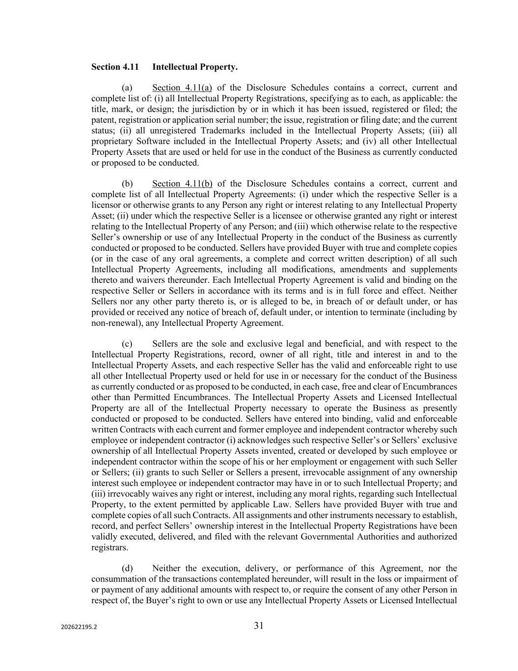 202622195.2 31 Section 4.11 Intellectual Property. (a) Section 4.11(a) of the Disclosure Schedules contains a correct, current and complete list of: (i) all Intellectual Property Registrations, specifying as to each, as applicable: the title, mark, or design; the jurisdiction by or in which it has been issued, registered or filed; the patent, registration or application serial number; the issue, registration or filing date; and the current status; (ii) all unregistered Trademarks included in the Intellectual Property Assets; (iii) all proprietary Software included in the Intellectual Property Assets; and (iv) all other Intellectual Property Assets that are used or held for use in the conduct of the Business as currently conducted or proposed to be conducted. (b) Section 4.11(b) of the Disclosure Schedules contains a correct, current and complete list of all Intellectual Property Agreements: (i) under which the respective Seller is a licensor or otherwise grants to any Person any right or interest relating to any Intellectual Property Asset; (ii) under which the respective Seller is a licensee or otherwise granted any right or interest relating to the Intellectual Property of any Person; and (iii) which otherwise relate to the respective Seller’s ownership or use of any Intellectual Property in the conduct of the Business as currently conducted or proposed to be conducted. Sellers have provided Buyer with true and complete copies (or in the case of any oral agreements, a complete and correct written description) of all such Intellectual Property Agreements, including all modifications, amendments and supplements thereto and waivers thereunder. Each Intellectual Property Agreement is valid and binding on the respective Seller or Sellers in accordance with its terms and is in full force and effect. Neither Sellers nor any other party thereto is, or is alleged to be, in breach of or default under, or has provided or received any notice of breach of, default under, or intention to terminate (including by non-renewal), any Intellectual Property Agreement. (c) Sellers are the sole and exclusive legal and beneficial, and with respect to the Intellectual Property Registrations, record, owner of all right, title and interest in and to the Intellectual Property Assets, and each respective Seller has the valid and enforceable right to use all other Intellectual Property used or held for use in or necessary for the conduct of the Business as currently conducted or as proposed to be conducted, in each case, free and clear of Encumbrances other than Permitted Encumbrances. The Intellectual Property Assets and Licensed Intellectual Property are all of the Intellectual Property necessary to operate the Business as presently conducted or proposed to be conducted. Sellers have entered into binding, valid and enforceable written Contracts with each current and former employee and independent contractor whereby such employee or independent contractor (i) acknowledges such respective Seller’s or Sellers’ exclusive ownership of all Intellectual Property Assets invented, created or developed by such employee or independent contractor within the scope of his or her employment or engagement with such Seller or Sellers; (ii) grants to such Seller or Sellers a present, irrevocable assignment of any ownership interest such employee or independent contractor may have in or to such Intellectual Property; and (iii) irrevocably waives any right or interest, including any moral rights, regarding such Intellectual Property, to the extent permitted by applicable Law. Sellers have provided Buyer with true and complete copies of all such Contracts. All assignments and other instruments necessary to establish, record, and perfect Sellers’ ownership interest in the Intellectual Property Registrations have been validly executed, delivered, and filed with the relevant Governmental Authorities and authorized registrars. (d) Neither the execution, delivery, or performance of this Agreement, nor the consummation of the transactions contemplated hereunder, will result in the loss or impairment of or payment of any additional amounts with respect to, or require the consent of any other Person in respect of, the Buyer’s right to own or use any Intellectual Property Assets or Licensed Intellectual