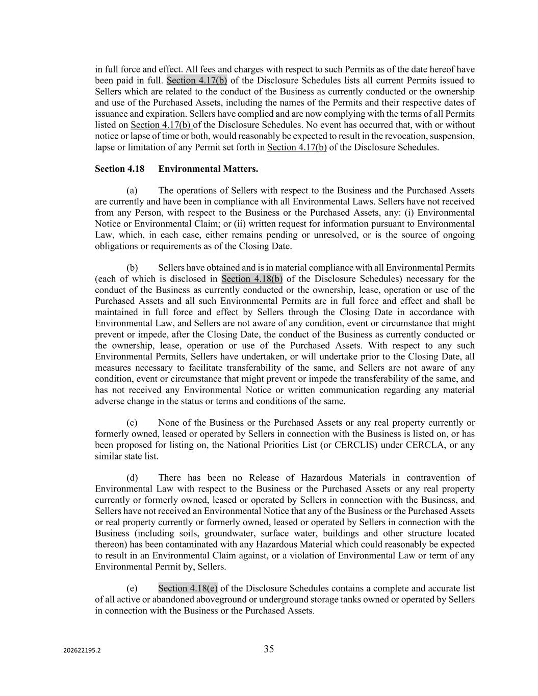 202622195.2 35 in full force and effect. All fees and charges with respect to such Permits as of the date hereof have been paid in full. Section 4.17(b) of the Disclosure Schedules lists all current Permits issued to Sellers which are related to the conduct of the Business as currently conducted or the ownership and use of the Purchased Assets, including the names of the Permits and their respective dates of issuance and expiration. Sellers have complied and are now complying with the terms of all Permits listed on Section 4.17(b) of the Disclosure Schedules. No event has occurred that, with or without notice or lapse of time or both, would reasonably be expected to result in the revocation, suspension, lapse or limitation of any Permit set forth in Section 4.17(b) of the Disclosure Schedules. Section 4.18 Environmental Matters. (a) The operations of Sellers with respect to the Business and the Purchased Assets are currently and have been in compliance with all Environmental Laws. Sellers have not received from any Person, with respect to the Business or the Purchased Assets, any: (i) Environmental Notice or Environmental Claim; or (ii) written request for information pursuant to Environmental Law, which, in each case, either remains pending or unresolved, or is the source of ongoing obligations or requirements as of the Closing Date. (b) Sellers have obtained and is in material compliance with all Environmental Permits (each of which is disclosed in Section 4.18(b) of the Disclosure Schedules) necessary for the conduct of the Business as currently conducted or the ownership, lease, operation or use of the Purchased Assets and all such Environmental Permits are in full force and effect and shall be maintained in full force and effect by Sellers through the Closing Date in accordance with Environmental Law, and Sellers are not aware of any condition, event or circumstance that might prevent or impede, after the Closing Date, the conduct of the Business as currently conducted or the ownership, lease, operation or use of the Purchased Assets. With respect to any such Environmental Permits, Sellers have undertaken, or will undertake prior to the Closing Date, all measures necessary to facilitate transferability of the same, and Sellers are not aware of any condition, event or circumstance that might prevent or impede the transferability of the same, and has not received any Environmental Notice or written communication regarding any material adverse change in the status or terms and conditions of the same. (c) None of the Business or the Purchased Assets or any real property currently or formerly owned, leased or operated by Sellers in connection with the Business is listed on, or has been proposed for listing on, the National Priorities List (or CERCLIS) under CERCLA, or any similar state list. (d) There has been no Release of Hazardous Materials in contravention of Environmental Law with respect to the Business or the Purchased Assets or any real property currently or formerly owned, leased or operated by Sellers in connection with the Business, and Sellers have not received an Environmental Notice that any of the Business or the Purchased Assets or real property currently or formerly owned, leased or operated by Sellers in connection with the Business (including soils, groundwater, surface water, buildings and other structure located thereon) has been contaminated with any Hazardous Material which could reasonably be expected to result in an Environmental Claim against, or a violation of Environmental Law or term of any Environmental Permit by, Sellers. (e) Section 4.18(e) of the Disclosure Schedules contains a complete and accurate list of all active or abandoned aboveground or underground storage tanks owned or operated by Sellers in connection with the Business or the Purchased Assets.