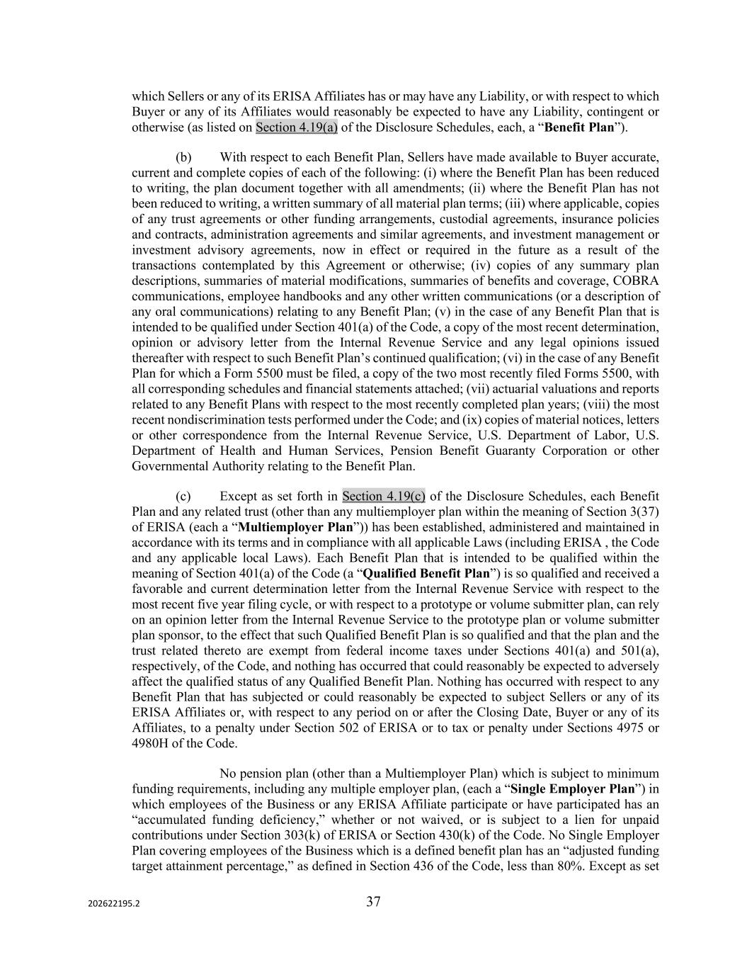 202622195.2 37 which Sellers or any of its ERISA Affiliates has or may have any Liability, or with respect to which Buyer or any of its Affiliates would reasonably be expected to have any Liability, contingent or otherwise (as listed on Section 4.19(a) of the Disclosure Schedules, each, a “Benefit Plan”). (b) With respect to each Benefit Plan, Sellers have made available to Buyer accurate, current and complete copies of each of the following: (i) where the Benefit Plan has been reduced to writing, the plan document together with all amendments; (ii) where the Benefit Plan has not been reduced to writing, a written summary of all material plan terms; (iii) where applicable, copies of any trust agreements or other funding arrangements, custodial agreements, insurance policies and contracts, administration agreements and similar agreements, and investment management or investment advisory agreements, now in effect or required in the future as a result of the transactions contemplated by this Agreement or otherwise; (iv) copies of any summary plan descriptions, summaries of material modifications, summaries of benefits and coverage, COBRA communications, employee handbooks and any other written communications (or a description of any oral communications) relating to any Benefit Plan; (v) in the case of any Benefit Plan that is intended to be qualified under Section 401(a) of the Code, a copy of the most recent determination, opinion or advisory letter from the Internal Revenue Service and any legal opinions issued thereafter with respect to such Benefit Plan’s continued qualification; (vi) in the case of any Benefit Plan for which a Form 5500 must be filed, a copy of the two most recently filed Forms 5500, with all corresponding schedules and financial statements attached; (vii) actuarial valuations and reports related to any Benefit Plans with respect to the most recently completed plan years; (viii) the most recent nondiscrimination tests performed under the Code; and (ix) copies of material notices, letters or other correspondence from the Internal Revenue Service, U.S. Department of Labor, U.S. Department of Health and Human Services, Pension Benefit Guaranty Corporation or other Governmental Authority relating to the Benefit Plan. (c) Except as set forth in Section 4.19(c) of the Disclosure Schedules, each Benefit Plan and any related trust (other than any multiemployer plan within the meaning of Section 3(37) of ERISA (each a “Multiemployer Plan”)) has been established, administered and maintained in accordance with its terms and in compliance with all applicable Laws (including ERISA , the Code and any applicable local Laws). Each Benefit Plan that is intended to be qualified within the meaning of Section 401(a) of the Code (a “Qualified Benefit Plan”) is so qualified and received a favorable and current determination letter from the Internal Revenue Service with respect to the most recent five year filing cycle, or with respect to a prototype or volume submitter plan, can rely on an opinion letter from the Internal Revenue Service to the prototype plan or volume submitter plan sponsor, to the effect that such Qualified Benefit Plan is so qualified and that the plan and the trust related thereto are exempt from federal income taxes under Sections 401(a) and 501(a), respectively, of the Code, and nothing has occurred that could reasonably be expected to adversely affect the qualified status of any Qualified Benefit Plan. Nothing has occurred with respect to any Benefit Plan that has subjected or could reasonably be expected to subject Sellers or any of its ERISA Affiliates or, with respect to any period on or after the Closing Date, Buyer or any of its Affiliates, to a penalty under Section 502 of ERISA or to tax or penalty under Sections 4975 or 4980H of the Code. No pension plan (other than a Multiemployer Plan) which is subject to minimum funding requirements, including any multiple employer plan, (each a “Single Employer Plan”) in which employees of the Business or any ERISA Affiliate participate or have participated has an “accumulated funding deficiency,” whether or not waived, or is subject to a lien for unpaid contributions under Section 303(k) of ERISA or Section 430(k) of the Code. No Single Employer Plan covering employees of the Business which is a defined benefit plan has an “adjusted funding target attainment percentage,” as defined in Section 436 of the Code, less than 80%. Except as set