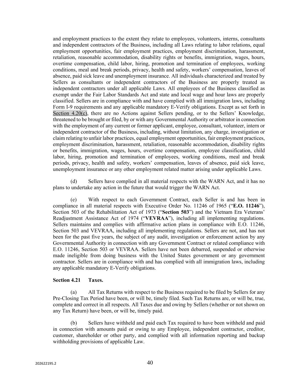 202622195.2 40 and employment practices to the extent they relate to employees, volunteers, interns, consultants and independent contractors of the Business, including all Laws relating to labor relations, equal employment opportunities, fair employment practices, employment discrimination, harassment, retaliation, reasonable accommodation, disability rights or benefits, immigration, wages, hours, overtime compensation, child labor, hiring, promotion and termination of employees, working conditions, meal and break periods, privacy, health and safety, workers’ compensation, leaves of absence, paid sick leave and unemployment insurance. All individuals characterized and treated by Sellers as consultants or independent contractors of the Business are properly treated as independent contractors under all applicable Laws. All employees of the Business classified as exempt under the Fair Labor Standards Act and state and local wage and hour laws are properly classified. Sellers are in compliance with and have complied with all immigration laws, including Form I-9 requirements and any applicable mandatory E-Verify obligations. Except as set forth in Section 4.20(c), there are no Actions against Sellers pending, or to the Sellers’ Knowledge, threatened to be brought or filed, by or with any Governmental Authority or arbitrator in connection with the employment of any current or former applicant, employee, consultant, volunteer, intern or independent contractor of the Business, including, without limitation, any charge, investigation or claim relating to unfair labor practices, equal employment opportunities, fair employment practices, employment discrimination, harassment, retaliation, reasonable accommodation, disability rights or benefits, immigration, wages, hours, overtime compensation, employee classification, child labor, hiring, promotion and termination of employees, working conditions, meal and break periods, privacy, health and safety, workers’ compensation, leaves of absence, paid sick leave, unemployment insurance or any other employment related matter arising under applicable Laws. (d) Sellers have complied in all material respects with the WARN Act, and it has no plans to undertake any action in the future that would trigger the WARN Act. (e) With respect to each Government Contract, each Seller is and has been in compliance in all material respects with Executive Order No. 11246 of 1965 (“E.O. 11246”), Section 503 of the Rehabilitation Act of 1973 (“Section 503”) and the Vietnam Era Veterans’ Readjustment Assistance Act of 1974 (“VEVRAA”), including all implementing regulations. Sellers maintains and complies with affirmative action plans in compliance with E.O. 11246, Section 503 and VEVRAA, including all implementing regulations. Sellers are not, and has not been for the past five years, the subject of any audit, investigation or enforcement action by any Governmental Authority in connection with any Government Contract or related compliance with E.O. 11246, Section 503 or VEVRAA. Sellers have not been debarred, suspended or otherwise made ineligible from doing business with the United States government or any government contractor. Sellers are in compliance with and has complied with all immigration laws, including any applicable mandatory E-Verify obligations. Section 4.21 Taxes. (a) All Tax Returns with respect to the Business required to be filed by Sellers for any Pre-Closing Tax Period have been, or will be, timely filed. Such Tax Returns are, or will be, true, complete and correct in all respects. All Taxes due and owing by Sellers (whether or not shown on any Tax Return) have been, or will be, timely paid. (b) Sellers have withheld and paid each Tax required to have been withheld and paid in connection with amounts paid or owing to any Employee, independent contractor, creditor, customer, shareholder or other party, and complied with all information reporting and backup withholding provisions of applicable Law.