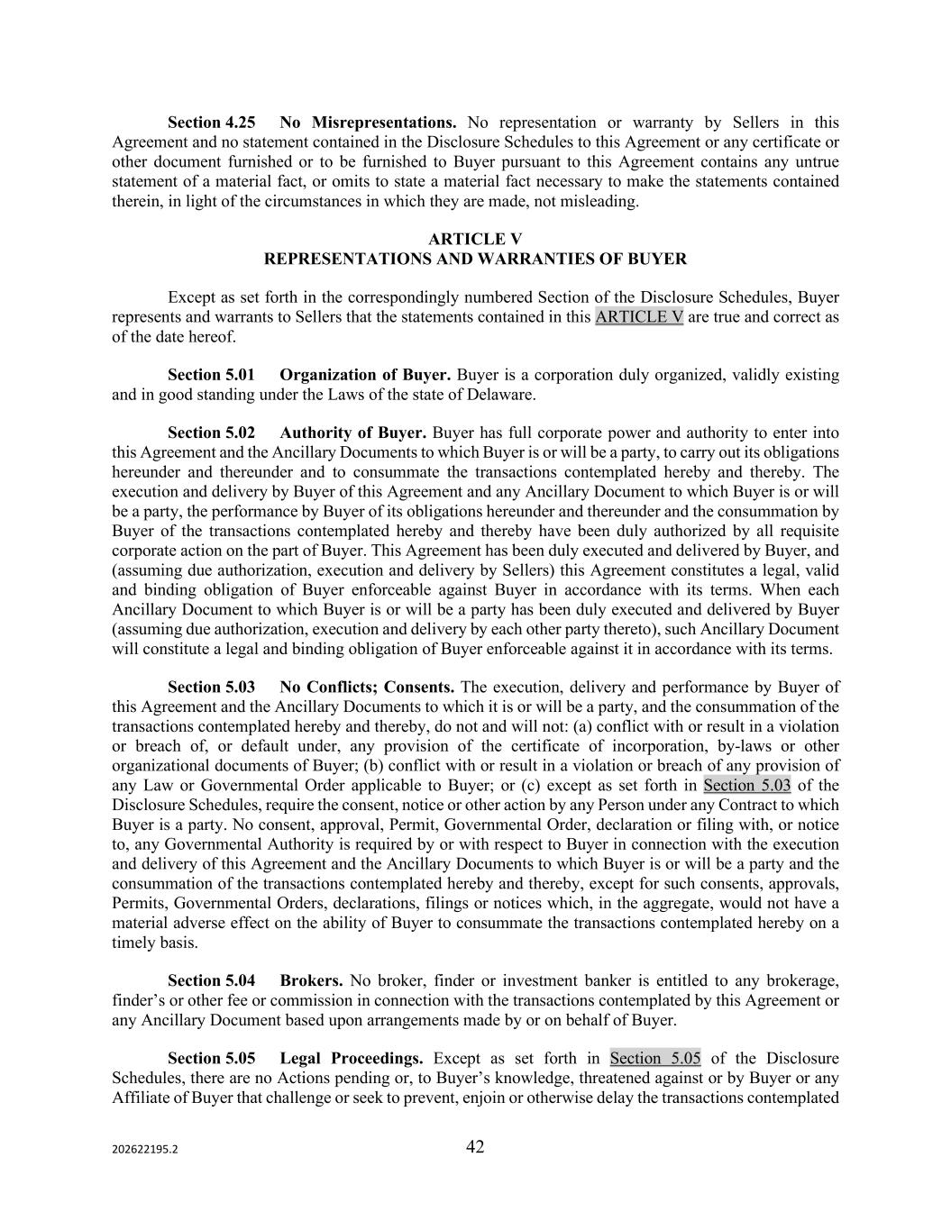 202622195.2 42 Section 4.25 No Misrepresentations. No representation or warranty by Sellers in this Agreement and no statement contained in the Disclosure Schedules to this Agreement or any certificate or other document furnished or to be furnished to Buyer pursuant to this Agreement contains any untrue statement of a material fact, or omits to state a material fact necessary to make the statements contained therein, in light of the circumstances in which they are made, not misleading. ARTICLE V REPRESENTATIONS AND WARRANTIES OF BUYER Except as set forth in the correspondingly numbered Section of the Disclosure Schedules, Buyer represents and warrants to Sellers that the statements contained in this ARTICLE V are true and correct as of the date hereof. Section 5.01 Organization of Buyer. Buyer is a corporation duly organized, validly existing and in good standing under the Laws of the state of Delaware. Section 5.02 Authority of Buyer. Buyer has full corporate power and authority to enter into this Agreement and the Ancillary Documents to which Buyer is or will be a party, to carry out its obligations hereunder and thereunder and to consummate the transactions contemplated hereby and thereby. The execution and delivery by Buyer of this Agreement and any Ancillary Document to which Buyer is or will be a party, the performance by Buyer of its obligations hereunder and thereunder and the consummation by Buyer of the transactions contemplated hereby and thereby have been duly authorized by all requisite corporate action on the part of Buyer. This Agreement has been duly executed and delivered by Buyer, and (assuming due authorization, execution and delivery by Sellers) this Agreement constitutes a legal, valid and binding obligation of Buyer enforceable against Buyer in accordance with its terms. When each Ancillary Document to which Buyer is or will be a party has been duly executed and delivered by Buyer (assuming due authorization, execution and delivery by each other party thereto), such Ancillary Document will constitute a legal and binding obligation of Buyer enforceable against it in accordance with its terms. Section 5.03 No Conflicts; Consents. The execution, delivery and performance by Buyer of this Agreement and the Ancillary Documents to which it is or will be a party, and the consummation of the transactions contemplated hereby and thereby, do not and will not: (a) conflict with or result in a violation or breach of, or default under, any provision of the certificate of incorporation, by-laws or other organizational documents of Buyer; (b) conflict with or result in a violation or breach of any provision of any Law or Governmental Order applicable to Buyer; or (c) except as set forth in Section 5.03 of the Disclosure Schedules, require the consent, notice or other action by any Person under any Contract to which Buyer is a party. No consent, approval, Permit, Governmental Order, declaration or filing with, or notice to, any Governmental Authority is required by or with respect to Buyer in connection with the execution and delivery of this Agreement and the Ancillary Documents to which Buyer is or will be a party and the consummation of the transactions contemplated hereby and thereby, except for such consents, approvals, Permits, Governmental Orders, declarations, filings or notices which, in the aggregate, would not have a material adverse effect on the ability of Buyer to consummate the transactions contemplated hereby on a timely basis. Section 5.04 Brokers. No broker, finder or investment banker is entitled to any brokerage, finder’s or other fee or commission in connection with the transactions contemplated by this Agreement or any Ancillary Document based upon arrangements made by or on behalf of Buyer. Section 5.05 Legal Proceedings. Except as set forth in Section 5.05 of the Disclosure Schedules, there are no Actions pending or, to Buyer’s knowledge, threatened against or by Buyer or any Affiliate of Buyer that challenge or seek to prevent, enjoin or otherwise delay the transactions contemplated