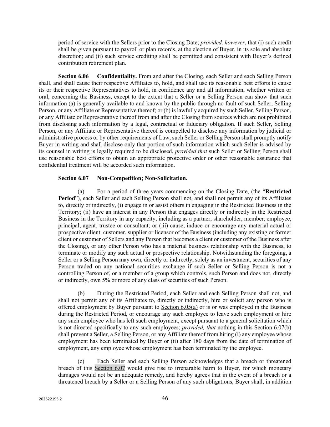202622195.2 46 period of service with the Sellers prior to the Closing Date; provided, however, that (i) such credit shall be given pursuant to payroll or plan records, at the election of Buyer, in its sole and absolute discretion; and (ii) such service crediting shall be permitted and consistent with Buyer’s defined contribution retirement plan. Section 6.06 Confidentiality. From and after the Closing, each Seller and each Selling Person shall, and shall cause their respective Affiliates to, hold, and shall use its reasonable best efforts to cause its or their respective Representatives to hold, in confidence any and all information, whether written or oral, concerning the Business, except to the extent that a Seller or a Selling Person can show that such information (a) is generally available to and known by the public through no fault of such Seller, Selling Person, or any Affiliate or Representative thereof; or (b) is lawfully acquired by such Seller, Selling Person, or any Affiliate or Representative thereof from and after the Closing from sources which are not prohibited from disclosing such information by a legal, contractual or fiduciary obligation. If such Seller, Selling Person, or any Affiliate or Representative thereof is compelled to disclose any information by judicial or administrative process or by other requirements of Law, such Seller or Selling Person shall promptly notify Buyer in writing and shall disclose only that portion of such information which such Seller is advised by its counsel in writing is legally required to be disclosed, provided that such Seller or Selling Person shall use reasonable best efforts to obtain an appropriate protective order or other reasonable assurance that confidential treatment will be accorded such information. Section 6.07 Non-Competition; Non-Solicitation. (a) For a period of three years commencing on the Closing Date, (the “Restricted Period”), each Seller and each Selling Person shall not, and shall not permit any of its Affiliates to, directly or indirectly, (i) engage in or assist others in engaging in the Restricted Business in the Territory; (ii) have an interest in any Person that engages directly or indirectly in the Restricted Business in the Territory in any capacity, including as a partner, shareholder, member, employee, principal, agent, trustee or consultant; or (iii) cause, induce or encourage any material actual or prospective client, customer, supplier or licensor of the Business (including any existing or former client or customer of Sellers and any Person that becomes a client or customer of the Business after the Closing), or any other Person who has a material business relationship with the Business, to terminate or modify any such actual or prospective relationship. Notwithstanding the foregoing, a Seller or a Selling Person may own, directly or indirectly, solely as an investment, securities of any Person traded on any national securities exchange if such Seller or Selling Person is not a controlling Person of, or a member of a group which controls, such Person and does not, directly or indirectly, own 5% or more of any class of securities of such Person. (b) During the Restricted Period, each Seller and each Selling Person shall not, and shall not permit any of its Affiliates to, directly or indirectly, hire or solicit any person who is offered employment by Buyer pursuant to Section 6.05(a) or is or was employed in the Business during the Restricted Period, or encourage any such employee to leave such employment or hire any such employee who has left such employment, except pursuant to a general solicitation which is not directed specifically to any such employees; provided, that nothing in this Section 6.07(b) shall prevent a Seller, a Selling Person, or any Affiliate thereof from hiring (i) any employee whose employment has been terminated by Buyer or (ii) after 180 days from the date of termination of employment, any employee whose employment has been terminated by the employee. (c) Each Seller and each Selling Person acknowledges that a breach or threatened breach of this Section 6.07 would give rise to irreparable harm to Buyer, for which monetary damages would not be an adequate remedy, and hereby agrees that in the event of a breach or a threatened breach by a Seller or a Selling Person of any such obligations, Buyer shall, in addition