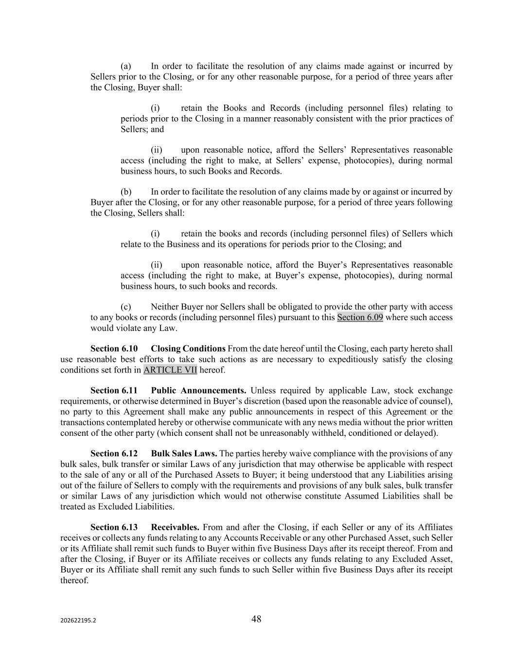 202622195.2 48 (a) In order to facilitate the resolution of any claims made against or incurred by Sellers prior to the Closing, or for any other reasonable purpose, for a period of three years after the Closing, Buyer shall: (i) retain the Books and Records (including personnel files) relating to periods prior to the Closing in a manner reasonably consistent with the prior practices of Sellers; and (ii) upon reasonable notice, afford the Sellers’ Representatives reasonable access (including the right to make, at Sellers’ expense, photocopies), during normal business hours, to such Books and Records. (b) In order to facilitate the resolution of any claims made by or against or incurred by Buyer after the Closing, or for any other reasonable purpose, for a period of three years following the Closing, Sellers shall: (i) retain the books and records (including personnel files) of Sellers which relate to the Business and its operations for periods prior to the Closing; and (ii) upon reasonable notice, afford the Buyer’s Representatives reasonable access (including the right to make, at Buyer’s expense, photocopies), during normal business hours, to such books and records. (c) Neither Buyer nor Sellers shall be obligated to provide the other party with access to any books or records (including personnel files) pursuant to this Section 6.09 where such access would violate any Law. Section 6.10 Closing Conditions From the date hereof until the Closing, each party hereto shall use reasonable best efforts to take such actions as are necessary to expeditiously satisfy the closing conditions set forth in ARTICLE VII hereof. Section 6.11 Public Announcements. Unless required by applicable Law, stock exchange requirements, or otherwise determined in Buyer’s discretion (based upon the reasonable advice of counsel), no party to this Agreement shall make any public announcements in respect of this Agreement or the transactions contemplated hereby or otherwise communicate with any news media without the prior written consent of the other party (which consent shall not be unreasonably withheld, conditioned or delayed). Section 6.12 Bulk Sales Laws. The parties hereby waive compliance with the provisions of any bulk sales, bulk transfer or similar Laws of any jurisdiction that may otherwise be applicable with respect to the sale of any or all of the Purchased Assets to Buyer; it being understood that any Liabilities arising out of the failure of Sellers to comply with the requirements and provisions of any bulk sales, bulk transfer or similar Laws of any jurisdiction which would not otherwise constitute Assumed Liabilities shall be treated as Excluded Liabilities. Section 6.13 Receivables. From and after the Closing, if each Seller or any of its Affiliates receives or collects any funds relating to any Accounts Receivable or any other Purchased Asset, such Seller or its Affiliate shall remit such funds to Buyer within five Business Days after its receipt thereof. From and after the Closing, if Buyer or its Affiliate receives or collects any funds relating to any Excluded Asset, Buyer or its Affiliate shall remit any such funds to such Seller within five Business Days after its receipt thereof.