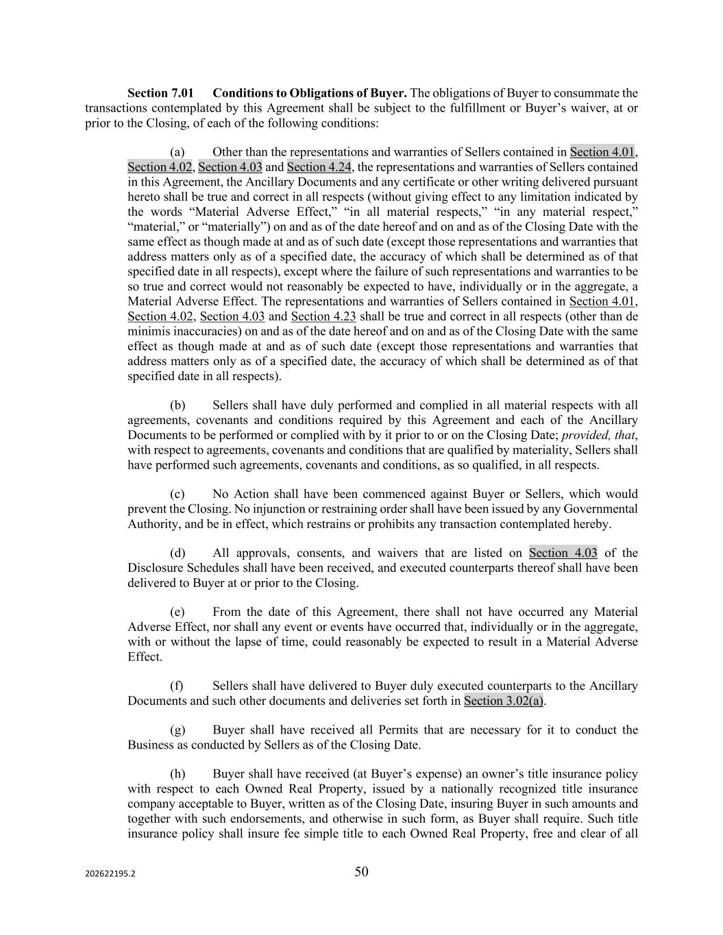 202622195.2 50 Section 7.01 Conditions to Obligations of Buyer. The obligations of Buyer to consummate the transactions contemplated by this Agreement shall be subject to the fulfillment or Buyer’s waiver, at or prior to the Closing, of each of the following conditions: (a) Other than the representations and warranties of Sellers contained in Section 4.01, Section 4.02, Section 4.03 and Section 4.24, the representations and warranties of Sellers contained in this Agreement, the Ancillary Documents and any certificate or other writing delivered pursuant hereto shall be true and correct in all respects (without giving effect to any limitation indicated by the words “Material Adverse Effect,” “in all material respects,” “in any material respect,” “material,” or “materially”) on and as of the date hereof and on and as of the Closing Date with the same effect as though made at and as of such date (except those representations and warranties that address matters only as of a specified date, the accuracy of which shall be determined as of that specified date in all respects), except where the failure of such representations and warranties to be so true and correct would not reasonably be expected to have, individually or in the aggregate, a Material Adverse Effect. The representations and warranties of Sellers contained in Section 4.01, Section 4.02, Section 4.03 and Section 4.23 shall be true and correct in all respects (other than de minimis inaccuracies) on and as of the date hereof and on and as of the Closing Date with the same effect as though made at and as of such date (except those representations and warranties that address matters only as of a specified date, the accuracy of which shall be determined as of that specified date in all respects). (b) Sellers shall have duly performed and complied in all material respects with all agreements, covenants and conditions required by this Agreement and each of the Ancillary Documents to be performed or complied with by it prior to or on the Closing Date; provided, that, with respect to agreements, covenants and conditions that are qualified by materiality, Sellers shall have performed such agreements, covenants and conditions, as so qualified, in all respects. (c) No Action shall have been commenced against Buyer or Sellers, which would prevent the Closing. No injunction or restraining order shall have been issued by any Governmental Authority, and be in effect, which restrains or prohibits any transaction contemplated hereby. (d) All approvals, consents, and waivers that are listed on Section 4.03 of the Disclosure Schedules shall have been received, and executed counterparts thereof shall have been delivered to Buyer at or prior to the Closing. (e) From the date of this Agreement, there shall not have occurred any Material Adverse Effect, nor shall any event or events have occurred that, individually or in the aggregate, with or without the lapse of time, could reasonably be expected to result in a Material Adverse Effect. (f) Sellers shall have delivered to Buyer duly executed counterparts to the Ancillary Documents and such other documents and deliveries set forth in Section 3.02(a). (g) Buyer shall have received all Permits that are necessary for it to conduct the Business as conducted by Sellers as of the Closing Date. (h) Buyer shall have received (at Buyer’s expense) an owner’s title insurance policy with respect to each Owned Real Property, issued by a nationally recognized title insurance company acceptable to Buyer, written as of the Closing Date, insuring Buyer in such amounts and together with such endorsements, and otherwise in such form, as Buyer shall require. Such title insurance policy shall insure fee simple title to each Owned Real Property, free and clear of all