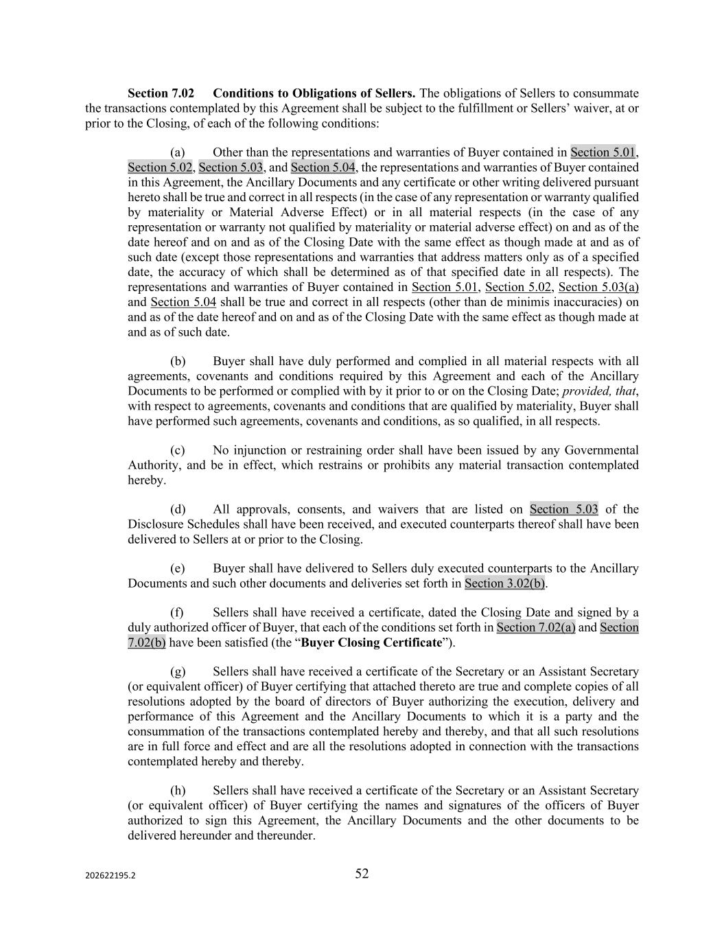 202622195.2 52 Section 7.02 Conditions to Obligations of Sellers. The obligations of Sellers to consummate the transactions contemplated by this Agreement shall be subject to the fulfillment or Sellers’ waiver, at or prior to the Closing, of each of the following conditions: (a) Other than the representations and warranties of Buyer contained in Section 5.01, Section 5.02, Section 5.03, and Section 5.04, the representations and warranties of Buyer contained in this Agreement, the Ancillary Documents and any certificate or other writing delivered pursuant hereto shall be true and correct in all respects (in the case of any representation or warranty qualified by materiality or Material Adverse Effect) or in all material respects (in the case of any representation or warranty not qualified by materiality or material adverse effect) on and as of the date hereof and on and as of the Closing Date with the same effect as though made at and as of such date (except those representations and warranties that address matters only as of a specified date, the accuracy of which shall be determined as of that specified date in all respects). The representations and warranties of Buyer contained in Section 5.01, Section 5.02, Section 5.03(a) and Section 5.04 shall be true and correct in all respects (other than de minimis inaccuracies) on and as of the date hereof and on and as of the Closing Date with the same effect as though made at and as of such date. (b) Buyer shall have duly performed and complied in all material respects with all agreements, covenants and conditions required by this Agreement and each of the Ancillary Documents to be performed or complied with by it prior to or on the Closing Date; provided, that, with respect to agreements, covenants and conditions that are qualified by materiality, Buyer shall have performed such agreements, covenants and conditions, as so qualified, in all respects. (c) No injunction or restraining order shall have been issued by any Governmental Authority, and be in effect, which restrains or prohibits any material transaction contemplated hereby. (d) All approvals, consents, and waivers that are listed on Section 5.03 of the Disclosure Schedules shall have been received, and executed counterparts thereof shall have been delivered to Sellers at or prior to the Closing. (e) Buyer shall have delivered to Sellers duly executed counterparts to the Ancillary Documents and such other documents and deliveries set forth in Section 3.02(b). (f) Sellers shall have received a certificate, dated the Closing Date and signed by a duly authorized officer of Buyer, that each of the conditions set forth in Section 7.02(a) and Section 7.02(b) have been satisfied (the “Buyer Closing Certificate”). (g) Sellers shall have received a certificate of the Secretary or an Assistant Secretary (or equivalent officer) of Buyer certifying that attached thereto are true and complete copies of all resolutions adopted by the board of directors of Buyer authorizing the execution, delivery and performance of this Agreement and the Ancillary Documents to which it is a party and the consummation of the transactions contemplated hereby and thereby, and that all such resolutions are in full force and effect and are all the resolutions adopted in connection with the transactions contemplated hereby and thereby. (h) Sellers shall have received a certificate of the Secretary or an Assistant Secretary (or equivalent officer) of Buyer certifying the names and signatures of the officers of Buyer authorized to sign this Agreement, the Ancillary Documents and the other documents to be delivered hereunder and thereunder.