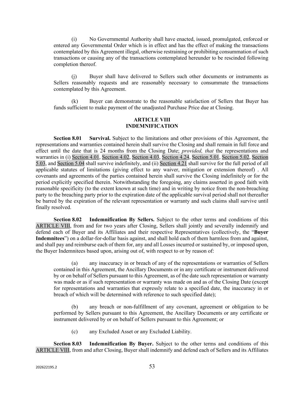 202622195.2 53 (i) No Governmental Authority shall have enacted, issued, promulgated, enforced or entered any Governmental Order which is in effect and has the effect of making the transactions contemplated by this Agreement illegal, otherwise restraining or prohibiting consummation of such transactions or causing any of the transactions contemplated hereunder to be rescinded following completion thereof. (j) Buyer shall have delivered to Sellers such other documents or instruments as Sellers reasonably requests and are reasonably necessary to consummate the transactions contemplated by this Agreement. (k) Buyer can demonstrate to the reasonable satisfaction of Sellers that Buyer has funds sufficient to make payment of the unadjusted Purchase Price due at Closing. ARTICLE VIII INDEMNIFICATION Section 8.01 Survival. Subject to the limitations and other provisions of this Agreement, the representations and warranties contained herein shall survive the Closing and shall remain in full force and effect until the date that is 24 months from the Closing Date; provided, that the representations and warranties in (i) Section 4.01, Section 4.02, Section 4.03, Section 4.24, Section 5.01, Section 5.02, Section 5.03, and Section 5.04 shall survive indefinitely, and (ii) Section 4.21 shall survive for the full period of all applicable statutes of limitations (giving effect to any waiver, mitigation or extension thereof) . All covenants and agreements of the parties contained herein shall survive the Closing indefinitely or for the period explicitly specified therein. Notwithstanding the foregoing, any claims asserted in good faith with reasonable specificity (to the extent known at such time) and in writing by notice from the non-breaching party to the breaching party prior to the expiration date of the applicable survival period shall not thereafter be barred by the expiration of the relevant representation or warranty and such claims shall survive until finally resolved. Section 8.02 Indemnification By Sellers. Subject to the other terms and conditions of this ARTICLE VIII, from and for two years after Closing, Sellers shall jointly and severally indemnify and defend each of Buyer and its Affiliates and their respective Representatives (collectively, the “Buyer Indemnitees”) on a dollar-for-dollar basis against, and shall hold each of them harmless from and against, and shall pay and reimburse each of them for, any and all Losses incurred or sustained by, or imposed upon, the Buyer Indemnitees based upon, arising out of, with respect to or by reason of: (a) any inaccuracy in or breach of any of the representations or warranties of Sellers contained in this Agreement, the Ancillary Documents or in any certificate or instrument delivered by or on behalf of Sellers pursuant to this Agreement, as of the date such representation or warranty was made or as if such representation or warranty was made on and as of the Closing Date (except for representations and warranties that expressly relate to a specified date, the inaccuracy in or breach of which will be determined with reference to such specified date); (b) any breach or non-fulfillment of any covenant, agreement or obligation to be performed by Sellers pursuant to this Agreement, the Ancillary Documents or any certificate or instrument delivered by or on behalf of Sellers pursuant to this Agreement; or (c) any Excluded Asset or any Excluded Liability. Section 8.03 Indemnification By Buyer. Subject to the other terms and conditions of this ARTICLE VIII, from and after Closing, Buyer shall indemnify and defend each of Sellers and its Affiliates