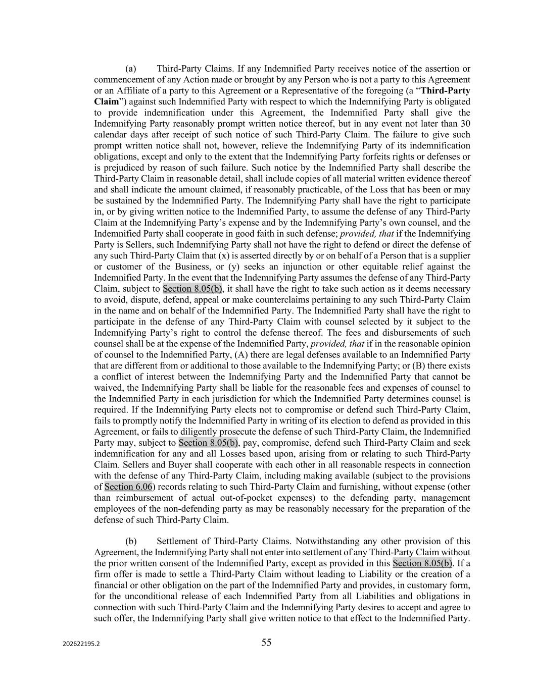 202622195.2 55 (a) Third-Party Claims. If any Indemnified Party receives notice of the assertion or commencement of any Action made or brought by any Person who is not a party to this Agreement or an Affiliate of a party to this Agreement or a Representative of the foregoing (a “Third-Party Claim”) against such Indemnified Party with respect to which the Indemnifying Party is obligated to provide indemnification under this Agreement, the Indemnified Party shall give the Indemnifying Party reasonably prompt written notice thereof, but in any event not later than 30 calendar days after receipt of such notice of such Third-Party Claim. The failure to give such prompt written notice shall not, however, relieve the Indemnifying Party of its indemnification obligations, except and only to the extent that the Indemnifying Party forfeits rights or defenses or is prejudiced by reason of such failure. Such notice by the Indemnified Party shall describe the Third-Party Claim in reasonable detail, shall include copies of all material written evidence thereof and shall indicate the amount claimed, if reasonably practicable, of the Loss that has been or may be sustained by the Indemnified Party. The Indemnifying Party shall have the right to participate in, or by giving written notice to the Indemnified Party, to assume the defense of any Third-Party Claim at the Indemnifying Party’s expense and by the Indemnifying Party’s own counsel, and the Indemnified Party shall cooperate in good faith in such defense; provided, that if the Indemnifying Party is Sellers, such Indemnifying Party shall not have the right to defend or direct the defense of any such Third-Party Claim that (x) is asserted directly by or on behalf of a Person that is a supplier or customer of the Business, or (y) seeks an injunction or other equitable relief against the Indemnified Party. In the event that the Indemnifying Party assumes the defense of any Third-Party Claim, subject to Section 8.05(b), it shall have the right to take such action as it deems necessary to avoid, dispute, defend, appeal or make counterclaims pertaining to any such Third-Party Claim in the name and on behalf of the Indemnified Party. The Indemnified Party shall have the right to participate in the defense of any Third-Party Claim with counsel selected by it subject to the Indemnifying Party’s right to control the defense thereof. The fees and disbursements of such counsel shall be at the expense of the Indemnified Party, provided, that if in the reasonable opinion of counsel to the Indemnified Party, (A) there are legal defenses available to an Indemnified Party that are different from or additional to those available to the Indemnifying Party; or (B) there exists a conflict of interest between the Indemnifying Party and the Indemnified Party that cannot be waived, the Indemnifying Party shall be liable for the reasonable fees and expenses of counsel to the Indemnified Party in each jurisdiction for which the Indemnified Party determines counsel is required. If the Indemnifying Party elects not to compromise or defend such Third-Party Claim, fails to promptly notify the Indemnified Party in writing of its election to defend as provided in this Agreement, or fails to diligently prosecute the defense of such Third-Party Claim, the Indemnified Party may, subject to Section 8.05(b), pay, compromise, defend such Third-Party Claim and seek indemnification for any and all Losses based upon, arising from or relating to such Third-Party Claim. Sellers and Buyer shall cooperate with each other in all reasonable respects in connection with the defense of any Third-Party Claim, including making available (subject to the provisions of Section 6.06) records relating to such Third-Party Claim and furnishing, without expense (other than reimbursement of actual out-of-pocket expenses) to the defending party, management employees of the non-defending party as may be reasonably necessary for the preparation of the defense of such Third-Party Claim. (b) Settlement of Third-Party Claims. Notwithstanding any other provision of this Agreement, the Indemnifying Party shall not enter into settlement of any Third-Party Claim without the prior written consent of the Indemnified Party, except as provided in this Section 8.05(b). If a firm offer is made to settle a Third-Party Claim without leading to Liability or the creation of a financial or other obligation on the part of the Indemnified Party and provides, in customary form, for the unconditional release of each Indemnified Party from all Liabilities and obligations in connection with such Third-Party Claim and the Indemnifying Party desires to accept and agree to such offer, the Indemnifying Party shall give written notice to that effect to the Indemnified Party.