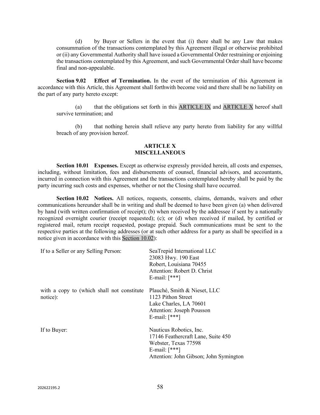 202622195.2 58 (d) by Buyer or Sellers in the event that (i) there shall be any Law that makes consummation of the transactions contemplated by this Agreement illegal or otherwise prohibited or (ii) any Governmental Authority shall have issued a Governmental Order restraining or enjoining the transactions contemplated by this Agreement, and such Governmental Order shall have become final and non-appealable. Section 9.02 Effect of Termination. In the event of the termination of this Agreement in accordance with this Article, this Agreement shall forthwith become void and there shall be no liability on the part of any party hereto except: (a) that the obligations set forth in this ARTICLE IX and ARTICLE X hereof shall survive termination; and (b) that nothing herein shall relieve any party hereto from liability for any willful breach of any provision hereof. ARTICLE X MISCELLANEOUS Section 10.01 Expenses. Except as otherwise expressly provided herein, all costs and expenses, including, without limitation, fees and disbursements of counsel, financial advisors, and accountants, incurred in connection with this Agreement and the transactions contemplated hereby shall be paid by the party incurring such costs and expenses, whether or not the Closing shall have occurred. Section 10.02 Notices. All notices, requests, consents, claims, demands, waivers and other communications hereunder shall be in writing and shall be deemed to have been given (a) when delivered by hand (with written confirmation of receipt); (b) when received by the addressee if sent by a nationally recognized overnight courier (receipt requested); (c); or (d) when received if mailed, by certified or registered mail, return receipt requested, postage prepaid. Such communications must be sent to the respective parties at the following addresses (or at such other address for a party as shall be specified in a notice given in accordance with this Section 10.02): If to a Seller or any Selling Person: SeaTrepid International LLC 23083 Hwy. 190 East Robert, Louisiana 70455 Attention: Robert D. Christ E-mail: [***] with a copy to (which shall not constitute notice): Plauché, Smith & Nieset, LLC 1123 Pithon Street Lake Charles, LA 70601 Attention: Joseph Pousson E-mail: [***] If to Buyer: Nauticus Robotics, Inc. 17146 Feathercraft Lane, Suite 450 Webster, Texas 77598 E-mail: [***] Attention: John Gibson; John Symington