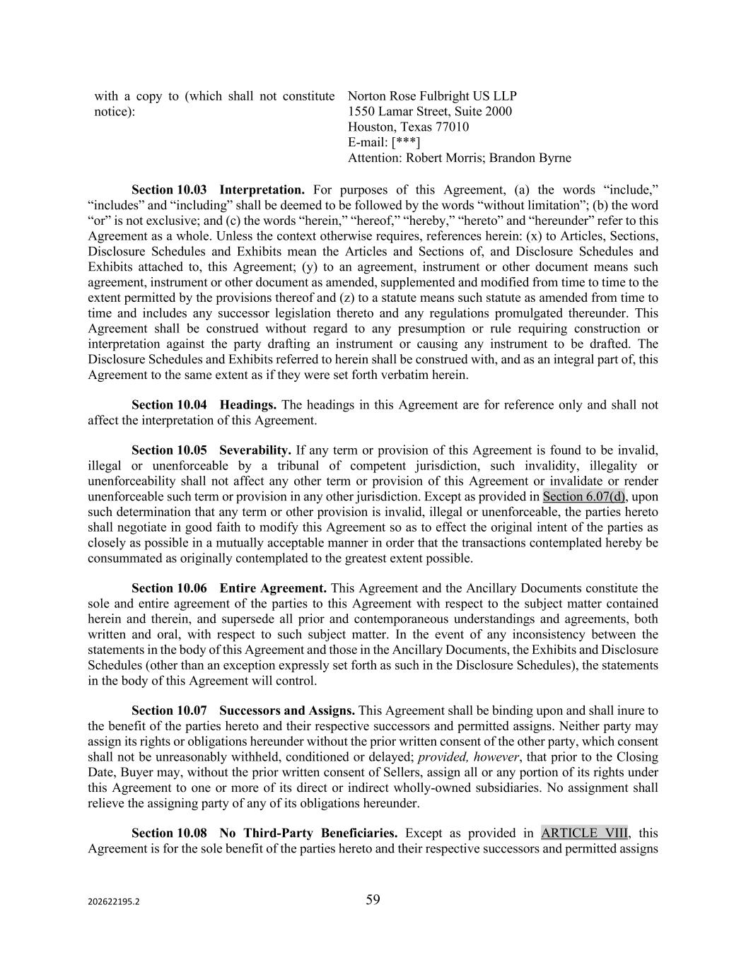 202622195.2 59 with a copy to (which shall not constitute notice): Norton Rose Fulbright US LLP 1550 Lamar Street, Suite 2000 Houston, Texas 77010 E-mail: [***] Attention: Robert Morris; Brandon Byrne Section 10.03 Interpretation. For purposes of this Agreement, (a) the words “include,” “includes” and “including” shall be deemed to be followed by the words “without limitation”; (b) the word “or” is not exclusive; and (c) the words “herein,” “hereof,” “hereby,” “hereto” and “hereunder” refer to this Agreement as a whole. Unless the context otherwise requires, references herein: (x) to Articles, Sections, Disclosure Schedules and Exhibits mean the Articles and Sections of, and Disclosure Schedules and Exhibits attached to, this Agreement; (y) to an agreement, instrument or other document means such agreement, instrument or other document as amended, supplemented and modified from time to time to the extent permitted by the provisions thereof and (z) to a statute means such statute as amended from time to time and includes any successor legislation thereto and any regulations promulgated thereunder. This Agreement shall be construed without regard to any presumption or rule requiring construction or interpretation against the party drafting an instrument or causing any instrument to be drafted. The Disclosure Schedules and Exhibits referred to herein shall be construed with, and as an integral part of, this Agreement to the same extent as if they were set forth verbatim herein. Section 10.04 Headings. The headings in this Agreement are for reference only and shall not affect the interpretation of this Agreement. Section 10.05 Severability. If any term or provision of this Agreement is found to be invalid, illegal or unenforceable by a tribunal of competent jurisdiction, such invalidity, illegality or unenforceability shall not affect any other term or provision of this Agreement or invalidate or render unenforceable such term or provision in any other jurisdiction. Except as provided in Section 6.07(d), upon such determination that any term or other provision is invalid, illegal or unenforceable, the parties hereto shall negotiate in good faith to modify this Agreement so as to effect the original intent of the parties as closely as possible in a mutually acceptable manner in order that the transactions contemplated hereby be consummated as originally contemplated to the greatest extent possible. Section 10.06 Entire Agreement. This Agreement and the Ancillary Documents constitute the sole and entire agreement of the parties to this Agreement with respect to the subject matter contained herein and therein, and supersede all prior and contemporaneous understandings and agreements, both written and oral, with respect to such subject matter. In the event of any inconsistency between the statements in the body of this Agreement and those in the Ancillary Documents, the Exhibits and Disclosure Schedules (other than an exception expressly set forth as such in the Disclosure Schedules), the statements in the body of this Agreement will control. Section 10.07 Successors and Assigns. This Agreement shall be binding upon and shall inure to the benefit of the parties hereto and their respective successors and permitted assigns. Neither party may assign its rights or obligations hereunder without the prior written consent of the other party, which consent shall not be unreasonably withheld, conditioned or delayed; provided, however, that prior to the Closing Date, Buyer may, without the prior written consent of Sellers, assign all or any portion of its rights under this Agreement to one or more of its direct or indirect wholly-owned subsidiaries. No assignment shall relieve the assigning party of any of its obligations hereunder. Section 10.08 No Third-Party Beneficiaries. Except as provided in ARTICLE VIII, this Agreement is for the sole benefit of the parties hereto and their respective successors and permitted assigns
