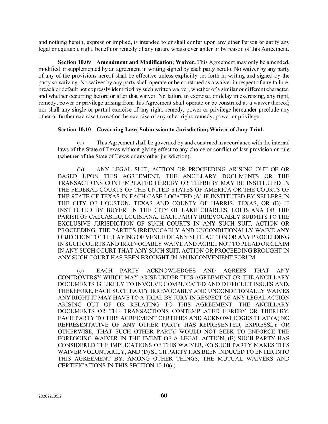 202622195.2 60 and nothing herein, express or implied, is intended to or shall confer upon any other Person or entity any legal or equitable right, benefit or remedy of any nature whatsoever under or by reason of this Agreement. Section 10.09 Amendment and Modification; Waiver. This Agreement may only be amended, modified or supplemented by an agreement in writing signed by each party hereto. No waiver by any party of any of the provisions hereof shall be effective unless explicitly set forth in writing and signed by the party so waiving. No waiver by any party shall operate or be construed as a waiver in respect of any failure, breach or default not expressly identified by such written waiver, whether of a similar or different character, and whether occurring before or after that waiver. No failure to exercise, or delay in exercising, any right, remedy, power or privilege arising from this Agreement shall operate or be construed as a waiver thereof; nor shall any single or partial exercise of any right, remedy, power or privilege hereunder preclude any other or further exercise thereof or the exercise of any other right, remedy, power or privilege. Section 10.10 Governing Law; Submission to Jurisdiction; Waiver of Jury Trial. (a) This Agreement shall be governed by and construed in accordance with the internal laws of the State of Texas without giving effect to any choice or conflict of law provision or rule (whether of the State of Texas or any other jurisdiction). (b) ANY LEGAL SUIT, ACTION OR PROCEEDING ARISING OUT OF OR BASED UPON THIS AGREEMENT, THE ANCILLARY DOCUMENTS OR THE TRANSACTIONS CONTEMPLATED HEREBY OR THEREBY MAY BE INSTITUTED IN THE FEDERAL COURTS OF THE UNITED STATES OF AMERICA OR THE COURTS OF THE STATE OF TEXAS IN EACH CASE LOCATED (A) IF INSTITUTED BY SELLERS,IN THE CITY OF HOUSTON, TEXAS AND COUNTY OF HARRIS. TEXAS, OR (B) IF INSTITUTED BY BUYER, IN THE CITY OF LAKE CHARLES, LOUISIANA OR THE PARISH OF CALCASIEU, LOUISIANA. EACH PARTY IRREVOCABLY SUBMITS TO THE EXCLUSIVE JURISDICTION OF SUCH COURTS IN ANY SUCH SUIT, ACTION OR PROCEEDING. THE PARTIES IRREVOCABLY AND UNCONDITIONALLY WAIVE ANY OBJECTION TO THE LAYING OF VENUE OF ANY SUIT, ACTION OR ANY PROCEEDING IN SUCH COURTS AND IRREVOCABLY WAIVE AND AGREE NOT TO PLEAD OR CLAIM IN ANY SUCH COURT THAT ANY SUCH SUIT, ACTION OR PROCEEDING BROUGHT IN ANY SUCH COURT HAS BEEN BROUGHT IN AN INCONVENIENT FORUM. (c) EACH PARTY ACKNOWLEDGES AND AGREES THAT ANY CONTROVERSY WHICH MAY ARISE UNDER THIS AGREEMENT OR THE ANCILLARY DOCUMENTS IS LIKELY TO INVOLVE COMPLICATED AND DIFFICULT ISSUES AND, THEREFORE, EACH SUCH PARTY IRREVOCABLY AND UNCONDITIONALLY WAIVES ANY RIGHT IT MAY HAVE TO A TRIAL BY JURY IN RESPECT OF ANY LEGAL ACTION ARISING OUT OF OR RELATING TO THIS AGREEMENT, THE ANCILLARY DOCUMENTS OR THE TRANSACTIONS CONTEMPLATED HEREBY OR THEREBY. EACH PARTY TO THIS AGREEMENT CERTIFIES AND ACKNOWLEDGES THAT (A) NO REPRESENTATIVE OF ANY OTHER PARTY HAS REPRESENTED, EXPRESSLY OR OTHERWISE, THAT SUCH OTHER PARTY WOULD NOT SEEK TO ENFORCE THE FOREGOING WAIVER IN THE EVENT OF A LEGAL ACTION, (B) SUCH PARTY HAS CONSIDERED THE IMPLICATIONS OF THIS WAIVER, (C) SUCH PARTY MAKES THIS WAIVER VOLUNTARILY, AND (D) SUCH PARTY HAS BEEN INDUCED TO ENTER INTO THIS AGREEMENT BY, AMONG OTHER THINGS, THE MUTUAL WAIVERS AND CERTIFICATIONS IN THIS SECTION 10.10(c).