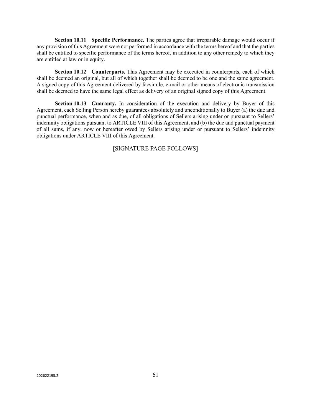 202622195.2 61 Section 10.11 Specific Performance. The parties agree that irreparable damage would occur if any provision of this Agreement were not performed in accordance with the terms hereof and that the parties shall be entitled to specific performance of the terms hereof, in addition to any other remedy to which they are entitled at law or in equity. Section 10.12 Counterparts. This Agreement may be executed in counterparts, each of which shall be deemed an original, but all of which together shall be deemed to be one and the same agreement. A signed copy of this Agreement delivered by facsimile, e-mail or other means of electronic transmission shall be deemed to have the same legal effect as delivery of an original signed copy of this Agreement. Section 10.13 Guaranty. In consideration of the execution and delivery by Buyer of this Agreement, each Selling Person hereby guarantees absolutely and unconditionally to Buyer (a) the due and punctual performance, when and as due, of all obligations of Sellers arising under or pursuant to Sellers’ indemnity obligations pursuant to ARTICLE VIII of this Agreement, and (b) the due and punctual payment of all sums, if any, now or hereafter owed by Sellers arising under or pursuant to Sellers’ indemnity obligations under ARTICLE VIII of this Agreement. [SIGNATURE PAGE FOLLOWS]
