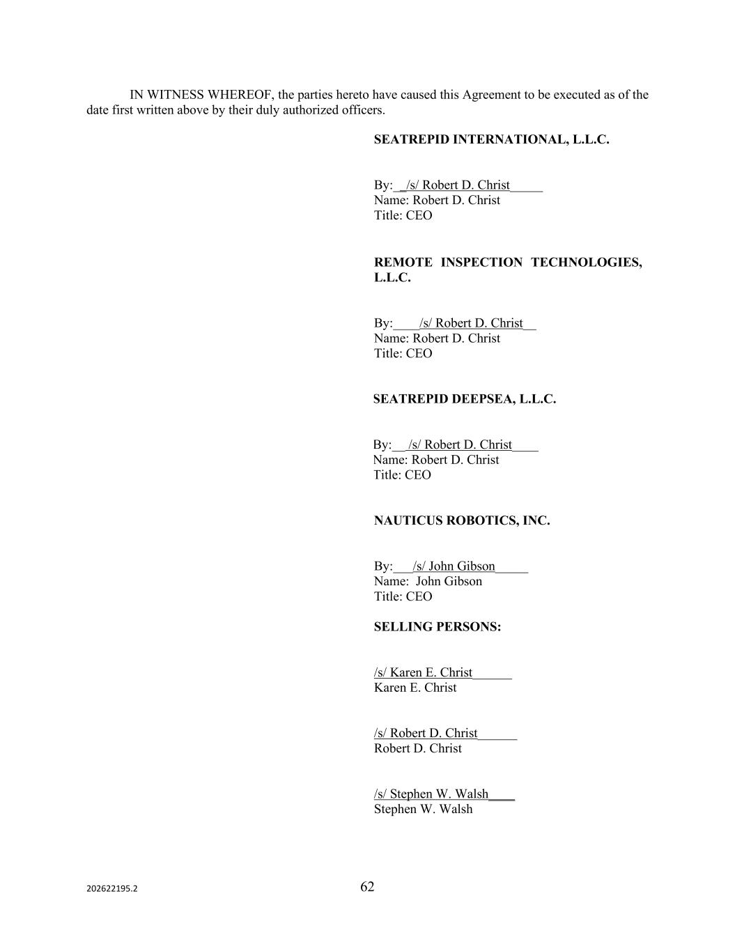 202622195.2 62 IN WITNESS WHEREOF, the parties hereto have caused this Agreement to be executed as of the date first written above by their duly authorized officers. SEATREPID INTERNATIONAL, L.L.C. By:__/s/ Robert D. Christ_____ Name: Robert D. Christ Title: CEO REMOTE INSPECTION TECHNOLOGIES, L.L.C. By:____/s/ Robert D. Christ__ Name: Robert D. Christ Title: CEO SEATREPID DEEPSEA, L.L.C. By:__ /s/ Robert D. Christ____ Name: Robert D. Christ Title: CEO NAUTICUS ROBOTICS, INC. By:___/s/ John Gibson_____ Name: John Gibson Title: CEO SELLING PERSONS: /s/ Karen E. Christ______ Karen E. Christ /s/ Robert D. Christ______ Robert D. Christ /s/ Stephen W. Walsh____ Stephen W. Walsh