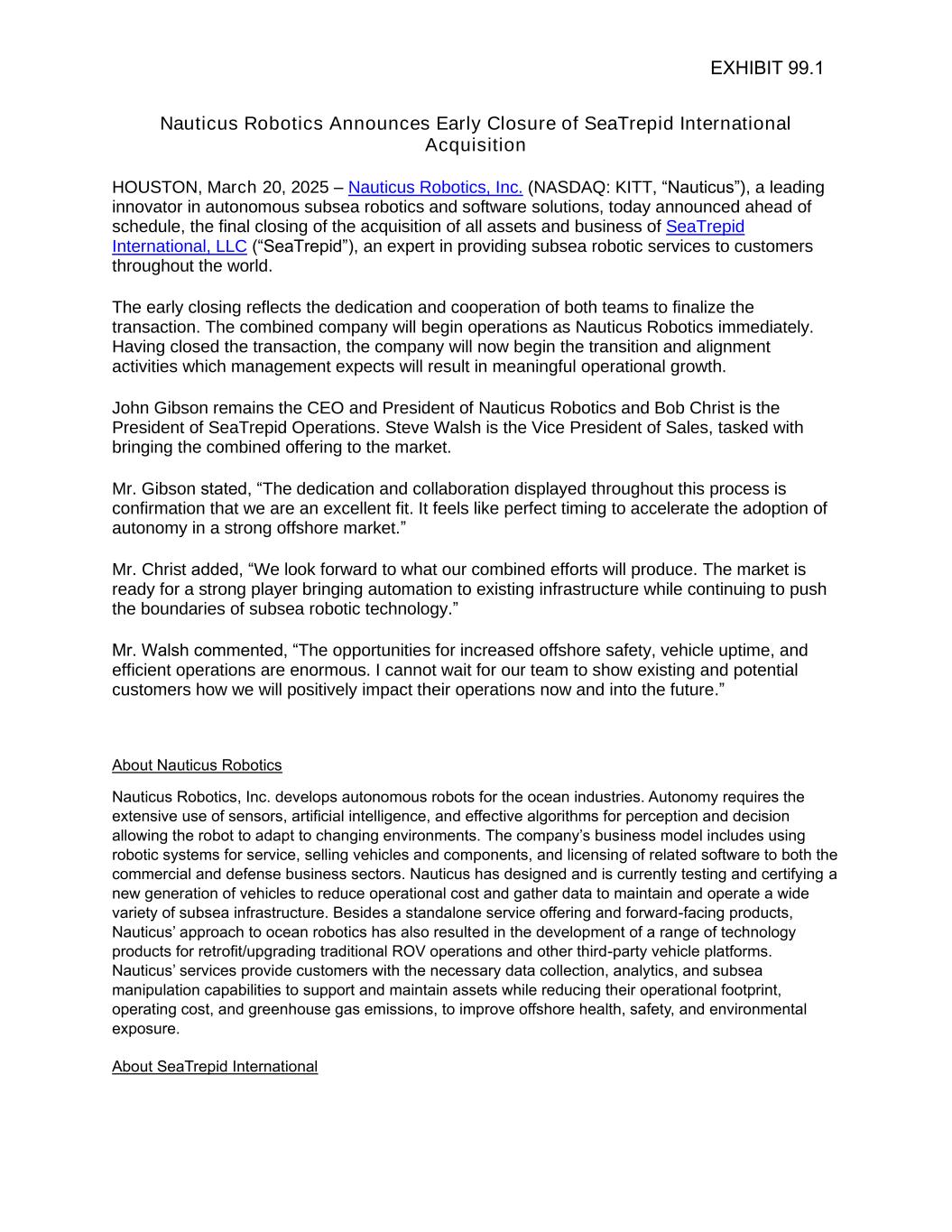 Nauticus Robotics Announces Early Closure of SeaTrepid International Acquisition HOUSTON, March 20, 2025 – Nauticus Robotics, Inc. (NASDAQ: KITT, “Nauticus”), a leading innovator in autonomous subsea robotics and software solutions, today announced ahead of schedule, the final closing of the acquisition of all assets and business of SeaTrepid International, LLC (“SeaTrepid”), an expert in providing subsea robotic services to customers throughout the world. The early closing reflects the dedication and cooperation of both teams to finalize the transaction. The combined company will begin operations as Nauticus Robotics immediately. Having closed the transaction, the company will now begin the transition and alignment activities which management expects will result in meaningful operational growth. John Gibson remains the CEO and President of Nauticus Robotics and Bob Christ is the President of SeaTrepid Operations. Steve Walsh is the Vice President of Sales, tasked with bringing the combined offering to the market. Mr. Gibson stated, “The dedication and collaboration displayed throughout this process is confirmation that we are an excellent fit. It feels like perfect timing to accelerate the adoption of autonomy in a strong offshore market.” Mr. Christ added, “We look forward to what our combined efforts will produce. The market is ready for a strong player bringing automation to existing infrastructure while continuing to push the boundaries of subsea robotic technology.” Mr. Walsh commented, “The opportunities for increased offshore safety, vehicle uptime, and efficient operations are enormous. I cannot wait for our team to show existing and potential customers how we will positively impact their operations now and into the future.” About Nauticus Robotics Nauticus Robotics, Inc. develops autonomous robots for the ocean industries. Autonomy requires the extensive use of sensors, artificial intelligence, and effective algorithms for perception and decision allowing the robot to adapt to changing environments. The company’s business model includes using robotic systems for service, selling vehicles and components, and licensing of related software to both the commercial and defense business sectors. Nauticus has designed and is currently testing and certifying a new generation of vehicles to reduce operational cost and gather data to maintain and operate a wide variety of subsea infrastructure. Besides a standalone service offering and forward-facing products, Nauticus’ approach to ocean robotics has also resulted in the development of a range of technology products for retrofit/upgrading traditional ROV operations and other third-party vehicle platforms. Nauticus’ services provide customers with the necessary data collection, analytics, and subsea manipulation capabilities to support and maintain assets while reducing their operational footprint, operating cost, and greenhouse gas emissions, to improve offshore health, safety, and environmental exposure. About SeaTrepid International EXHIBIT 99.1