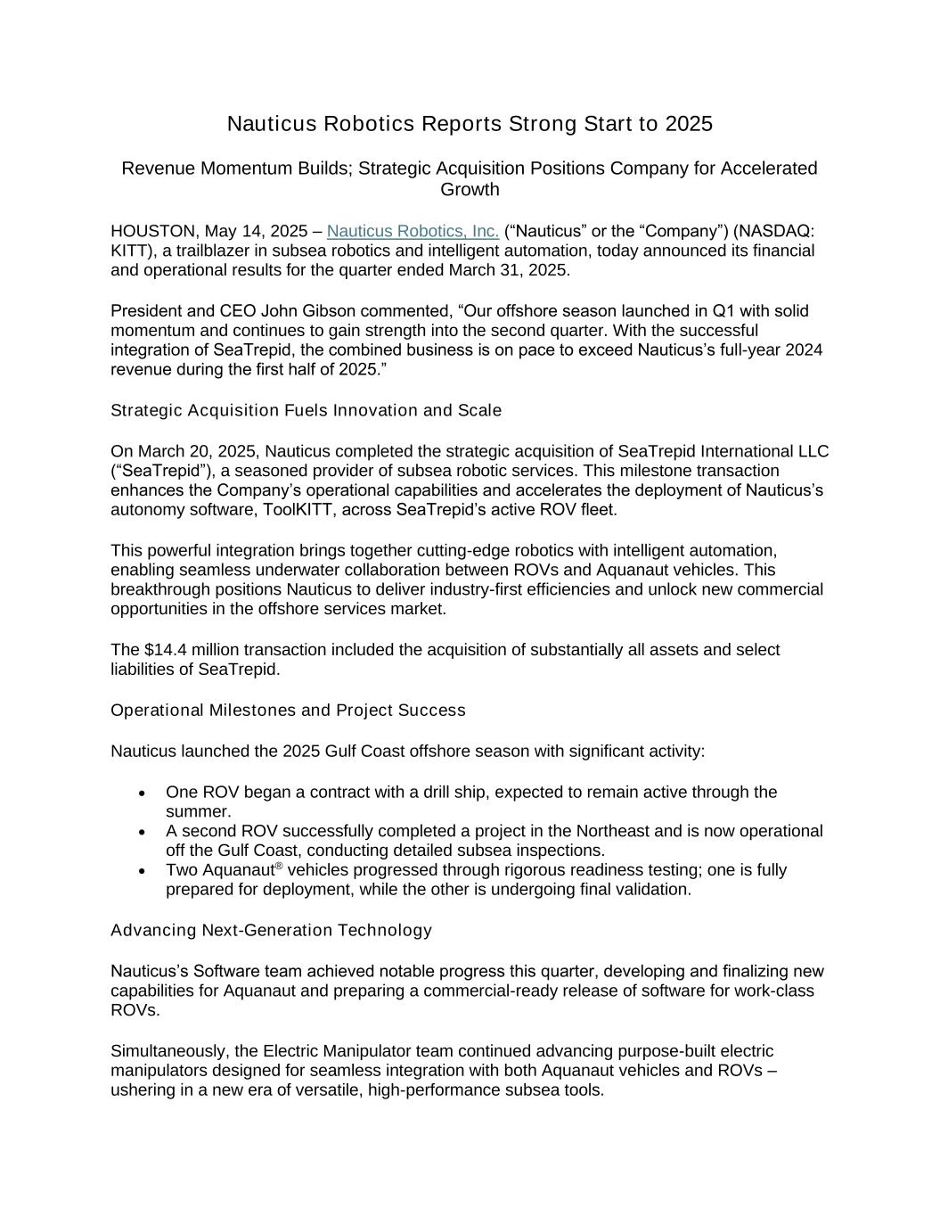 Nauticus Robotics Reports Strong Start to 2025 Revenue Momentum Builds; Strategic Acquisition Positions Company for Accelerated Growth HOUSTON, May 14, 2025 – Nauticus Robotics, Inc. (“Nauticus” or the “Company”) (NASDAQ: KITT), a trailblazer in subsea robotics and intelligent automation, today announced its financial and operational results for the quarter ended March 31, 2025. President and CEO John Gibson commented, “Our offshore season launched in Q1 with solid momentum and continues to gain strength into the second quarter. With the successful integration of SeaTrepid, the combined business is on pace to exceed Nauticus’s full-year 2024 revenue during the first half of 2025.” Strategic Acquisition Fuels Innovation and Scale On March 20, 2025, Nauticus completed the strategic acquisition of SeaTrepid International LLC (“SeaTrepid”), a seasoned provider of subsea robotic services. This milestone transaction enhances the Company’s operational capabilities and accelerates the deployment of Nauticus’s autonomy software, ToolKITT, across SeaTrepid’s active ROV fleet. This powerful integration brings together cutting-edge robotics with intelligent automation, enabling seamless underwater collaboration between ROVs and Aquanaut vehicles. This breakthrough positions Nauticus to deliver industry-first efficiencies and unlock new commercial opportunities in the offshore services market. The $14.4 million transaction included the acquisition of substantially all assets and select liabilities of SeaTrepid. Operational Milestones and Project Success Nauticus launched the 2025 Gulf Coast offshore season with significant activity: • One ROV began a contract with a drill ship, expected to remain active through the summer. • A second ROV successfully completed a project in the Northeast and is now operational off the Gulf Coast, conducting detailed subsea inspections. • Two Aquanaut® vehicles progressed through rigorous readiness testing; one is fully prepared for deployment, while the other is undergoing final validation. Advancing Next-Generation Technology Nauticus’s Software team achieved notable progress this quarter, developing and finalizing new capabilities for Aquanaut and preparing a commercial-ready release of software for work-class ROVs. Simultaneously, the Electric Manipulator team continued advancing purpose-built electric manipulators designed for seamless integration with both Aquanaut vehicles and ROVs – ushering in a new era of versatile, high-performance subsea tools.