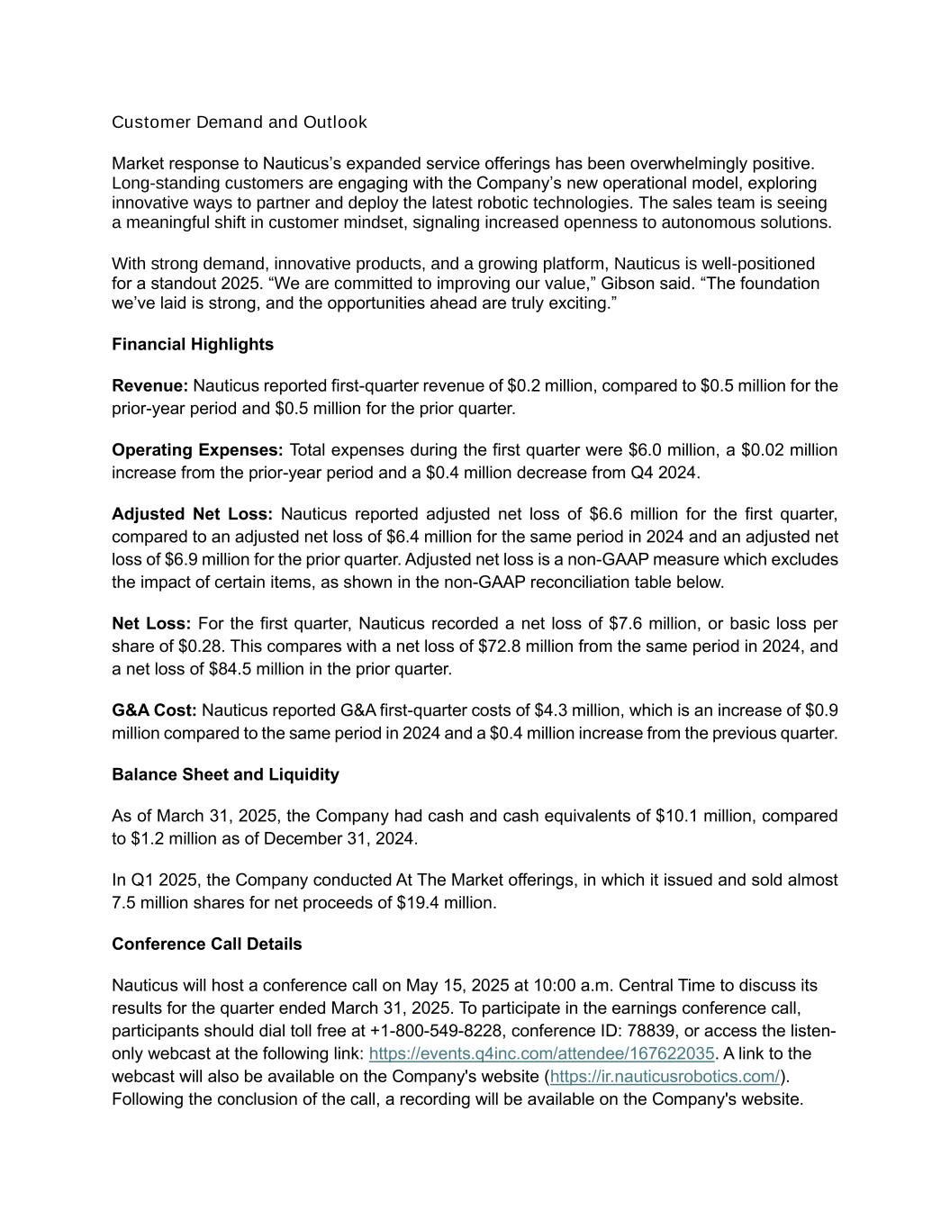 Customer Demand and Outlook Market response to Nauticus’s expanded service offerings has been overwhelmingly positive. Long-standing customers are engaging with the Company’s new operational model, exploring innovative ways to partner and deploy the latest robotic technologies. The sales team is seeing a meaningful shift in customer mindset, signaling increased openness to autonomous solutions. With strong demand, innovative products, and a growing platform, Nauticus is well-positioned for a standout 2025. “We are committed to improving our value,” Gibson said. “The foundation we’ve laid is strong, and the opportunities ahead are truly exciting.” Financial Highlights Revenue: Nauticus reported first-quarter revenue of $0.2 million, compared to $0.5 million for the prior-year period and $0.5 million for the prior quarter. Operating Expenses: Total expenses during the first quarter were $6.0 million, a $0.02 million increase from the prior-year period and a $0.4 million decrease from Q4 2024. Adjusted Net Loss: Nauticus reported adjusted net loss of $6.6 million for the first quarter, compared to an adjusted net loss of $6.4 million for the same period in 2024 and an adjusted net loss of $6.9 million for the prior quarter. Adjusted net loss is a non-GAAP measure which excludes the impact of certain items, as shown in the non-GAAP reconciliation table below. Net Loss: For the first quarter, Nauticus recorded a net loss of $7.6 million, or basic loss per share of $0.28. This compares with a net loss of $72.8 million from the same period in 2024, and a net loss of $84.5 million in the prior quarter. G&A Cost: Nauticus reported G&A first-quarter costs of $4.3 million, which is an increase of $0.9 million compared to the same period in 2024 and a $0.4 million increase from the previous quarter. Balance Sheet and Liquidity As of March 31, 2025, the Company had cash and cash equivalents of $10.1 million, compared to $1.2 million as of December 31, 2024. In Q1 2025, the Company conducted At The Market offerings, in which it issued and sold almost 7.5 million shares for net proceeds of $19.4 million. Conference Call Details Nauticus will host a conference call on May 15, 2025 at 10:00 a.m. Central Time to discuss its results for the quarter ended March 31, 2025. To participate in the earnings conference call, participants should dial toll free at +1-800-549-8228, conference ID: 78839, or access the listen- only webcast at the following link: https://events.q4inc.com/attendee/167622035. A link to the webcast will also be available on the Company's website (https://ir.nauticusrobotics.com/). Following the conclusion of the call, a recording will be available on the Company's website.