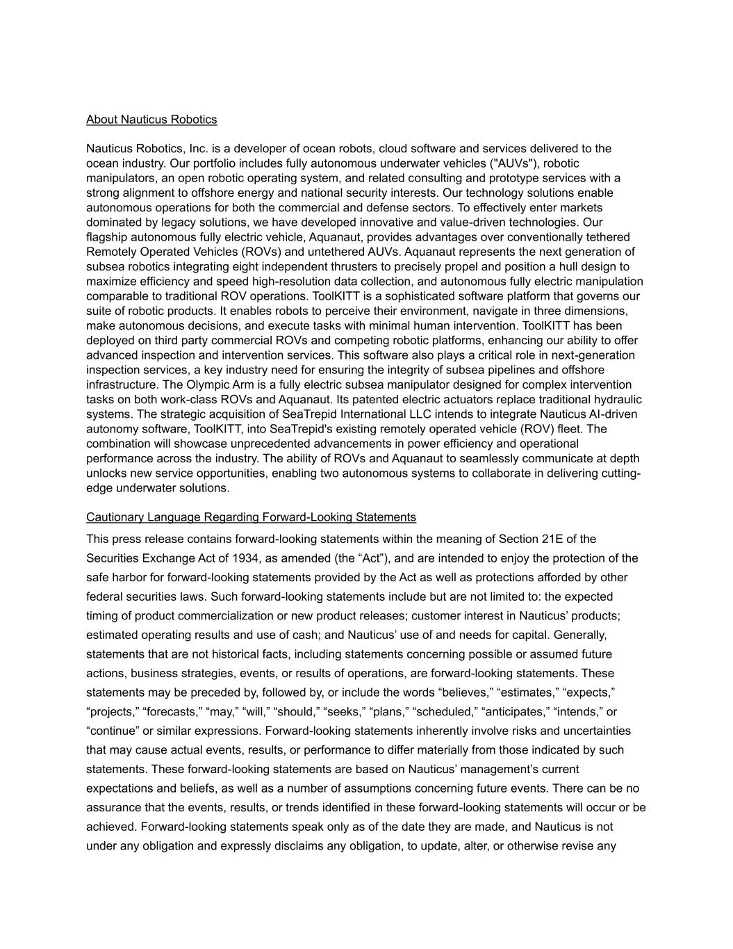 About Nauticus Robotics Nauticus Robotics, Inc. is a developer of ocean robots, cloud software and services delivered to the ocean industry. Our portfolio includes fully autonomous underwater vehicles ("AUVs"), robotic manipulators, an open robotic operating system, and related consulting and prototype services with a strong alignment to offshore energy and national security interests. Our technology solutions enable autonomous operations for both the commercial and defense sectors. To effectively enter markets dominated by legacy solutions, we have developed innovative and value-driven technologies. Our flagship autonomous fully electric vehicle, Aquanaut, provides advantages over conventionally tethered Remotely Operated Vehicles (ROVs) and untethered AUVs. Aquanaut represents the next generation of subsea robotics integrating eight independent thrusters to precisely propel and position a hull design to maximize efficiency and speed high-resolution data collection, and autonomous fully electric manipulation comparable to traditional ROV operations. ToolKITT is a sophisticated software platform that governs our suite of robotic products. It enables robots to perceive their environment, navigate in three dimensions, make autonomous decisions, and execute tasks with minimal human intervention. ToolKITT has been deployed on third party commercial ROVs and competing robotic platforms, enhancing our ability to offer advanced inspection and intervention services. This software also plays a critical role in next-generation inspection services, a key industry need for ensuring the integrity of subsea pipelines and offshore infrastructure. The Olympic Arm is a fully electric subsea manipulator designed for complex intervention tasks on both work-class ROVs and Aquanaut. Its patented electric actuators replace traditional hydraulic systems. The strategic acquisition of SeaTrepid International LLC intends to integrate Nauticus AI-driven autonomy software, ToolKITT, into SeaTrepid's existing remotely operated vehicle (ROV) fleet. The combination will showcase unprecedented advancements in power efficiency and operational performance across the industry. The ability of ROVs and Aquanaut to seamlessly communicate at depth unlocks new service opportunities, enabling two autonomous systems to collaborate in delivering cutting- edge underwater solutions. Cautionary Language Regarding Forward-Looking Statements This press release contains forward-looking statements within the meaning of Section 21E of the Securities Exchange Act of 1934, as amended (the “Act”), and are intended to enjoy the protection of the safe harbor for forward-looking statements provided by the Act as well as protections afforded by other federal securities laws. Such forward-looking statements include but are not limited to: the expected timing of product commercialization or new product releases; customer interest in Nauticus’ products; estimated operating results and use of cash; and Nauticus’ use of and needs for capital. Generally, statements that are not historical facts, including statements concerning possible or assumed future actions, business strategies, events, or results of operations, are forward-looking statements. These statements may be preceded by, followed by, or include the words “believes,” “estimates,” “expects,” “projects,” “forecasts,” “may,” “will,” “should,” “seeks,” “plans,” “scheduled,” “anticipates,” “intends,” or “continue” or similar expressions. Forward-looking statements inherently involve risks and uncertainties that may cause actual events, results, or performance to differ materially from those indicated by such statements. These forward-looking statements are based on Nauticus’ management’s current expectations and beliefs, as well as a number of assumptions concerning future events. There can be no assurance that the events, results, or trends identified in these forward-looking statements will occur or be achieved. Forward-looking statements speak only as of the date they are made, and Nauticus is not under any obligation and expressly disclaims any obligation, to update, alter, or otherwise revise any