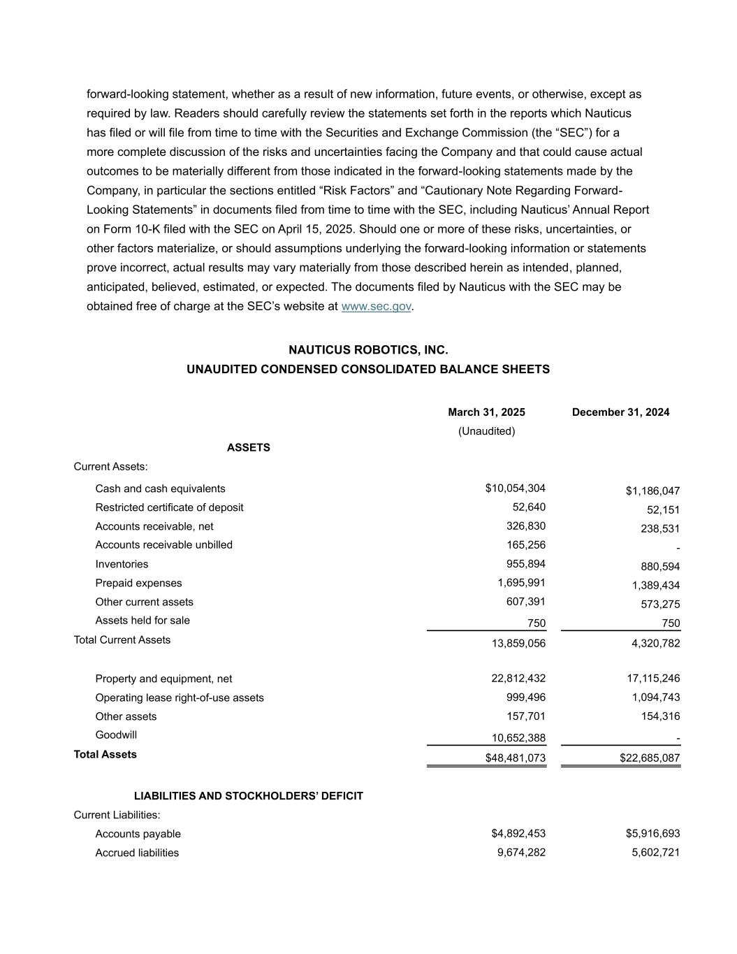 forward-looking statement, whether as a result of new information, future events, or otherwise, except as required by law. Readers should carefully review the statements set forth in the reports which Nauticus has filed or will file from time to time with the Securities and Exchange Commission (the “SEC”) for a more complete discussion of the risks and uncertainties facing the Company and that could cause actual outcomes to be materially different from those indicated in the forward-looking statements made by the Company, in particular the sections entitled “Risk Factors” and “Cautionary Note Regarding Forward- Looking Statements” in documents filed from time to time with the SEC, including Nauticus’ Annual Report on Form 10-K filed with the SEC on April 15, 2025. Should one or more of these risks, uncertainties, or other factors materialize, or should assumptions underlying the forward-looking information or statements prove incorrect, actual results may vary materially from those described herein as intended, planned, anticipated, believed, estimated, or expected. The documents filed by Nauticus with the SEC may be obtained free of charge at the SEC’s website at www.sec.gov. NAUTICUS ROBOTICS, INC. UNAUDITED CONDENSED CONSOLIDATED BALANCE SHEETS March 31, 2025 December 31, 2024 (Unaudited) ASSETS Current Assets: Cash and cash equivalents $10,054,304 $1,186,047 Restricted certificate of deposit 52,640 52,151 Accounts receivable, net 326,830 238,531 Accounts receivable unbilled 165,256 - Inventories 955,894 880,594 Prepaid expenses 1,695,991 1,389,434 Other current assets 607,391 573,275 Assets held for sale 750 750 Total Current Assets 13,859,056 4,320,782 Property and equipment, net 22,812,432 17,115,246 Operating lease right-of-use assets 999,496 1,094,743 Other assets 157,701 154,316 Goodwill 10,652,388 - Total Assets $48,481,073 $22,685,087 LIABILITIES AND STOCKHOLDERS’ DEFICIT Current Liabilities: Accounts payable $4,892,453 $5,916,693 Accrued liabilities 9,674,282 5,602,721