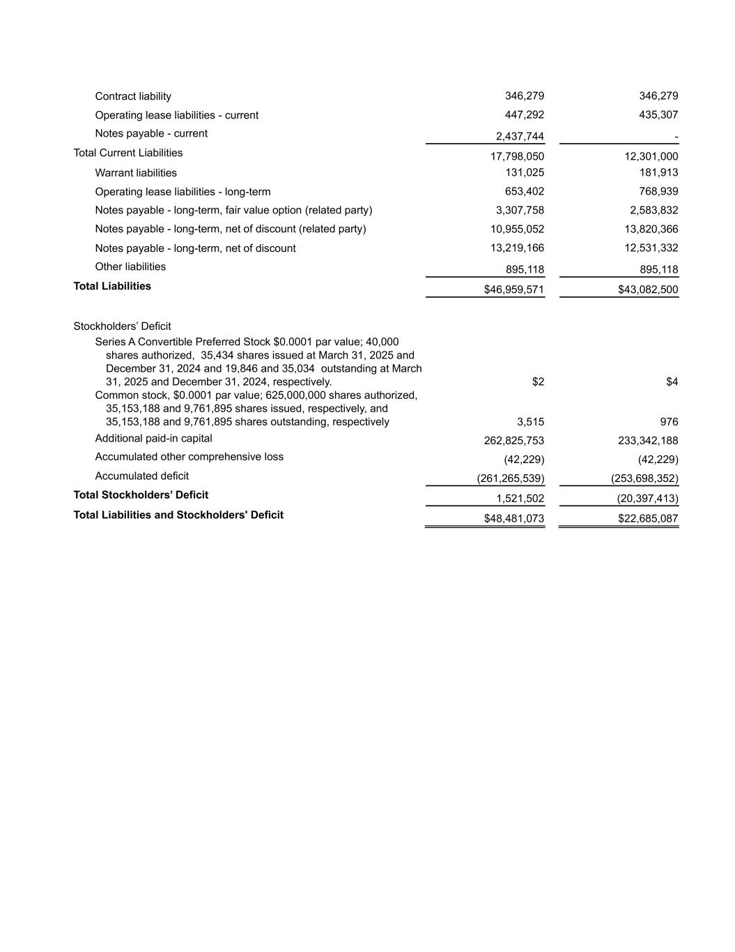 Contract liability 346,279 346,279 Operating lease liabilities - current 447,292 435,307 Notes payable - current 2,437,744 - Total Current Liabilities 17,798,050 12,301,000 Warrant liabilities 131,025 181,913 Operating lease liabilities - long-term 653,402 768,939 Notes payable - long-term, fair value option (related party) 3,307,758 2,583,832 Notes payable - long-term, net of discount (related party) 10,955,052 13,820,366 Notes payable - long-term, net of discount 13,219,166 12,531,332 Other liabilities 895,118 895,118 Total Liabilities $46,959,571 $43,082,500 Stockholders’ Deficit Series A Convertible Preferred Stock $0.0001 par value; 40,000 shares authorized, 35,434 shares issued at March 31, 2025 and December 31, 2024 and 19,846 and 35,034 outstanding at March 31, 2025 and December 31, 2024, respectively. $2 $4 Common stock, $0.0001 par value; 625,000,000 shares authorized, 35,153,188 and 9,761,895 shares issued, respectively, and 35,153,188 and 9,761,895 shares outstanding, respectively 3,515 976 Additional paid-in capital 262,825,753 233,342,188 Accumulated other comprehensive loss (42,229) (42,229) Accumulated deficit (261,265,539) (253,698,352) Total Stockholders’ Deficit 1,521,502 (20,397,413) Total Liabilities and Stockholders' Deficit $48,481,073 $22,685,087