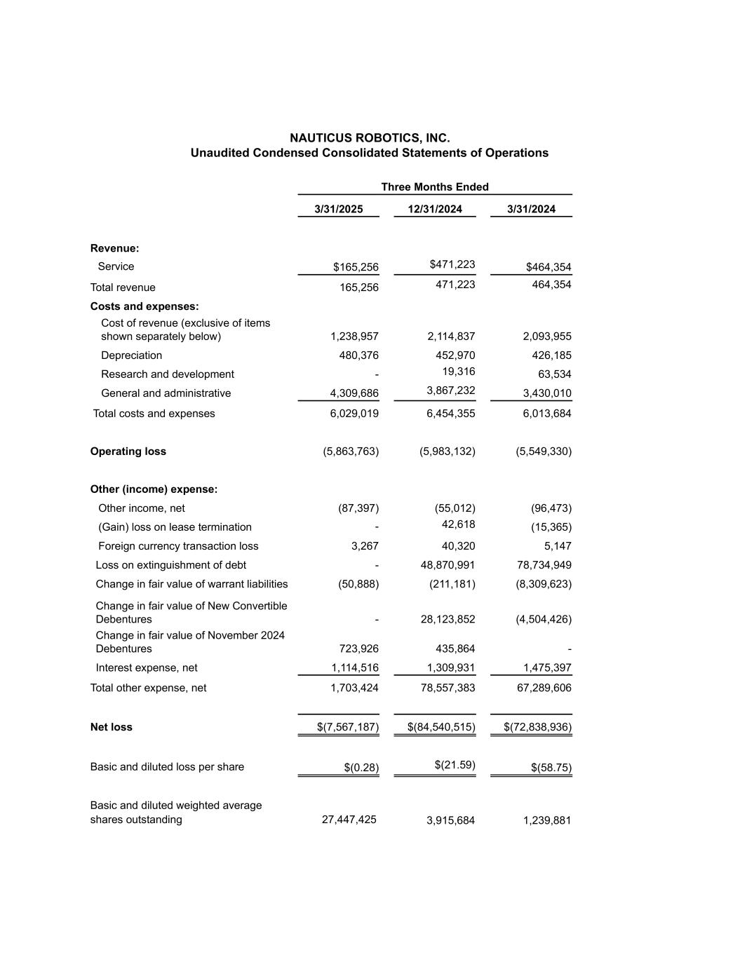 NAUTICUS ROBOTICS, INC. Unaudited Condensed Consolidated Statements of Operations Three Months Ended 3/31/2025 12/31/2024 3/31/2024 Revenue: Service $165,256 $471,223 $464,354 Total revenue 165,256 471,223 464,354 Costs and expenses: Cost of revenue (exclusive of items shown separately below) 1,238,957 2,114,837 2,093,955 Depreciation 480,376 452,970 426,185 Research and development - 19,316 63,534 General and administrative 4,309,686 3,867,232 3,430,010 Total costs and expenses 6,029,019 6,454,355 6,013,684 Operating loss (5,863,763) (5,983,132) (5,549,330) Other (income) expense: Other income, net (87,397) (55,012) (96,473) (Gain) loss on lease termination - 42,618 (15,365) Foreign currency transaction loss 3,267 40,320 5,147 Loss on extinguishment of debt - 48,870,991 78,734,949 Change in fair value of warrant liabilities (50,888) (211,181) (8,309,623) Change in fair value of New Convertible Debentures - 28,123,852 (4,504,426) Change in fair value of November 2024 Debentures 723,926 435,864 - Interest expense, net 1,114,516 1,309,931 1,475,397 Total other expense, net 1,703,424 78,557,383 67,289,606 Net loss $(7,567,187) $(84,540,515) $(72,838,936) Basic and diluted loss per share $(0.28) $(21.59) $(58.75) Basic and diluted weighted average shares outstanding 27,447,425 3,915,684 1,239,881
