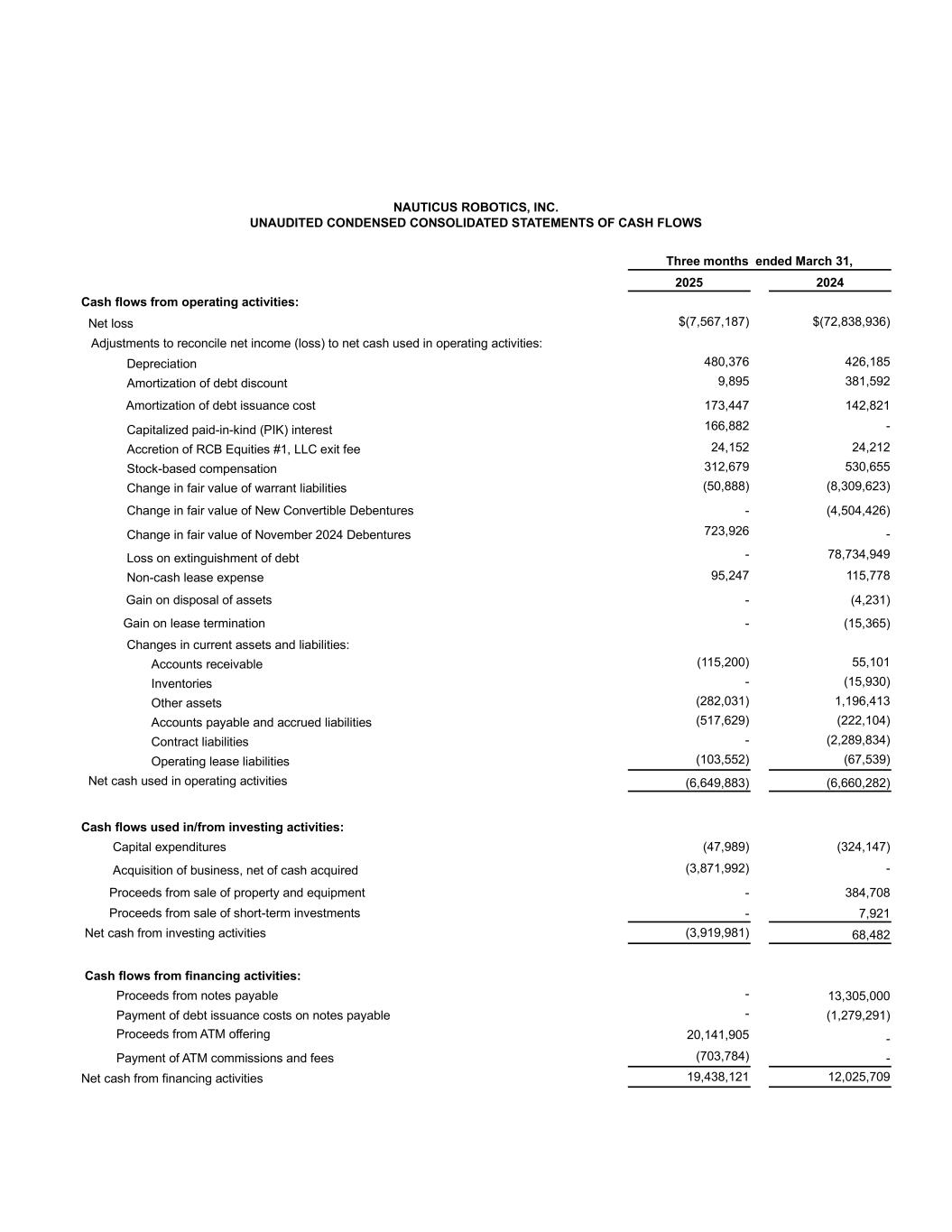NAUTICUS ROBOTICS, INC. UNAUDITED CONDENSED CONSOLIDATED STATEMENTS OF CASH FLOWS Three months ended March 31, 2025 2024 Cash flows from operating activities: Net loss $(7,567,187) $(72,838,936) Adjustments to reconcile net income (loss) to net cash used in operating activities: Depreciation 480,376 426,185 Amortization of debt discount 9,895 381,592 Amortization of debt issuance cost 173,447 142,821 Capitalized paid-in-kind (PIK) interest 166,882 - Accretion of RCB Equities #1, LLC exit fee 24,152 24,212 Stock-based compensation 312,679 530,655 Change in fair value of warrant liabilities (50,888) (8,309,623) Change in fair value of New Convertible Debentures - (4,504,426) Change in fair value of November 2024 Debentures 723,926 - Loss on extinguishment of debt - 78,734,949 Non-cash lease expense 95,247 115,778 Gain on disposal of assets - (4,231) Gain on lease termination - (15,365) Changes in current assets and liabilities: Accounts receivable (115,200) 55,101 Inventories - (15,930) Other assets (282,031) 1,196,413 Accounts payable and accrued liabilities (517,629) (222,104) Contract liabilities - (2,289,834) Operating lease liabilities (103,552) (67,539) Net cash used in operating activities (6,649,883) (6,660,282) Cash flows used in/from investing activities: Capital expenditures (47,989) (324,147) Acquisition of business, net of cash acquired (3,871,992) - Proceeds from sale of property and equipment - 384,708 Proceeds from sale of short-term investments - 7,921 Net cash from investing activities (3,919,981) 68,482 Cash flows from financing activities: Proceeds from notes payable - 13,305,000 Payment of debt issuance costs on notes payable - (1,279,291) Proceeds from ATM offering 20,141,905 - Payment of ATM commissions and fees (703,784) - Net cash from financing activities 19,438,121 12,025,709