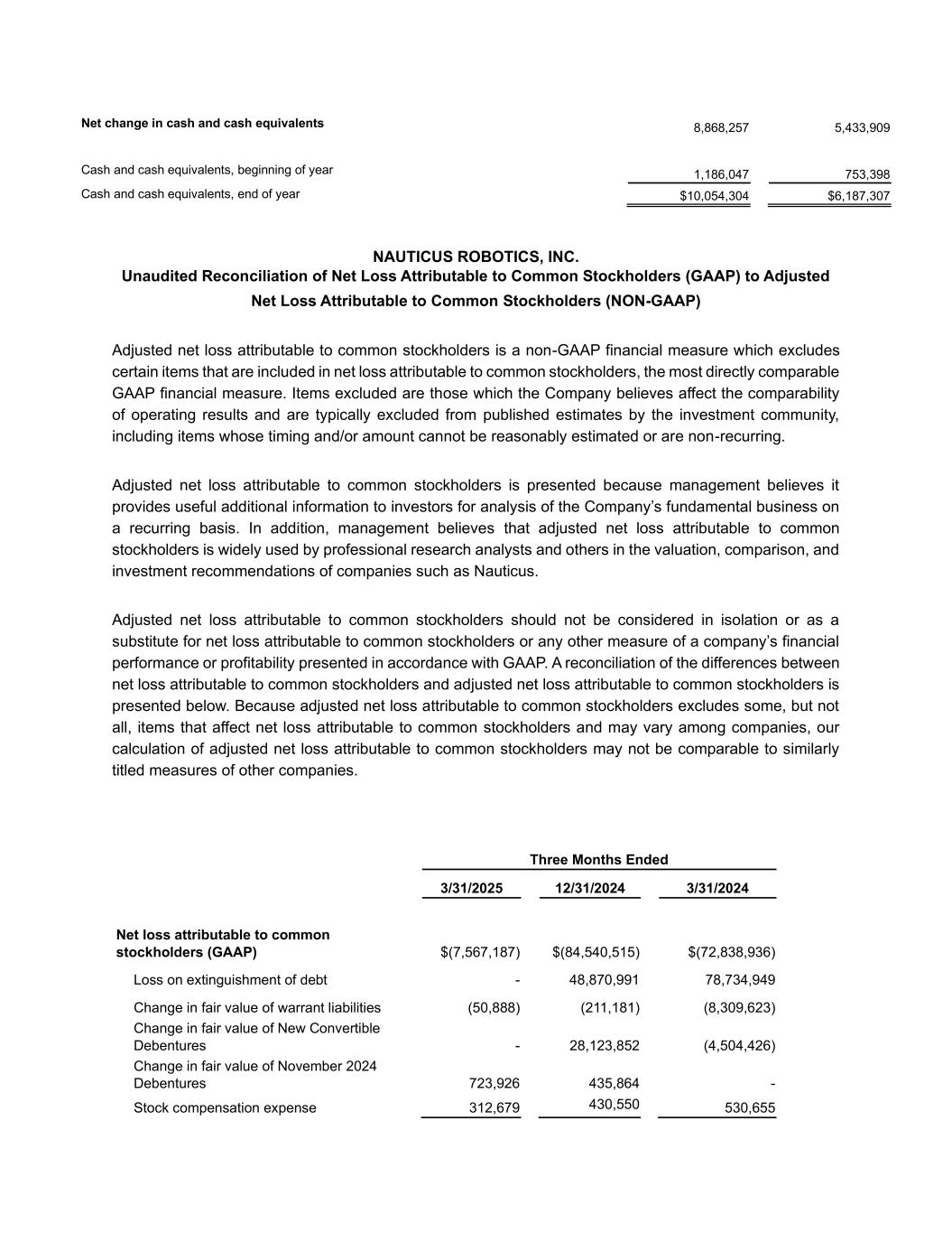 Net change in cash and cash equivalents 8,868,257 5,433,909 Cash and cash equivalents, beginning of year 1,186,047 753,398 Cash and cash equivalents, end of year $10,054,304 $6,187,307 NAUTICUS ROBOTICS, INC. Unaudited Reconciliation of Net Loss Attributable to Common Stockholders (GAAP) to Adjusted Net Loss Attributable to Common Stockholders (NON-GAAP) Adjusted net loss attributable to common stockholders is a non-GAAP financial measure which excludes certain items that are included in net loss attributable to common stockholders, the most directly comparable GAAP financial measure. Items excluded are those which the Company believes affect the comparability of operating results and are typically excluded from published estimates by the investment community, including items whose timing and/or amount cannot be reasonably estimated or are non-recurring. Adjusted net loss attributable to common stockholders is presented because management believes it provides useful additional information to investors for analysis of the Company’s fundamental business on a recurring basis. In addition, management believes that adjusted net loss attributable to common stockholders is widely used by professional research analysts and others in the valuation, comparison, and investment recommendations of companies such as Nauticus. Adjusted net loss attributable to common stockholders should not be considered in isolation or as a substitute for net loss attributable to common stockholders or any other measure of a company’s financial performance or profitability presented in accordance with GAAP. A reconciliation of the differences between net loss attributable to common stockholders and adjusted net loss attributable to common stockholders is presented below. Because adjusted net loss attributable to common stockholders excludes some, but not all, items that affect net loss attributable to common stockholders and may vary among companies, our calculation of adjusted net loss attributable to common stockholders may not be comparable to similarly titled measures of other companies. Three Months Ended 3/31/2025 12/31/2024 3/31/2024 Net loss attributable to common stockholders (GAAP) $(7,567,187) $(84,540,515) $(72,838,936) Loss on extinguishment of debt - 48,870,991 78,734,949 Change in fair value of warrant liabilities (50,888) (211,181) (8,309,623) Change in fair value of New Convertible Debentures - 28,123,852 (4,504,426) Change in fair value of November 2024 Debentures 723,926 435,864 - Stock compensation expense 312,679 430,550 530,655