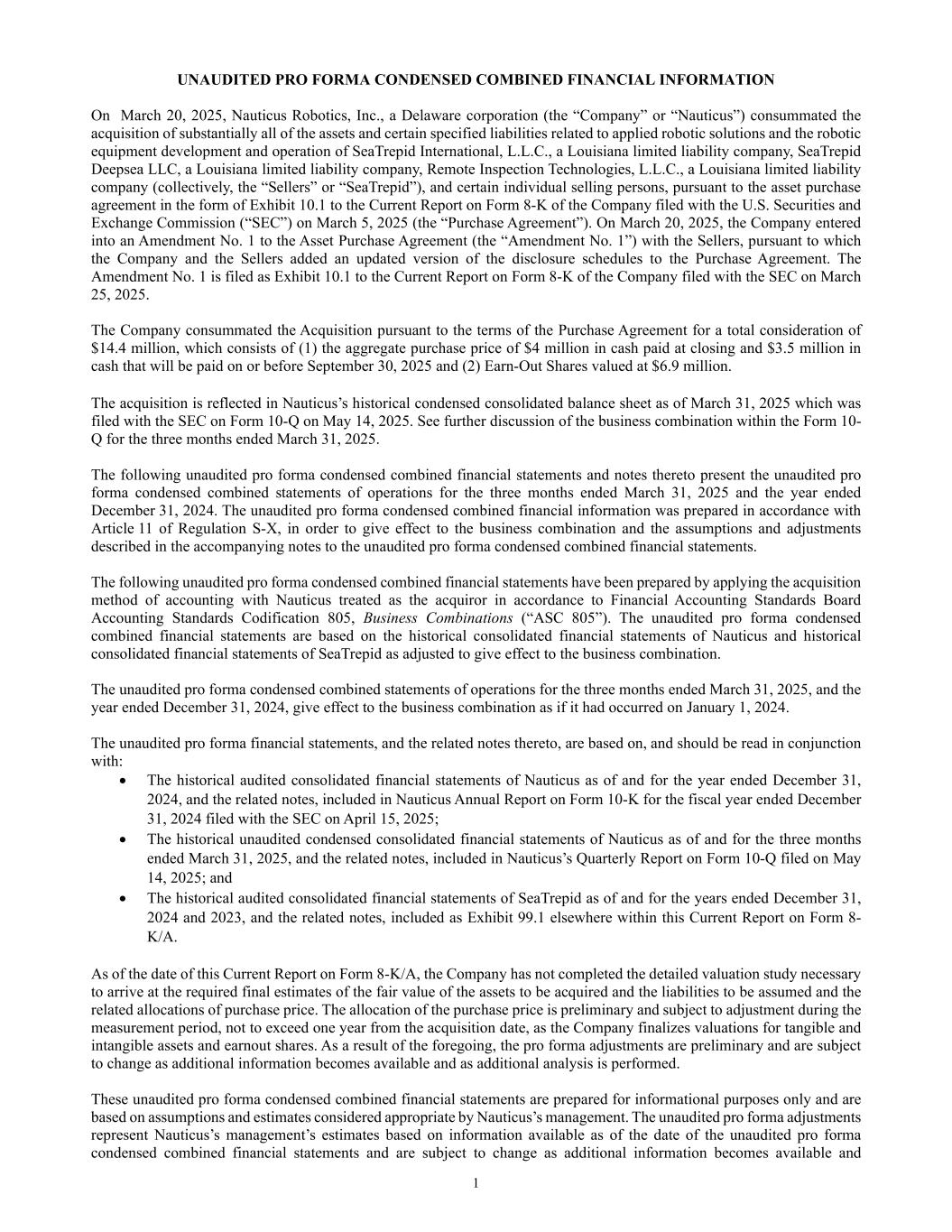 1 UNAUDITED PRO FORMA CONDENSED COMBINED FINANCIAL INFORMATION On March 20, 2025, Nauticus Robotics, Inc., a Delaware corporation (the “Company” or “Nauticus”) consummated the acquisition of substantially all of the assets and certain specified liabilities related to applied robotic solutions and the robotic equipment development and operation of SeaTrepid International, L.L.C., a Louisiana limited liability company, SeaTrepid Deepsea LLC, a Louisiana limited liability company, Remote Inspection Technologies, L.L.C., a Louisiana limited liability company (collectively, the “Sellers” or “SeaTrepid”), and certain individual selling persons, pursuant to the asset purchase agreement in the form of Exhibit 10.1 to the Current Report on Form 8-K of the Company filed with the U.S. Securities and Exchange Commission (“SEC”) on March 5, 2025 (the “Purchase Agreement”). On March 20, 2025, the Company entered into an Amendment No. 1 to the Asset Purchase Agreement (the “Amendment No. 1”) with the Sellers, pursuant to which the Company and the Sellers added an updated version of the disclosure schedules to the Purchase Agreement. The Amendment No. 1 is filed as Exhibit 10.1 to the Current Report on Form 8-K of the Company filed with the SEC on March 25, 2025. The Company consummated the Acquisition pursuant to the terms of the Purchase Agreement for a total consideration of $14.4 million, which consists of (1) the aggregate purchase price of $4 million in cash paid at closing and $3.5 million in cash that will be paid on or before September 30, 2025 and (2) Earn-Out Shares valued at $6.9 million. The acquisition is reflected in Nauticus’s historical condensed consolidated balance sheet as of March 31, 2025 which was filed with the SEC on Form 10-Q on May 14, 2025. See further discussion of the business combination within the Form 10- Q for the three months ended March 31, 2025. The following unaudited pro forma condensed combined financial statements and notes thereto present the unaudited pro forma condensed combined statements of operations for the three months ended March 31, 2025 and the year ended December 31, 2024. The unaudited pro forma condensed combined financial information was prepared in accordance with Article 11 of Regulation S-X, in order to give effect to the business combination and the assumptions and adjustments described in the accompanying notes to the unaudited pro forma condensed combined financial statements. The following unaudited pro forma condensed combined financial statements have been prepared by applying the acquisition method of accounting with Nauticus treated as the acquiror in accordance to Financial Accounting Standards Board Accounting Standards Codification 805, Business Combinations (“ASC 805”). The unaudited pro forma condensed combined financial statements are based on the historical consolidated financial statements of Nauticus and historical consolidated financial statements of SeaTrepid as adjusted to give effect to the business combination. The unaudited pro forma condensed combined statements of operations for the three months ended March 31, 2025, and the year ended December 31, 2024, give effect to the business combination as if it had occurred on January 1, 2024. The unaudited pro forma financial statements, and the related notes thereto, are based on, and should be read in conjunction with: • The historical audited consolidated financial statements of Nauticus as of and for the year ended December 31, 2024, and the related notes, included in Nauticus Annual Report on Form 10-K for the fiscal year ended December 31, 2024 filed with the SEC on April 15, 2025; • The historical unaudited condensed consolidated financial statements of Nauticus as of and for the three months ended March 31, 2025, and the related notes, included in Nauticus’s Quarterly Report on Form 10-Q filed on May 14, 2025; and • The historical audited consolidated financial statements of SeaTrepid as of and for the years ended December 31, 2024 and 2023, and the related notes, included as Exhibit 99.1 elsewhere within this Current Report on Form 8- K/A. As of the date of this Current Report on Form 8-K/A, the Company has not completed the detailed valuation study necessary to arrive at the required final estimates of the fair value of the assets to be acquired and the liabilities to be assumed and the related allocations of purchase price. The allocation of the purchase price is preliminary and subject to adjustment during the measurement period, not to exceed one year from the acquisition date, as the Company finalizes valuations for tangible and intangible assets and earnout shares. As a result of the foregoing, the pro forma adjustments are preliminary and are subject to change as additional information becomes available and as additional analysis is performed. These unaudited pro forma condensed combined financial statements are prepared for informational purposes only and are based on assumptions and estimates considered appropriate by Nauticus’s management. The unaudited pro forma adjustments represent Nauticus’s management’s estimates based on information available as of the date of the unaudited pro forma condensed combined financial statements and are subject to change as additional information becomes available and