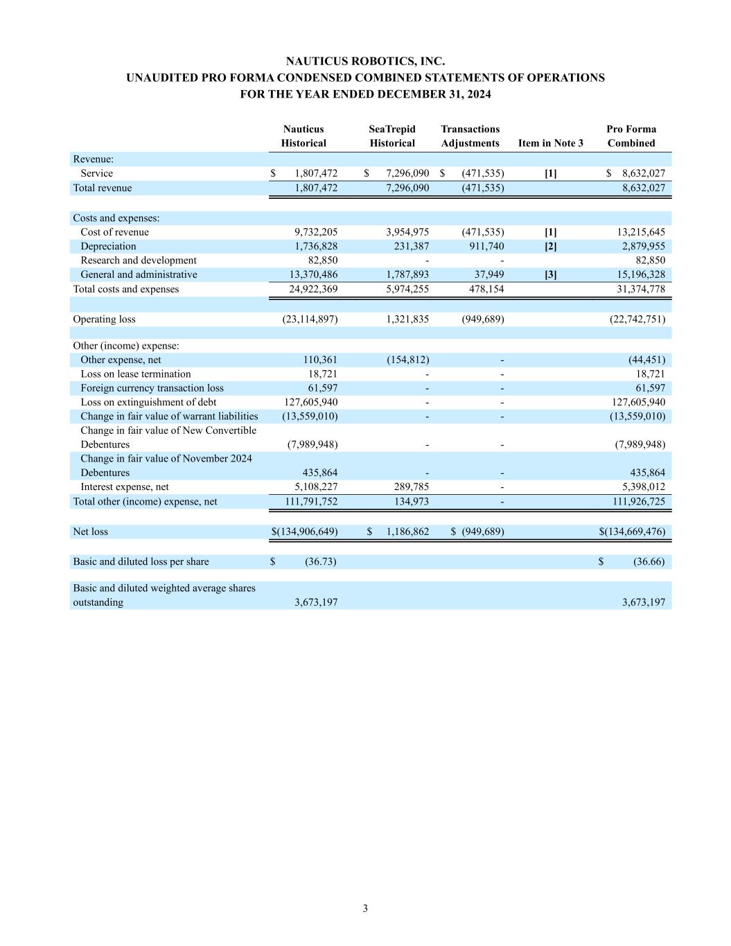 3 NAUTICUS ROBOTICS, INC. UNAUDITED PRO FORMA CONDENSED COMBINED STATEMENTS OF OPERATIONS FOR THE YEAR ENDED DECEMBER 31, 2024 Nauticus Historical SeaTrepid Historical Transactions Adjustments Item in Note 3 Pro Forma Combined Revenue: Service $ 1,807,472 $ 7,296,090 $ (471,535) [1] $ 8,632,027 Total revenue 1,807,472 7,296,090 (471,535) 8,632,027 Costs and expenses: Cost of revenue 9,732,205 3,954,975 (471,535) [1] 13,215,645 Depreciation 1,736,828 231,387 911,740 [2] 2,879,955 Research and development 82,850 - - 82,850 General and administrative 13,370,486 1,787,893 37,949 [3] 15,196,328 Total costs and expenses 24,922,369 5,974,255 478,154 31,374,778 Operating loss (23,114,897) 1,321,835 (949,689) (22,742,751) Other (income) expense: Other expense, net 110,361 (154,812) - (44,451) Loss on lease termination 18,721 - - 18,721 Foreign currency transaction loss 61,597 - - 61,597 Loss on extinguishment of debt 127,605,940 - - 127,605,940 Change in fair value of warrant liabilities (13,559,010) - - (13,559,010) Change in fair value of New Convertible Debentures (7,989,948) - - (7,989,948) Change in fair value of November 2024 Debentures 435,864 - - 435,864 Interest expense, net 5,108,227 289,785 - 5,398,012 Total other (income) expense, net 111,791,752 134,973 - 111,926,725 Net loss $(134,906,649) $ 1,186,862 $ (949,689) $(134,669,476) Basic and diluted loss per share $ (36.73) $ (36.66) Basic and diluted weighted average shares outstanding 3,673,197 3,673,197