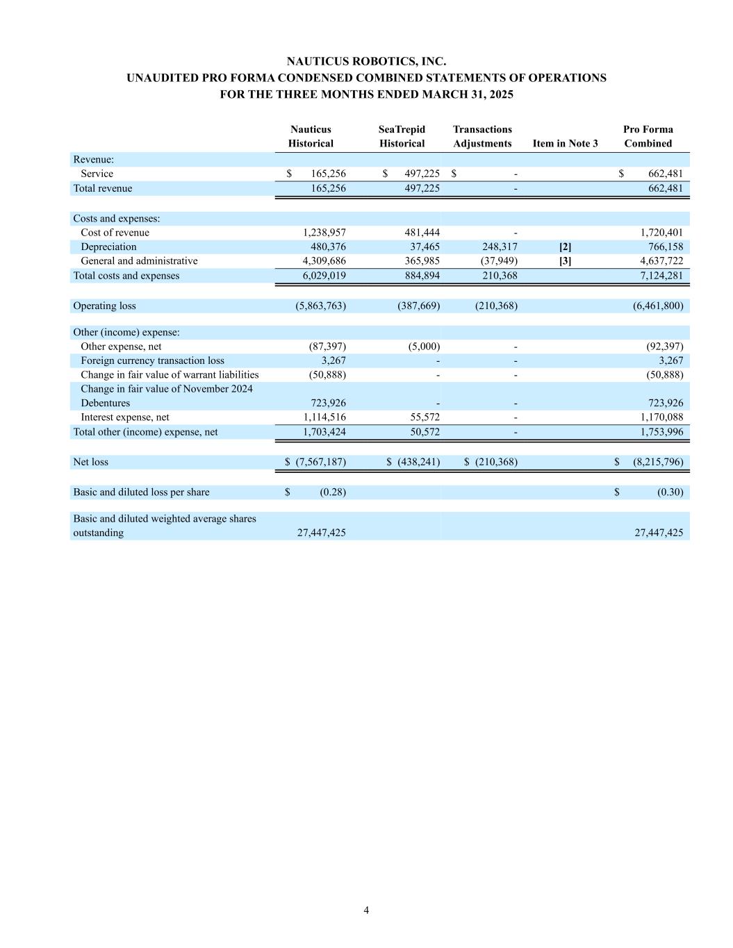 4 NAUTICUS ROBOTICS, INC. UNAUDITED PRO FORMA CONDENSED COMBINED STATEMENTS OF OPERATIONS FOR THE THREE MONTHS ENDED MARCH 31, 2025 Nauticus Historical SeaTrepid Historical Transactions Adjustments Item in Note 3 Pro Forma Combined Revenue: Service $ 165,256 $ 497,225 $ - $ 662,481 Total revenue 165,256 497,225 - 662,481 Costs and expenses: Cost of revenue 1,238,957 481,444 - 1,720,401 Depreciation 480,376 37,465 248,317 [2] 766,158 General and administrative 4,309,686 365,985 (37,949) [3] 4,637,722 Total costs and expenses 6,029,019 884,894 210,368 7,124,281 Operating loss (5,863,763) (387,669) (210,368) (6,461,800) Other (income) expense: Other expense, net (87,397) (5,000) - (92,397) Foreign currency transaction loss 3,267 - - 3,267 Change in fair value of warrant liabilities (50,888) - - (50,888) Change in fair value of November 2024 Debentures 723,926 - - 723,926 Interest expense, net 1,114,516 55,572 - 1,170,088 Total other (income) expense, net 1,703,424 50,572 - 1,753,996 Net loss $ (7,567,187) $ (438,241) $ (210,368) $ (8,215,796) Basic and diluted loss per share $ (0.28) $ (0.30) Basic and diluted weighted average shares outstanding 27,447,425 27,447,425