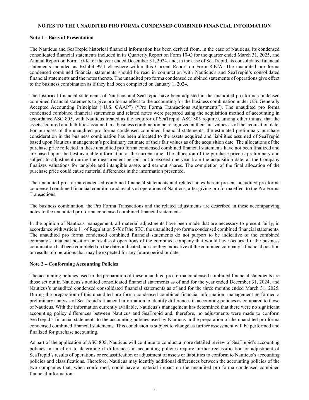 5 NOTES TO THE UNAUDITED PRO FORMA CONDENSED COMBINED FINANCIAL INFORMATION Note 1 – Basis of Presentation The Nauticus and SeaTrepid historical financial information has been derived from, in the case of Nauticus, its condensed consolidated financial statements included in its Quarterly Report on Form 10-Q for the quarter ended March 31, 2025, and Annual Report on Form 10-K for the year ended December 31, 2024, and, in the case of SeaTrepid, its consolidated financial statements included as Exhibit 99.1 elsewhere within this Current Report on Form 8-K/A. The unaudited pro forma condensed combined financial statements should be read in conjunction with Nauticus’s and SeaTrepid’s consolidated financial statements and the notes thereto. The unaudited pro forma condensed combined statements of operations give effect to the business combination as if they had been completed on January 1, 2024. The historical financial statements of Nauticus and SeaTrepid have been adjusted in the unaudited pro forma condensed combined financial statements to give pro forma effect to the accounting for the business combination under U.S. Generally Accepted Accounting Principles (“U.S. GAAP”) (“Pro Forma Transactions Adjustments”). The unaudited pro forma condensed combined financial statements and related notes were prepared using the acquisition method of accounting in accordance ASC 805, with Nauticus treated as the acquiror of SeaTrepid. ASC 805 requires, among other things, that the assets acquired and liabilities assumed in a business combination be recognized at their fair values as of the acquisition date. For purposes of the unaudited pro forma condensed combined financial statements, the estimated preliminary purchase consideration in the business combination has been allocated to the assets acquired and liabilities assumed of SeaTrepid based upon Nauticus management’s preliminary estimate of their fair values as of the acquisition date. The allocations of the purchase price reflected in these unaudited pro forma condensed combined financial statements have not been finalized and are based upon the best available information at the current time. The allocation of the purchase price is preliminary and subject to adjustment during the measurement period, not to exceed one year from the acquisition date, as the Company finalizes valuations for tangible and intangible assets and earnout shares. The completion of the final allocation of the purchase price could cause material differences in the information presented. The unaudited pro forma condensed combined financial statements and related notes herein present unaudited pro forma condensed combined financial condition and results of operations of Nauticus, after giving pro forma effect to the Pro Forma Transactions. The business combination, the Pro Forma Transactions and the related adjustments are described in these accompanying notes to the unaudited pro forma condensed combined financial statements. In the opinion of Nauticus management, all material adjustments have been made that are necessary to present fairly, in accordance with Article 11 of Regulation S-X of the SEC, the unaudited pro forma condensed combined financial statements. The unaudited pro forma condensed combined financial statements do not purport to be indicative of the combined company’s financial position or results of operations of the combined company that would have occurred if the business combination had been completed on the dates indicated, nor are they indicative of the combined company’s financial position or results of operations that may be expected for any future period or date. Note 2 – Conforming Accounting Policies The accounting policies used in the preparation of these unaudited pro forma condensed combined financial statements are those set out in Nauticus’s audited consolidated financial statements as of and for the year ended December 31, 2024, and Nauticus’s unaudited condensed consolidated financial statements as of and for the three months ended March 31, 2025. During the preparation of this unaudited pro forma condensed combined financial information, management performed a preliminary analysis of SeaTrepid’s financial information to identify differences in accounting policies as compared to those of Nauticus. With the information currently available, Nauticus’s management has determined that there were no significant accounting policy differences between Nauticus and SeaTrepid and, therefore, no adjustments were made to conform SeaTrepid’s financial statements to the accounting policies used by Nauticus in the preparation of the unaudited pro forma condensed combined financial statements. This conclusion is subject to change as further assessment will be performed and finalized for purchase accounting. As part of the application of ASC 805, Nauticus will continue to conduct a more detailed review of SeaTrepid’s accounting policies in an effort to determine if differences in accounting policies require further reclassification or adjustment of SeaTrepid’s results of operations or reclassification or adjustment of assets or liabilities to conform to Nauticus’s accounting policies and classifications. Therefore, Nauticus may identify additional differences between the accounting policies of the two companies that, when conformed, could have a material impact on the unaudited pro forma condensed combined financial information.