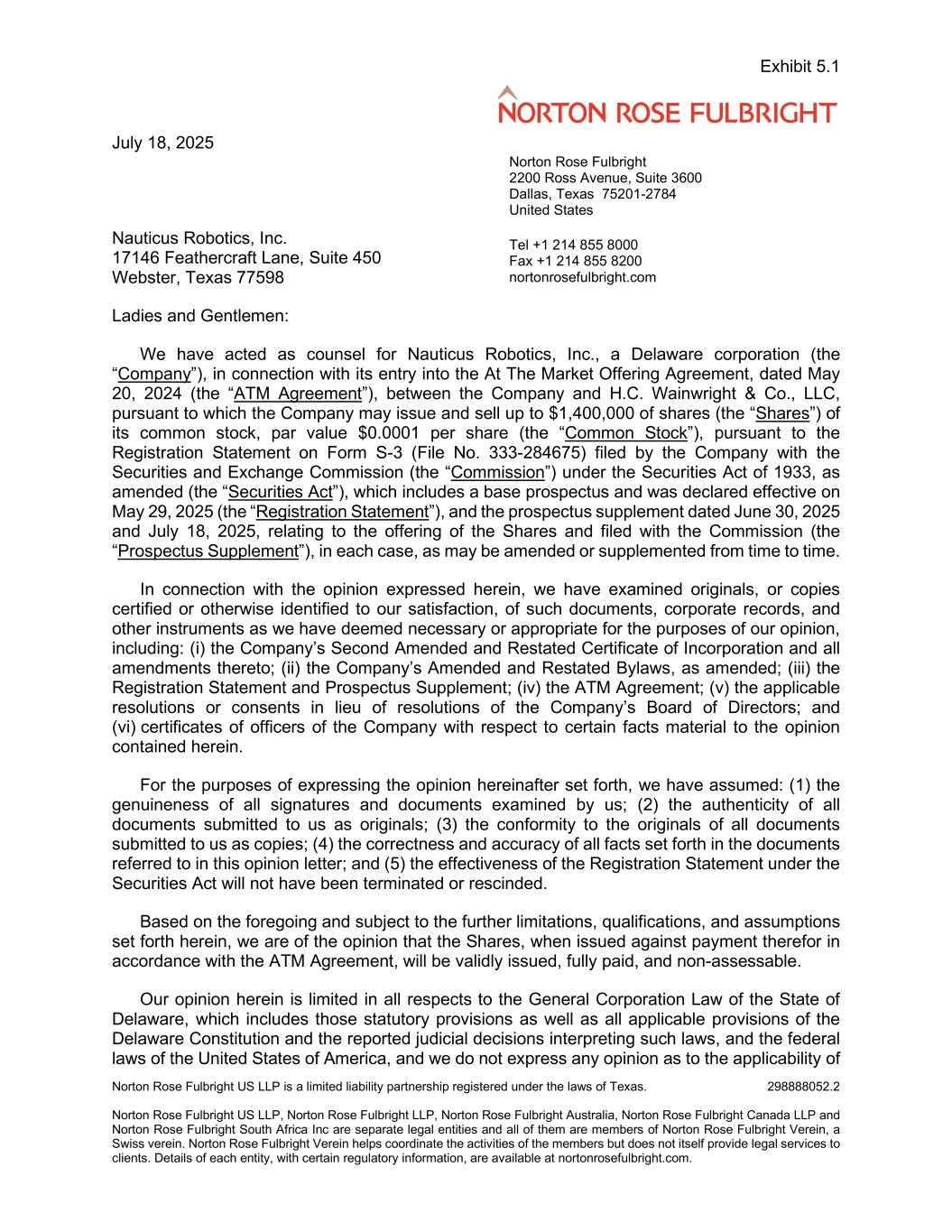Exhibit 5.1 Norton Rose Fulbright US LLP is a limited liability partnership registered under the laws of Texas. 298888052.2 Norton Rose Fulbright US LLP, Norton Rose Fulbright LLP, Norton Rose Fulbright Australia, Norton Rose Fulbright Canada LLP and Norton Rose Fulbright South Africa Inc are separate legal entities and all of them are members of Norton Rose Fulbright Verein, a Swiss verein. Norton Rose Fulbright Verein helps coordinate the activities of the members but does not itself provide legal services to clients. Details of each entity, with certain regulatory information, are available at nortonrosefulbright.com. Norton Rose Fulbright 2200 Ross Avenue, Suite 3600 Dallas, Texas 75201-2784 United States Tel +1 214 855 8000 Fax +1 214 855 8200 nortonrosefulbright.com July 18, 2025 Nauticus Robotics, Inc. 17146 Feathercraft Lane, Suite 450 Webster, Texas 77598 Ladies and Gentlemen: We have acted as counsel for Nauticus Robotics, Inc., a Delaware corporation (the “Company”), in connection with its entry into the At The Market Offering Agreement, dated May 20, 2024 (the “ATM Agreement”), between the Company and H.C. Wainwright & Co., LLC, pursuant to which the Company may issue and sell up to $1,400,000 of shares (the “Shares”) of its common stock, par value $0.0001 per share (the “Common Stock”), pursuant to the Registration Statement on Form S-3 (File No. 333-284675) filed by the Company with the Securities and Exchange Commission (the “Commission”) under the Securities Act of 1933, as amended (the “Securities Act”), which includes a base prospectus and was declared effective on May 29, 2025 (the “Registration Statement”), and the prospectus supplement dated June 30, 2025 and July 18, 2025, relating to the offering of the Shares and filed with the Commission (the “Prospectus Supplement”), in each case, as may be amended or supplemented from time to time. In connection with the opinion expressed herein, we have examined originals, or copies certified or otherwise identified to our satisfaction, of such documents, corporate records, and other instruments as we have deemed necessary or appropriate for the purposes of our opinion, including: (i) the Company’s Second Amended and Restated Certificate of Incorporation and all amendments thereto; (ii) the Company’s Amended and Restated Bylaws, as amended; (iii) the Registration Statement and Prospectus Supplement; (iv) the ATM Agreement; (v) the applicable resolutions or consents in lieu of resolutions of the Company’s Board of Directors; and (vi) certificates of officers of the Company with respect to certain facts material to the opinion contained herein. For the purposes of expressing the opinion hereinafter set forth, we have assumed: (1) the genuineness of all signatures and documents examined by us; (2) the authenticity of all documents submitted to us as originals; (3) the conformity to the originals of all documents submitted to us as copies; (4) the correctness and accuracy of all facts set forth in the documents referred to in this opinion letter; and (5) the effectiveness of the Registration Statement under the Securities Act will not have been terminated or rescinded. Based on the foregoing and subject to the further limitations, qualifications, and assumptions set forth herein, we are of the opinion that the Shares, when issued against payment therefor in accordance with the ATM Agreement, will be validly issued, fully paid, and non-assessable. Our opinion herein is limited in all respects to the General Corporation Law of the State of Delaware, which includes those statutory provisions as well as all applicable provisions of the Delaware Constitution and the reported judicial decisions interpreting such laws, and the federal laws of the United States of America, and we do not express any opinion as to the applicability of