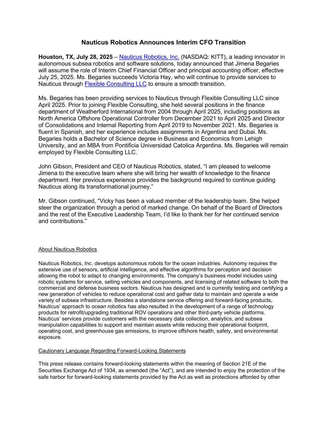 Nauticus Robotics Announces Interim CFO Transition Houston, TX, July 28, 2025 – Nauticus Robotics, Inc. (NASDAQ: KITT), a leading innovator in autonomous subsea robotics and software solutions, today announced that Jimena Begaries will assume the role of Interim Chief Financial Officer and principal accounting officer, effective July 25, 2025. Ms. Begaries succeeds Victoria Hay, who will continue to provide services to Nauticus through Flexible Consulting LLC to ensure a smooth transition. Ms. Begaries has been providing services to Nauticus through Flexible Consulting LLC since April 2025. Prior to joining Flexible Consulting, she held several positions in the finance department of Weatherford International from 2004 through April 2025, including positions as North America Offshore Operational Controller from December 2021 to April 2025 and Director of Consolidations and Internal Reporting from April 2019 to November 2021. Ms. Begaries is fluent in Spanish, and her experience includes assignments in Argentina and Dubai. Ms. Begaries holds a Bachelor of Science degree in Business and Economics from Lehigh University, and an MBA from Pontificia Universidad Catolica Argentina. Ms. Begaries will remain employed by Flexible Consulting LLC. John Gibson, President and CEO of Nauticus Robotics, stated, “I am pleased to welcome Jimena to the executive team where she will bring her wealth of knowledge to the finance department. Her previous experience provides the background required to continue guiding Nauticus along its transformational journey.” Mr. Gibson continued, “Vicky has been a valued member of the leadership team. She helped steer the organization through a period of marked change. On behalf of the Board of Directors and the rest of the Executive Leadership Team, I’d like to thank her for her continued service and contributions.” About Nauticus Robotics Nauticus Robotics, Inc. develops autonomous robots for the ocean industries. Autonomy requires the extensive use of sensors, artificial intelligence, and effective algorithms for perception and decision allowing the robot to adapt to changing environments. The company’s business model includes using robotic systems for service, selling vehicles and components, and licensing of related software to both the commercial and defense business sectors. Nauticus has designed and is currently testing and certifying a new generation of vehicles to reduce operational cost and gather data to maintain and operate a wide variety of subsea infrastructure. Besides a standalone service offering and forward-facing products, Nauticus’ approach to ocean robotics has also resulted in the development of a range of technology products for retrofit/upgrading traditional ROV operations and other third-party vehicle platforms. Nauticus’ services provide customers with the necessary data collection, analytics, and subsea manipulation capabilities to support and maintain assets while reducing their operational footprint, operating cost, and greenhouse gas emissions, to improve offshore health, safety, and environmental exposure. Cautionary Language Regarding Forward-Looking Statements This press release contains forward-looking statements within the meaning of Section 21E of the Securities Exchange Act of 1934, as amended (the “Act”), and are intended to enjoy the protection of the safe harbor for forward-looking statements provided by the Act as well as protections afforded by other