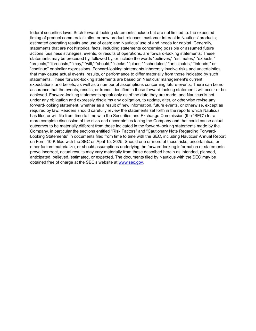 federal securities laws. Such forward-looking statements include but are not limited to: the expected timing of product commercialization or new product releases; customer interest in Nauticus’ products; estimated operating results and use of cash; and Nauticus’ use of and needs for capital. Generally, statements that are not historical facts, including statements concerning possible or assumed future actions, business strategies, events, or results of operations, are forward-looking statements. These statements may be preceded by, followed by, or include the words “believes,” “estimates,” “expects,” “projects,” “forecasts,” “may,” “will,” “should,” “seeks,” “plans,” “scheduled,” “anticipates,” “intends,” or “continue” or similar expressions. Forward-looking statements inherently involve risks and uncertainties that may cause actual events, results, or performance to differ materially from those indicated by such statements. These forward-looking statements are based on Nauticus’ management’s current expectations and beliefs, as well as a number of assumptions concerning future events. There can be no assurance that the events, results, or trends identified in these forward-looking statements will occur or be achieved. Forward-looking statements speak only as of the date they are made, and Nauticus is not under any obligation and expressly disclaims any obligation, to update, alter, or otherwise revise any forward-looking statement, whether as a result of new information, future events, or otherwise, except as required by law. Readers should carefully review the statements set forth in the reports which Nauticus has filed or will file from time to time with the Securities and Exchange Commission (the “SEC”) for a more complete discussion of the risks and uncertainties facing the Company and that could cause actual outcomes to be materially different from those indicated in the forward-looking statements made by the Company, in particular the sections entitled “Risk Factors” and “Cautionary Note Regarding Forward- Looking Statements” in documents filed from time to time with the SEC, including Nauticus’ Annual Report on Form 10-K filed with the SEC on April 15, 2025. Should one or more of these risks, uncertainties, or other factors materialize, or should assumptions underlying the forward-looking information or statements prove incorrect, actual results may vary materially from those described herein as intended, planned, anticipated, believed, estimated, or expected. The documents filed by Nauticus with the SEC may be obtained free of charge at the SEC’s website at www.sec.gov.