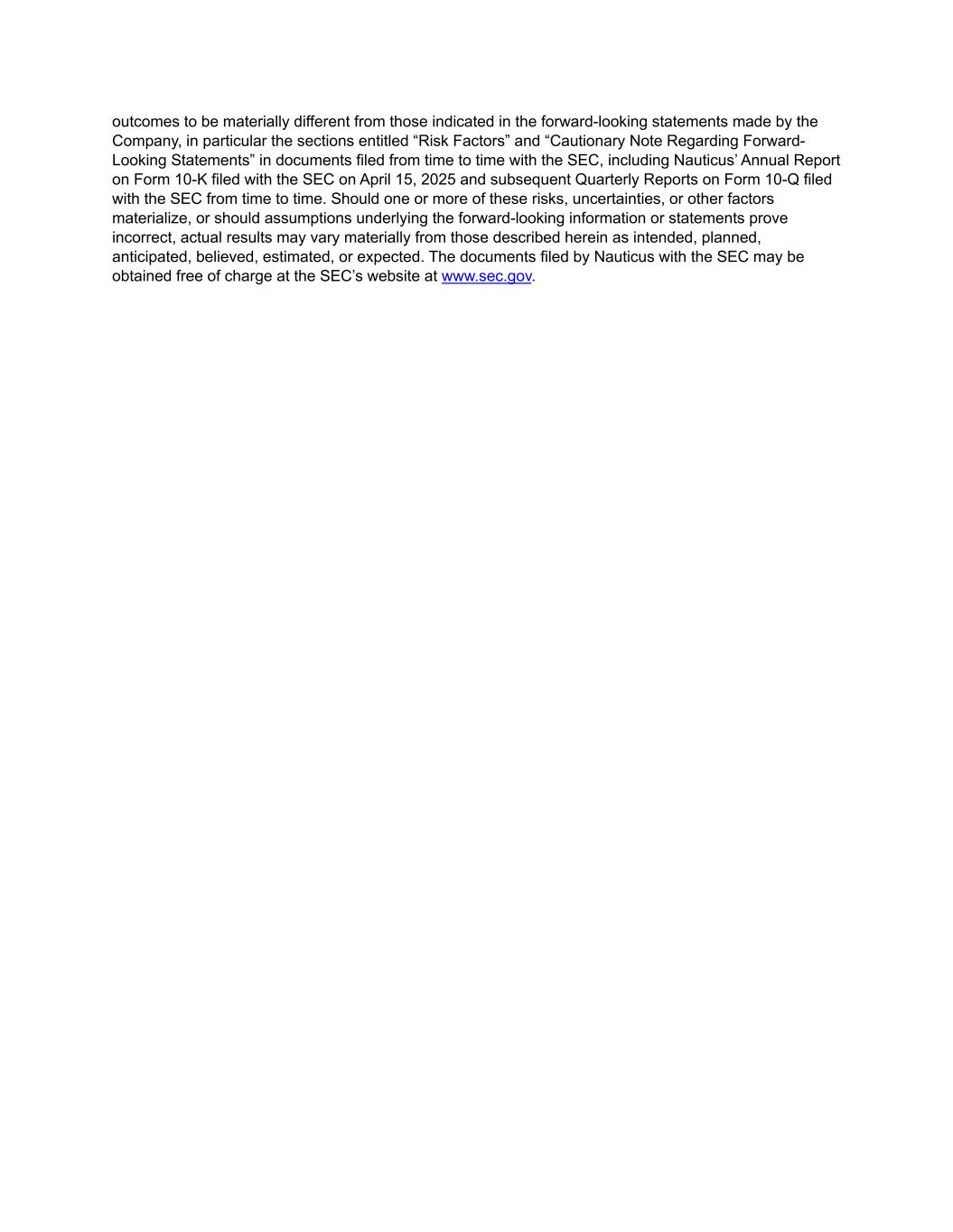 outcomes to be materially different from those indicated in the forward-looking statements made by the Company, in particular the sections entitled “Risk Factors” and “Cautionary Note Regarding Forward- Looking Statements” in documents filed from time to time with the SEC, including Nauticus’ Annual Report on Form 10-K filed with the SEC on April 15, 2025 and subsequent Quarterly Reports on Form 10-Q filed with the SEC from time to time. Should one or more of these risks, uncertainties, or other factors materialize, or should assumptions underlying the forward-looking information or statements prove incorrect, actual results may vary materially from those described herein as intended, planned, anticipated, believed, estimated, or expected. The documents filed by Nauticus with the SEC may be obtained free of charge at the SEC’s website at www.sec.gov.