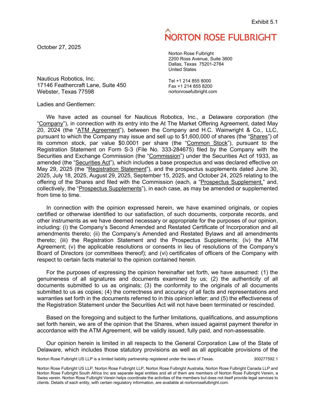 Exhibit 5.1 Norton Rose Fulbright US LLP is a limited liability partnership registered under the laws of Texas. 300277592.1 Norton Rose Fulbright US LLP, Norton Rose Fulbright LLP, Norton Rose Fulbright Australia, Norton Rose Fulbright Canada LLP and Norton Rose Fulbright South Africa Inc are separate legal entities and all of them are members of Norton Rose Fulbright Verein, a Swiss verein. Norton Rose Fulbright Verein helps coordinate the activities of the members but does not itself provide legal services to clients. Details of each entity, with certain regulatory information, are available at nortonrosefulbright.com. Norton Rose Fulbright 2200 Ross Avenue, Suite 3600 Dallas, Texas 75201-2784 United States Tel +1 214 855 8000 Fax +1 214 855 8200 nortonrosefulbright.com October 27, 2025 Nauticus Robotics, Inc. 17146 Feathercraft Lane, Suite 450 Webster, Texas 77598 Ladies and Gentlemen: We have acted as counsel for Nauticus Robotics, Inc., a Delaware corporation (the “Company”), in connection with its entry into the At The Market Offering Agreement, dated May 20, 2024 (the “ATM Agreement”), between the Company and H.C. Wainwright & Co., LLC, pursuant to which the Company may issue and sell up to $1,600,000 of shares (the “Shares”) of its common stock, par value $0.0001 per share (the “Common Stock”), pursuant to the Registration Statement on Form S-3 (File No. 333-284675) filed by the Company with the Securities and Exchange Commission (the “Commission”) under the Securities Act of 1933, as amended (the “Securities Act”), which includes a base prospectus and was declared effective on May 29, 2025 (the “Registration Statement”), and the prospectus supplements dated June 30, 2025, July 18, 2025, August 29, 2025, September 15, 2025, and October 24, 2025 relating to the offering of the Shares and filed with the Commission (each, a “Prospectus Supplement,” and, collectively, the “Prospectus Supplements”), in each case, as may be amended or supplemented from time to time. In connection with the opinion expressed herein, we have examined originals, or copies certified or otherwise identified to our satisfaction, of such documents, corporate records, and other instruments as we have deemed necessary or appropriate for the purposes of our opinion, including: (i) the Company’s Second Amended and Restated Certificate of Incorporation and all amendments thereto; (ii) the Company’s Amended and Restated Bylaws and all amendments thereto; (iii) the Registration Statement and the Prospectus Supplements; (iv) the ATM Agreement; (v) the applicable resolutions or consents in lieu of resolutions of the Company’s Board of Directors (or committees thereof); and (vi) certificates of officers of the Company with respect to certain facts material to the opinion contained herein. For the purposes of expressing the opinion hereinafter set forth, we have assumed: (1) the genuineness of all signatures and documents examined by us; (2) the authenticity of all documents submitted to us as originals; (3) the conformity to the originals of all documents submitted to us as copies; (4) the correctness and accuracy of all facts and representations and warranties set forth in the documents referred to in this opinion letter; and (5) the effectiveness of the Registration Statement under the Securities Act will not have been terminated or rescinded. Based on the foregoing and subject to the further limitations, qualifications, and assumptions set forth herein, we are of the opinion that the Shares, when issued against payment therefor in accordance with the ATM Agreement, will be validly issued, fully paid, and non-assessable. Our opinion herein is limited in all respects to the General Corporation Law of the State of Delaware, which includes those statutory provisions as well as all applicable provisions of the