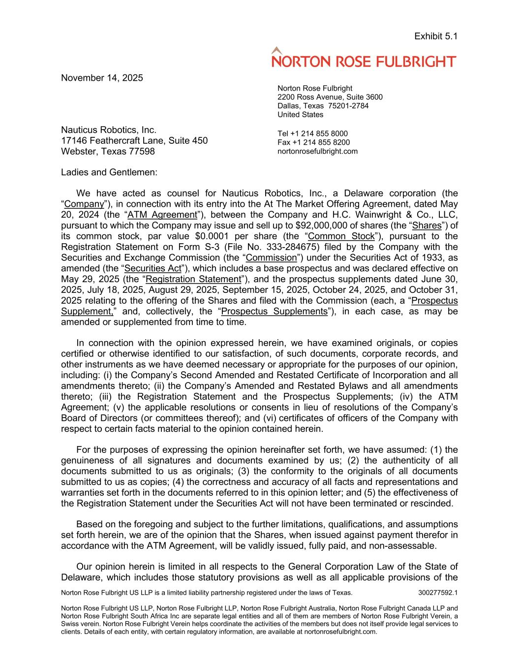 Exhibit 5.1 Norton Rose Fulbright US LLP is a limited liability partnership registered under the laws of Texas. 300277592.1 Norton Rose Fulbright US LLP, Norton Rose Fulbright LLP, Norton Rose Fulbright Australia, Norton Rose Fulbright Canada LLP and Norton Rose Fulbright South Africa Inc are separate legal entities and all of them are members of Norton Rose Fulbright Verein, a Swiss verein. Norton Rose Fulbright Verein helps coordinate the activities of the members but does not itself provide legal services to clients. Details of each entity, with certain regulatory information, are available at nortonrosefulbright.com. Norton Rose Fulbright 2200 Ross Avenue, Suite 3600 Dallas, Texas 75201-2784 United States Tel +1 214 855 8000 Fax +1 214 855 8200 nortonrosefulbright.com November 14, 2025 Nauticus Robotics, Inc. 17146 Feathercraft Lane, Suite 450 Webster, Texas 77598 Ladies and Gentlemen: We have acted as counsel for Nauticus Robotics, Inc., a Delaware corporation (the “Company”), in connection with its entry into the At The Market Offering Agreement, dated May 20, 2024 (the “ATM Agreement”), between the Company and H.C. Wainwright & Co., LLC, pursuant to which the Company may issue and sell up to $92,000,000 of shares (the “Shares”) of its common stock, par value $0.0001 per share (the “Common Stock”), pursuant to the Registration Statement on Form S-3 (File No. 333-284675) filed by the Company with the Securities and Exchange Commission (the “Commission”) under the Securities Act of 1933, as amended (the “Securities Act”), which includes a base prospectus and was declared effective on May 29, 2025 (the “Registration Statement”), and the prospectus supplements dated June 30, 2025, July 18, 2025, August 29, 2025, September 15, 2025, October 24, 2025, and October 31, 2025 relating to the offering of the Shares and filed with the Commission (each, a “Prospectus Supplement,” and, collectively, the “Prospectus Supplements”), in each case, as may be amended or supplemented from time to time. In connection with the opinion expressed herein, we have examined originals, or copies certified or otherwise identified to our satisfaction, of such documents, corporate records, and other instruments as we have deemed necessary or appropriate for the purposes of our opinion, including: (i) the Company’s Second Amended and Restated Certificate of Incorporation and all amendments thereto; (ii) the Company’s Amended and Restated Bylaws and all amendments thereto; (iii) the Registration Statement and the Prospectus Supplements; (iv) the ATM Agreement; (v) the applicable resolutions or consents in lieu of resolutions of the Company’s Board of Directors (or committees thereof); and (vi) certificates of officers of the Company with respect to certain facts material to the opinion contained herein. For the purposes of expressing the opinion hereinafter set forth, we have assumed: (1) the genuineness of all signatures and documents examined by us; (2) the authenticity of all documents submitted to us as originals; (3) the conformity to the originals of all documents submitted to us as copies; (4) the correctness and accuracy of all facts and representations and warranties set forth in the documents referred to in this opinion letter; and (5) the effectiveness of the Registration Statement under the Securities Act will not have been terminated or rescinded. Based on the foregoing and subject to the further limitations, qualifications, and assumptions set forth herein, we are of the opinion that the Shares, when issued against payment therefor in accordance with the ATM Agreement, will be validly issued, fully paid, and non-assessable. Our opinion herein is limited in all respects to the General Corporation Law of the State of Delaware, which includes those statutory provisions as well as all applicable provisions of the