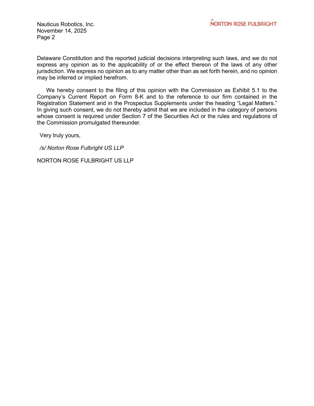 Nauticus Robotics, Inc. November 14, 2025 Page 2 Delaware Constitution and the reported judicial decisions interpreting such laws, and we do not express any opinion as to the applicability of or the effect thereon of the laws of any other jurisdiction. We express no opinion as to any matter other than as set forth herein, and no opinion may be inferred or implied herefrom. We hereby consent to the filing of this opinion with the Commission as Exhibit 5.1 to the Company’s Current Report on Form 8-K and to the reference to our firm contained in the Registration Statement and in the Prospectus Supplements under the heading “Legal Matters.” In giving such consent, we do not thereby admit that we are included in the category of persons whose consent is required under Section 7 of the Securities Act or the rules and regulations of the Commission promulgated thereunder. Very truly yours, /s/ Norton Rose Fulbright US LLP NORTON ROSE FULBRIGHT US LLP