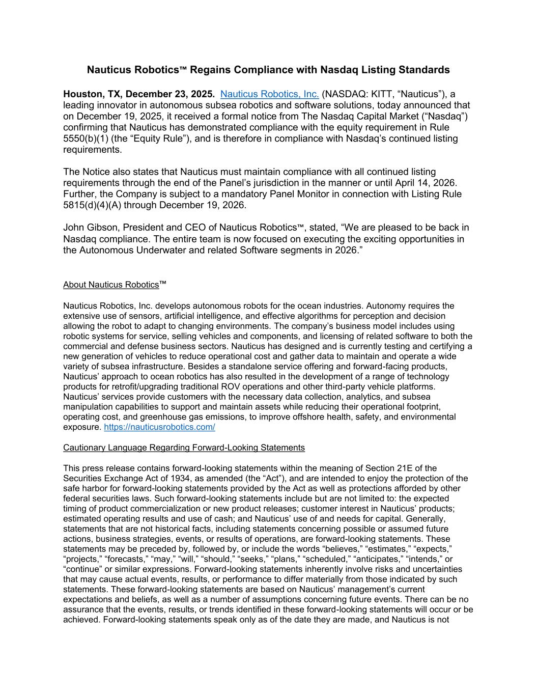 Nauticus Robotics™ Regains Compliance with Nasdaq Listing Standards Houston, TX, December 23, 2025. Nauticus Robotics, Inc. (NASDAQ: KITT, “Nauticus”), a leading innovator in autonomous subsea robotics and software solutions, today announced that on December 19, 2025, it received a formal notice from The Nasdaq Capital Market (“Nasdaq”) confirming that Nauticus has demonstrated compliance with the equity requirement in Rule 5550(b)(1) (the “Equity Rule”), and is therefore in compliance with Nasdaq’s continued listing requirements. The Notice also states that Nauticus must maintain compliance with all continued listing requirements through the end of the Panel’s jurisdiction in the manner or until April 14, 2026. Further, the Company is subject to a mandatory Panel Monitor in connection with Listing Rule 5815(d)(4)(A) through December 19, 2026. John Gibson, President and CEO of Nauticus Robotics™, stated, “We are pleased to be back in Nasdaq compliance. The entire team is now focused on executing the exciting opportunities in the Autonomous Underwater and related Software segments in 2026.” About Nauticus Robotics™ Nauticus Robotics, Inc. develops autonomous robots for the ocean industries. Autonomy requires the extensive use of sensors, artificial intelligence, and effective algorithms for perception and decision allowing the robot to adapt to changing environments. The company’s business model includes using robotic systems for service, selling vehicles and components, and licensing of related software to both the commercial and defense business sectors. Nauticus has designed and is currently testing and certifying a new generation of vehicles to reduce operational cost and gather data to maintain and operate a wide variety of subsea infrastructure. Besides a standalone service offering and forward-facing products, Nauticus’ approach to ocean robotics has also resulted in the development of a range of technology products for retrofit/upgrading traditional ROV operations and other third-party vehicle platforms. Nauticus’ services provide customers with the necessary data collection, analytics, and subsea manipulation capabilities to support and maintain assets while reducing their operational footprint, operating cost, and greenhouse gas emissions, to improve offshore health, safety, and environmental exposure. https://nauticusrobotics.com/ Cautionary Language Regarding Forward-Looking Statements This press release contains forward-looking statements within the meaning of Section 21E of the Securities Exchange Act of 1934, as amended (the “Act”), and are intended to enjoy the protection of the safe harbor for forward-looking statements provided by the Act as well as protections afforded by other federal securities laws. Such forward-looking statements include but are not limited to: the expected timing of product commercialization or new product releases; customer interest in Nauticus’ products; estimated operating results and use of cash; and Nauticus’ use of and needs for capital. Generally, statements that are not historical facts, including statements concerning possible or assumed future actions, business strategies, events, or results of operations, are forward-looking statements. These statements may be preceded by, followed by, or include the words “believes,” “estimates,” “expects,” “projects,” “forecasts,” “may,” “will,” “should,” “seeks,” “plans,” “scheduled,” “anticipates,” “intends,” or “continue” or similar expressions. Forward-looking statements inherently involve risks and uncertainties that may cause actual events, results, or performance to differ materially from those indicated by such statements. These forward-looking statements are based on Nauticus’ management’s current expectations and beliefs, as well as a number of assumptions concerning future events. There can be no assurance that the events, results, or trends identified in these forward-looking statements will occur or be achieved. Forward-looking statements speak only as of the date they are made, and Nauticus is not