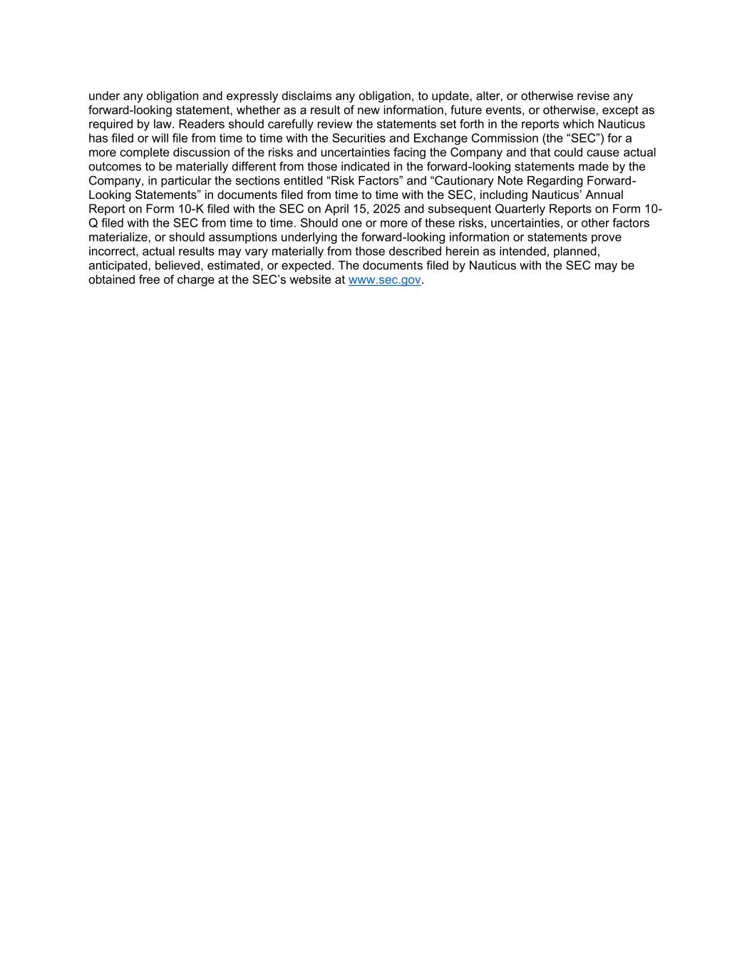 under any obligation and expressly disclaims any obligation, to update, alter, or otherwise revise any forward-looking statement, whether as a result of new information, future events, or otherwise, except as required by law. Readers should carefully review the statements set forth in the reports which Nauticus has filed or will file from time to time with the Securities and Exchange Commission (the “SEC”) for a more complete discussion of the risks and uncertainties facing the Company and that could cause actual outcomes to be materially different from those indicated in the forward-looking statements made by the Company, in particular the sections entitled “Risk Factors” and “Cautionary Note Regarding Forward- Looking Statements” in documents filed from time to time with the SEC, including Nauticus’ Annual Report on Form 10-K filed with the SEC on April 15, 2025 and subsequent Quarterly Reports on Form 10- Q filed with the SEC from time to time. Should one or more of these risks, uncertainties, or other factors materialize, or should assumptions underlying the forward-looking information or statements prove incorrect, actual results may vary materially from those described herein as intended, planned, anticipated, believed, estimated, or expected. The documents filed by Nauticus with the SEC may be obtained free of charge at the SEC’s website at www.sec.gov.