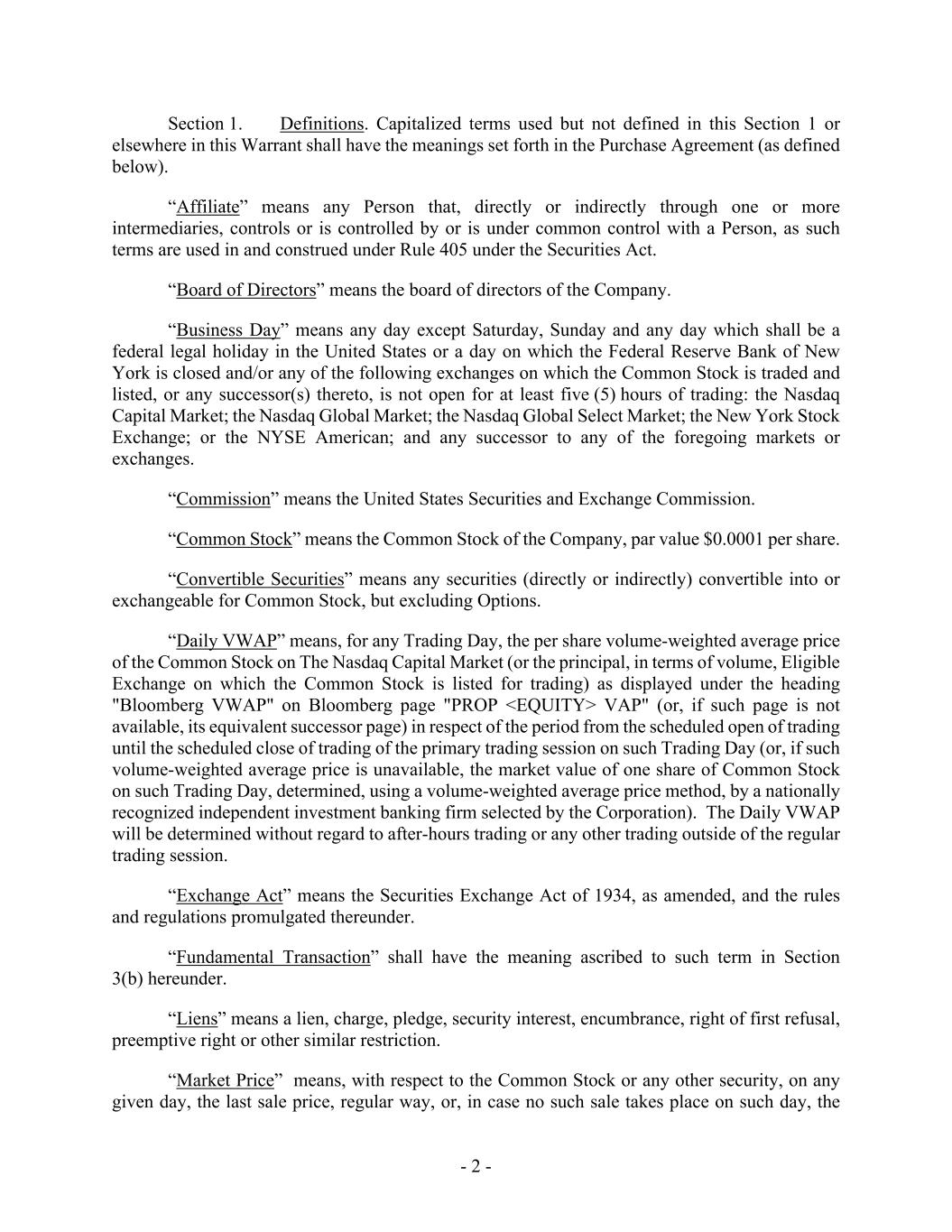 - 2 - Section 1. Definitions. Capitalized terms used but not defined in this Section 1 or elsewhere in this Warrant shall have the meanings set forth in the Purchase Agreement (as defined below). “Affiliate” means any Person that, directly or indirectly through one or more intermediaries, controls or is controlled by or is under common control with a Person, as such terms are used in and construed under Rule 405 under the Securities Act. “Board of Directors” means the board of directors of the Company. “Business Day” means any day except Saturday, Sunday and any day which shall be a federal legal holiday in the United States or a day on which the Federal Reserve Bank of New York is closed and/or any of the following exchanges on which the Common Stock is traded and listed, or any successor(s) thereto, is not open for at least five (5) hours of trading: the Nasdaq Capital Market; the Nasdaq Global Market; the Nasdaq Global Select Market; the New York Stock Exchange; or the NYSE American; and any successor to any of the foregoing markets or exchanges. “Commission” means the United States Securities and Exchange Commission. “Common Stock” means the Common Stock of the Company, par value $0.0001 per share. “Convertible Securities” means any securities (directly or indirectly) convertible into or exchangeable for Common Stock, but excluding Options. “Daily VWAP” means, for any Trading Day, the per share volume-weighted average price of the Common Stock on The Nasdaq Capital Market (or the principal, in terms of volume, Eligible Exchange on which the Common Stock is listed for trading) as displayed under the heading "Bloomberg VWAP" on Bloomberg page "PROP <EQUITY> VAP" (or, if such page is not available, its equivalent successor page) in respect of the period from the scheduled open of trading until the scheduled close of trading of the primary trading session on such Trading Day (or, if such volume-weighted average price is unavailable, the market value of one share of Common Stock on such Trading Day, determined, using a volume-weighted average price method, by a nationally recognized independent investment banking firm selected by the Corporation). The Daily VWAP will be determined without regard to after-hours trading or any other trading outside of the regular trading session. “Exchange Act” means the Securities Exchange Act of 1934, as amended, and the rules and regulations promulgated thereunder. “Fundamental Transaction” shall have the meaning ascribed to such term in Section 3(b) hereunder. “Liens” means a lien, charge, pledge, security interest, encumbrance, right of first refusal, preemptive right or other similar restriction. “Market Price” means, with respect to the Common Stock or any other security, on any given day, the last sale price, regular way, or, in case no such sale takes place on such day, the