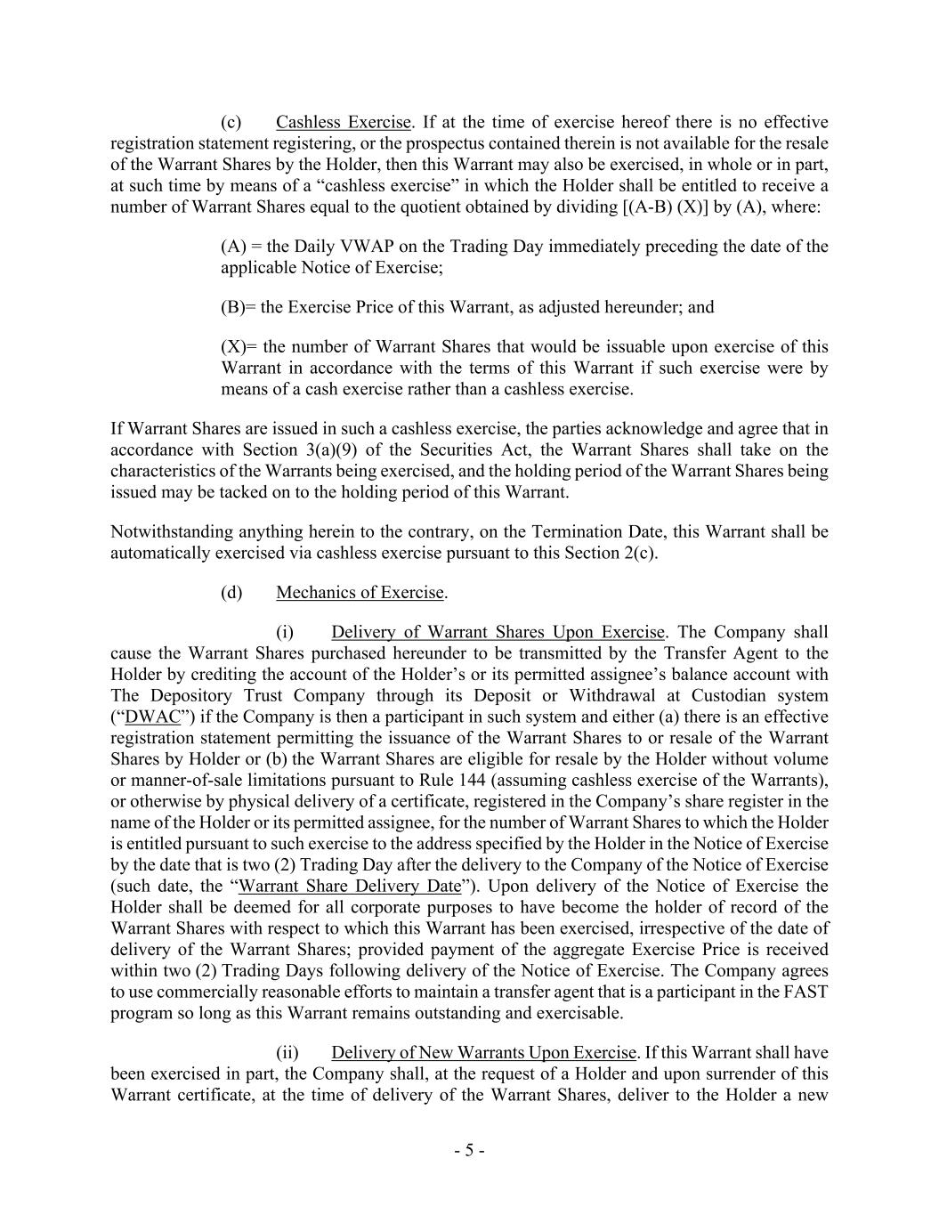 - 5 - (c) Cashless Exercise. If at the time of exercise hereof there is no effective registration statement registering, or the prospectus contained therein is not available for the resale of the Warrant Shares by the Holder, then this Warrant may also be exercised, in whole or in part, at such time by means of a “cashless exercise” in which the Holder shall be entitled to receive a number of Warrant Shares equal to the quotient obtained by dividing [(A-B) (X)] by (A), where: (A) = the Daily VWAP on the Trading Day immediately preceding the date of the applicable Notice of Exercise; (B)= the Exercise Price of this Warrant, as adjusted hereunder; and (X)= the number of Warrant Shares that would be issuable upon exercise of this Warrant in accordance with the terms of this Warrant if such exercise were by means of a cash exercise rather than a cashless exercise. If Warrant Shares are issued in such a cashless exercise, the parties acknowledge and agree that in accordance with Section 3(a)(9) of the Securities Act, the Warrant Shares shall take on the characteristics of the Warrants being exercised, and the holding period of the Warrant Shares being issued may be tacked on to the holding period of this Warrant. Notwithstanding anything herein to the contrary, on the Termination Date, this Warrant shall be automatically exercised via cashless exercise pursuant to this Section 2(c). (d) Mechanics of Exercise. (i) Delivery of Warrant Shares Upon Exercise. The Company shall cause the Warrant Shares purchased hereunder to be transmitted by the Transfer Agent to the Holder by crediting the account of the Holder’s or its permitted assignee’s balance account with The Depository Trust Company through its Deposit or Withdrawal at Custodian system (“DWAC”) if the Company is then a participant in such system and either (a) there is an effective registration statement permitting the issuance of the Warrant Shares to or resale of the Warrant Shares by Holder or (b) the Warrant Shares are eligible for resale by the Holder without volume or manner-of-sale limitations pursuant to Rule 144 (assuming cashless exercise of the Warrants), or otherwise by physical delivery of a certificate, registered in the Company’s share register in the name of the Holder or its permitted assignee, for the number of Warrant Shares to which the Holder is entitled pursuant to such exercise to the address specified by the Holder in the Notice of Exercise by the date that is two (2) Trading Day after the delivery to the Company of the Notice of Exercise (such date, the “Warrant Share Delivery Date”). Upon delivery of the Notice of Exercise the Holder shall be deemed for all corporate purposes to have become the holder of record of the Warrant Shares with respect to which this Warrant has been exercised, irrespective of the date of delivery of the Warrant Shares; provided payment of the aggregate Exercise Price is received within two (2) Trading Days following delivery of the Notice of Exercise. The Company agrees to use commercially reasonable efforts to maintain a transfer agent that is a participant in the FAST program so long as this Warrant remains outstanding and exercisable. (ii) Delivery of New Warrants Upon Exercise. If this Warrant shall have been exercised in part, the Company shall, at the request of a Holder and upon surrender of this Warrant certificate, at the time of delivery of the Warrant Shares, deliver to the Holder a new