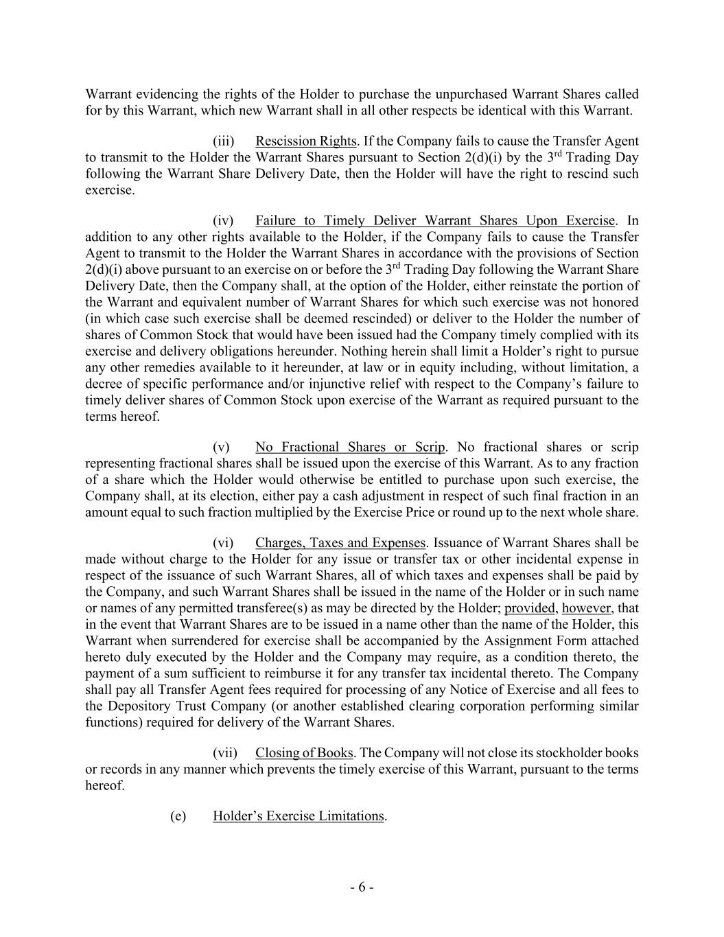 - 6 - Warrant evidencing the rights of the Holder to purchase the unpurchased Warrant Shares called for by this Warrant, which new Warrant shall in all other respects be identical with this Warrant. (iii) Rescission Rights. If the Company fails to cause the Transfer Agent to transmit to the Holder the Warrant Shares pursuant to Section 2(d)(i) by the 3rd Trading Day following the Warrant Share Delivery Date, then the Holder will have the right to rescind such exercise. (iv) Failure to Timely Deliver Warrant Shares Upon Exercise. In addition to any other rights available to the Holder, if the Company fails to cause the Transfer Agent to transmit to the Holder the Warrant Shares in accordance with the provisions of Section 2(d)(i) above pursuant to an exercise on or before the 3rd Trading Day following the Warrant Share Delivery Date, then the Company shall, at the option of the Holder, either reinstate the portion of the Warrant and equivalent number of Warrant Shares for which such exercise was not honored (in which case such exercise shall be deemed rescinded) or deliver to the Holder the number of shares of Common Stock that would have been issued had the Company timely complied with its exercise and delivery obligations hereunder. Nothing herein shall limit a Holder’s right to pursue any other remedies available to it hereunder, at law or in equity including, without limitation, a decree of specific performance and/or injunctive relief with respect to the Company’s failure to timely deliver shares of Common Stock upon exercise of the Warrant as required pursuant to the terms hereof. (v) No Fractional Shares or Scrip. No fractional shares or scrip representing fractional shares shall be issued upon the exercise of this Warrant. As to any fraction of a share which the Holder would otherwise be entitled to purchase upon such exercise, the Company shall, at its election, either pay a cash adjustment in respect of such final fraction in an amount equal to such fraction multiplied by the Exercise Price or round up to the next whole share. (vi) Charges, Taxes and Expenses. Issuance of Warrant Shares shall be made without charge to the Holder for any issue or transfer tax or other incidental expense in respect of the issuance of such Warrant Shares, all of which taxes and expenses shall be paid by the Company, and such Warrant Shares shall be issued in the name of the Holder or in such name or names of any permitted transferee(s) as may be directed by the Holder; provided, however, that in the event that Warrant Shares are to be issued in a name other than the name of the Holder, this Warrant when surrendered for exercise shall be accompanied by the Assignment Form attached hereto duly executed by the Holder and the Company may require, as a condition thereto, the payment of a sum sufficient to reimburse it for any transfer tax incidental thereto. The Company shall pay all Transfer Agent fees required for processing of any Notice of Exercise and all fees to the Depository Trust Company (or another established clearing corporation performing similar functions) required for delivery of the Warrant Shares. (vii) Closing of Books. The Company will not close its stockholder books or records in any manner which prevents the timely exercise of this Warrant, pursuant to the terms hereof. (e) Holder’s Exercise Limitations.