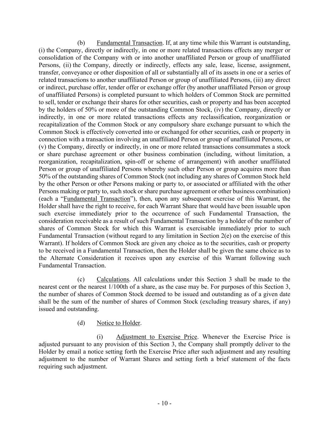 - 10 - (b) Fundamental Transaction. If, at any time while this Warrant is outstanding, (i) the Company, directly or indirectly, in one or more related transactions effects any merger or consolidation of the Company with or into another unaffiliated Person or group of unaffiliated Persons, (ii) the Company, directly or indirectly, effects any sale, lease, license, assignment, transfer, conveyance or other disposition of all or substantially all of its assets in one or a series of related transactions to another unaffiliated Person or group of unaffiliated Persons, (iii) any direct or indirect, purchase offer, tender offer or exchange offer (by another unaffiliated Person or group of unaffiliated Persons) is completed pursuant to which holders of Common Stock are permitted to sell, tender or exchange their shares for other securities, cash or property and has been accepted by the holders of 50% or more of the outstanding Common Stock, (iv) the Company, directly or indirectly, in one or more related transactions effects any reclassification, reorganization or recapitalization of the Common Stock or any compulsory share exchange pursuant to which the Common Stock is effectively converted into or exchanged for other securities, cash or property in connection with a transaction involving an unaffiliated Person or group of unaffiliated Persons, or (v) the Company, directly or indirectly, in one or more related transactions consummates a stock or share purchase agreement or other business combination (including, without limitation, a reorganization, recapitalization, spin-off or scheme of arrangement) with another unaffiliated Person or group of unaffiliated Persons whereby such other Person or group acquires more than 50% of the outstanding shares of Common Stock (not including any shares of Common Stock held by the other Person or other Persons making or party to, or associated or affiliated with the other Persons making or party to, such stock or share purchase agreement or other business combination) (each a “Fundamental Transaction”), then, upon any subsequent exercise of this Warrant, the Holder shall have the right to receive, for each Warrant Share that would have been issuable upon such exercise immediately prior to the occurrence of such Fundamental Transaction, the consideration receivable as a result of such Fundamental Transaction by a holder of the number of shares of Common Stock for which this Warrant is exercisable immediately prior to such Fundamental Transaction (without regard to any limitation in Section 2(e) on the exercise of this Warrant). If holders of Common Stock are given any choice as to the securities, cash or property to be received in a Fundamental Transaction, then the Holder shall be given the same choice as to the Alternate Consideration it receives upon any exercise of this Warrant following such Fundamental Transaction. (c) Calculations. All calculations under this Section 3 shall be made to the nearest cent or the nearest 1/100th of a share, as the case may be. For purposes of this Section 3, the number of shares of Common Stock deemed to be issued and outstanding as of a given date shall be the sum of the number of shares of Common Stock (excluding treasury shares, if any) issued and outstanding. (d) Notice to Holder. (i) Adjustment to Exercise Price. Whenever the Exercise Price is adjusted pursuant to any provision of this Section 3, the Company shall promptly deliver to the Holder by email a notice setting forth the Exercise Price after such adjustment and any resulting adjustment to the number of Warrant Shares and setting forth a brief statement of the facts requiring such adjustment.