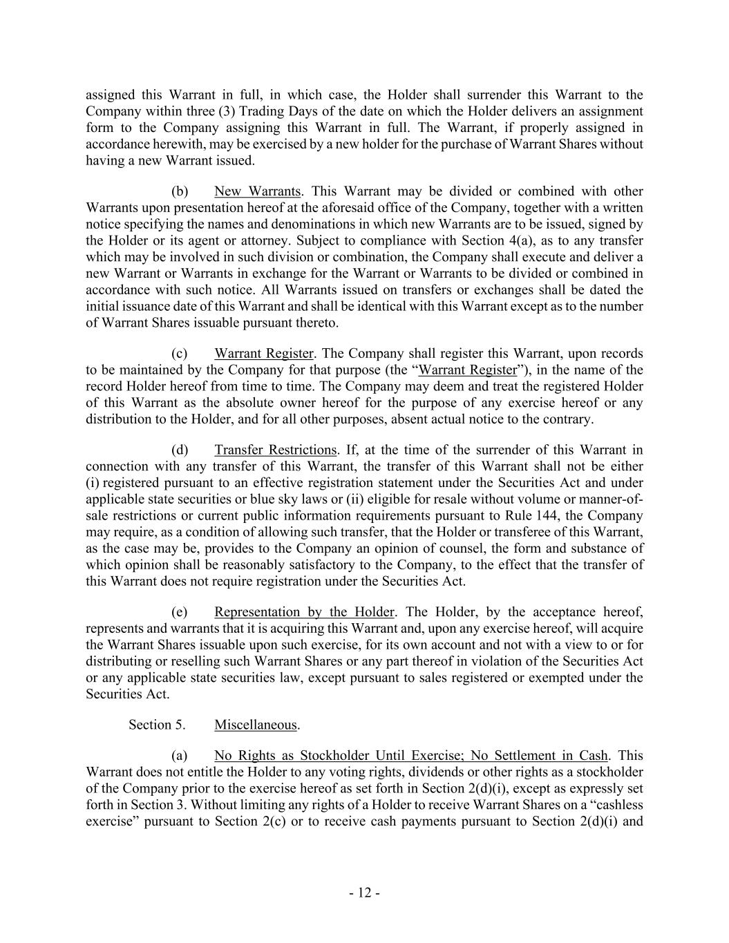 - 12 - assigned this Warrant in full, in which case, the Holder shall surrender this Warrant to the Company within three (3) Trading Days of the date on which the Holder delivers an assignment form to the Company assigning this Warrant in full. The Warrant, if properly assigned in accordance herewith, may be exercised by a new holder for the purchase of Warrant Shares without having a new Warrant issued. (b) New Warrants. This Warrant may be divided or combined with other Warrants upon presentation hereof at the aforesaid office of the Company, together with a written notice specifying the names and denominations in which new Warrants are to be issued, signed by the Holder or its agent or attorney. Subject to compliance with Section 4(a), as to any transfer which may be involved in such division or combination, the Company shall execute and deliver a new Warrant or Warrants in exchange for the Warrant or Warrants to be divided or combined in accordance with such notice. All Warrants issued on transfers or exchanges shall be dated the initial issuance date of this Warrant and shall be identical with this Warrant except as to the number of Warrant Shares issuable pursuant thereto. (c) Warrant Register. The Company shall register this Warrant, upon records to be maintained by the Company for that purpose (the “Warrant Register”), in the name of the record Holder hereof from time to time. The Company may deem and treat the registered Holder of this Warrant as the absolute owner hereof for the purpose of any exercise hereof or any distribution to the Holder, and for all other purposes, absent actual notice to the contrary. (d) Transfer Restrictions. If, at the time of the surrender of this Warrant in connection with any transfer of this Warrant, the transfer of this Warrant shall not be either (i) registered pursuant to an effective registration statement under the Securities Act and under applicable state securities or blue sky laws or (ii) eligible for resale without volume or manner-of- sale restrictions or current public information requirements pursuant to Rule 144, the Company may require, as a condition of allowing such transfer, that the Holder or transferee of this Warrant, as the case may be, provides to the Company an opinion of counsel, the form and substance of which opinion shall be reasonably satisfactory to the Company, to the effect that the transfer of this Warrant does not require registration under the Securities Act. (e) Representation by the Holder. The Holder, by the acceptance hereof, represents and warrants that it is acquiring this Warrant and, upon any exercise hereof, will acquire the Warrant Shares issuable upon such exercise, for its own account and not with a view to or for distributing or reselling such Warrant Shares or any part thereof in violation of the Securities Act or any applicable state securities law, except pursuant to sales registered or exempted under the Securities Act. Section 5. Miscellaneous. (a) No Rights as Stockholder Until Exercise; No Settlement in Cash. This Warrant does not entitle the Holder to any voting rights, dividends or other rights as a stockholder of the Company prior to the exercise hereof as set forth in Section 2(d)(i), except as expressly set forth in Section 3. Without limiting any rights of a Holder to receive Warrant Shares on a “cashless exercise” pursuant to Section 2(c) or to receive cash payments pursuant to Section 2(d)(i) and