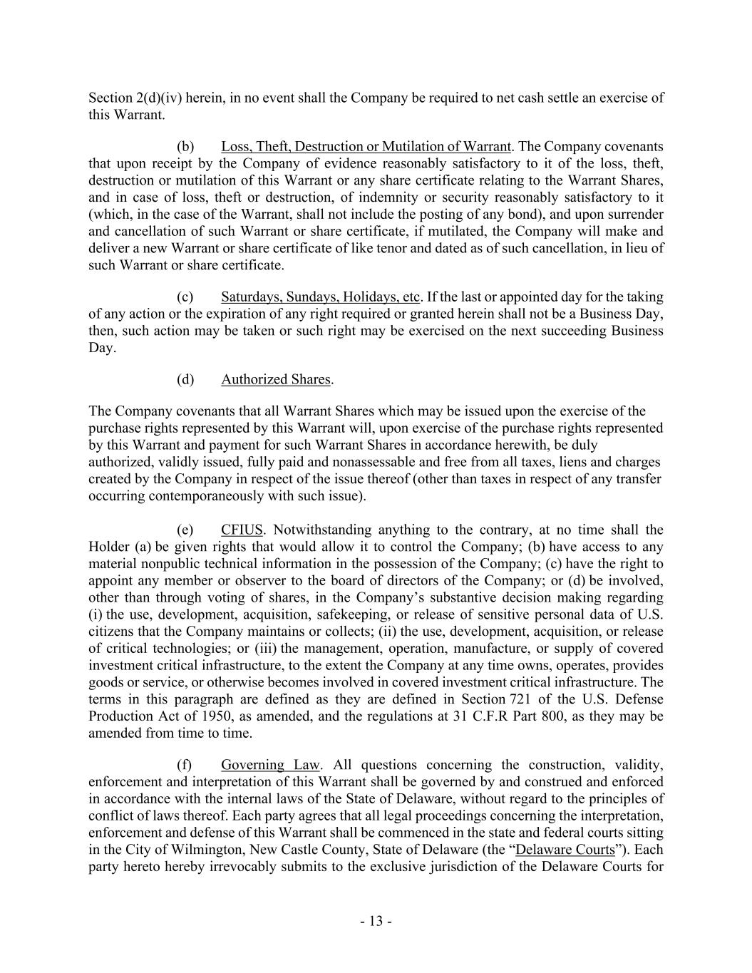 - 13 - Section 2(d)(iv) herein, in no event shall the Company be required to net cash settle an exercise of this Warrant. (b) Loss, Theft, Destruction or Mutilation of Warrant. The Company covenants that upon receipt by the Company of evidence reasonably satisfactory to it of the loss, theft, destruction or mutilation of this Warrant or any share certificate relating to the Warrant Shares, and in case of loss, theft or destruction, of indemnity or security reasonably satisfactory to it (which, in the case of the Warrant, shall not include the posting of any bond), and upon surrender and cancellation of such Warrant or share certificate, if mutilated, the Company will make and deliver a new Warrant or share certificate of like tenor and dated as of such cancellation, in lieu of such Warrant or share certificate. (c) Saturdays, Sundays, Holidays, etc. If the last or appointed day for the taking of any action or the expiration of any right required or granted herein shall not be a Business Day, then, such action may be taken or such right may be exercised on the next succeeding Business Day. (d) Authorized Shares. The Company covenants that all Warrant Shares which may be issued upon the exercise of the purchase rights represented by this Warrant will, upon exercise of the purchase rights represented by this Warrant and payment for such Warrant Shares in accordance herewith, be duly authorized, validly issued, fully paid and nonassessable and free from all taxes, liens and charges created by the Company in respect of the issue thereof (other than taxes in respect of any transfer occurring contemporaneously with such issue). (e) CFIUS. Notwithstanding anything to the contrary, at no time shall the Holder (a) be given rights that would allow it to control the Company; (b) have access to any material nonpublic technical information in the possession of the Company; (c) have the right to appoint any member or observer to the board of directors of the Company; or (d) be involved, other than through voting of shares, in the Company’s substantive decision making regarding (i) the use, development, acquisition, safekeeping, or release of sensitive personal data of U.S. citizens that the Company maintains or collects; (ii) the use, development, acquisition, or release of critical technologies; or (iii) the management, operation, manufacture, or supply of covered investment critical infrastructure, to the extent the Company at any time owns, operates, provides goods or service, or otherwise becomes involved in covered investment critical infrastructure. The terms in this paragraph are defined as they are defined in Section 721 of the U.S. Defense Production Act of 1950, as amended, and the regulations at 31 C.F.R Part 800, as they may be amended from time to time. (f) Governing Law. All questions concerning the construction, validity, enforcement and interpretation of this Warrant shall be governed by and construed and enforced in accordance with the internal laws of the State of Delaware, without regard to the principles of conflict of laws thereof. Each party agrees that all legal proceedings concerning the interpretation, enforcement and defense of this Warrant shall be commenced in the state and federal courts sitting in the City of Wilmington, New Castle County, State of Delaware (the “Delaware Courts”). Each party hereto hereby irrevocably submits to the exclusive jurisdiction of the Delaware Courts for
